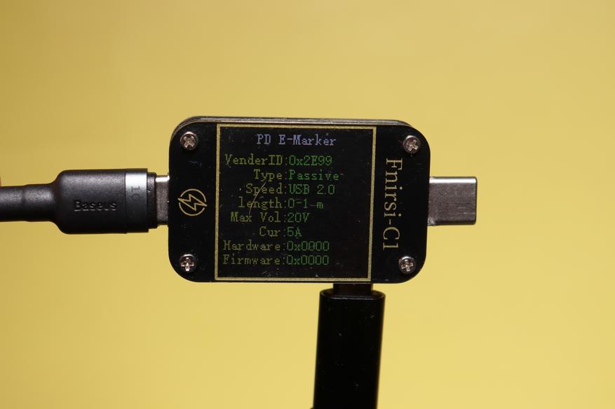 Для начала, используя тестеры FNIRSI C1 и FNB48 проведена проверка Е-marker, в котором находится информация об кабеле и проведено сравнение с реальными параметрами кабеля.