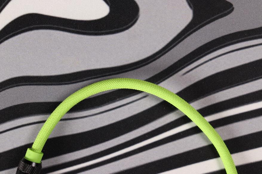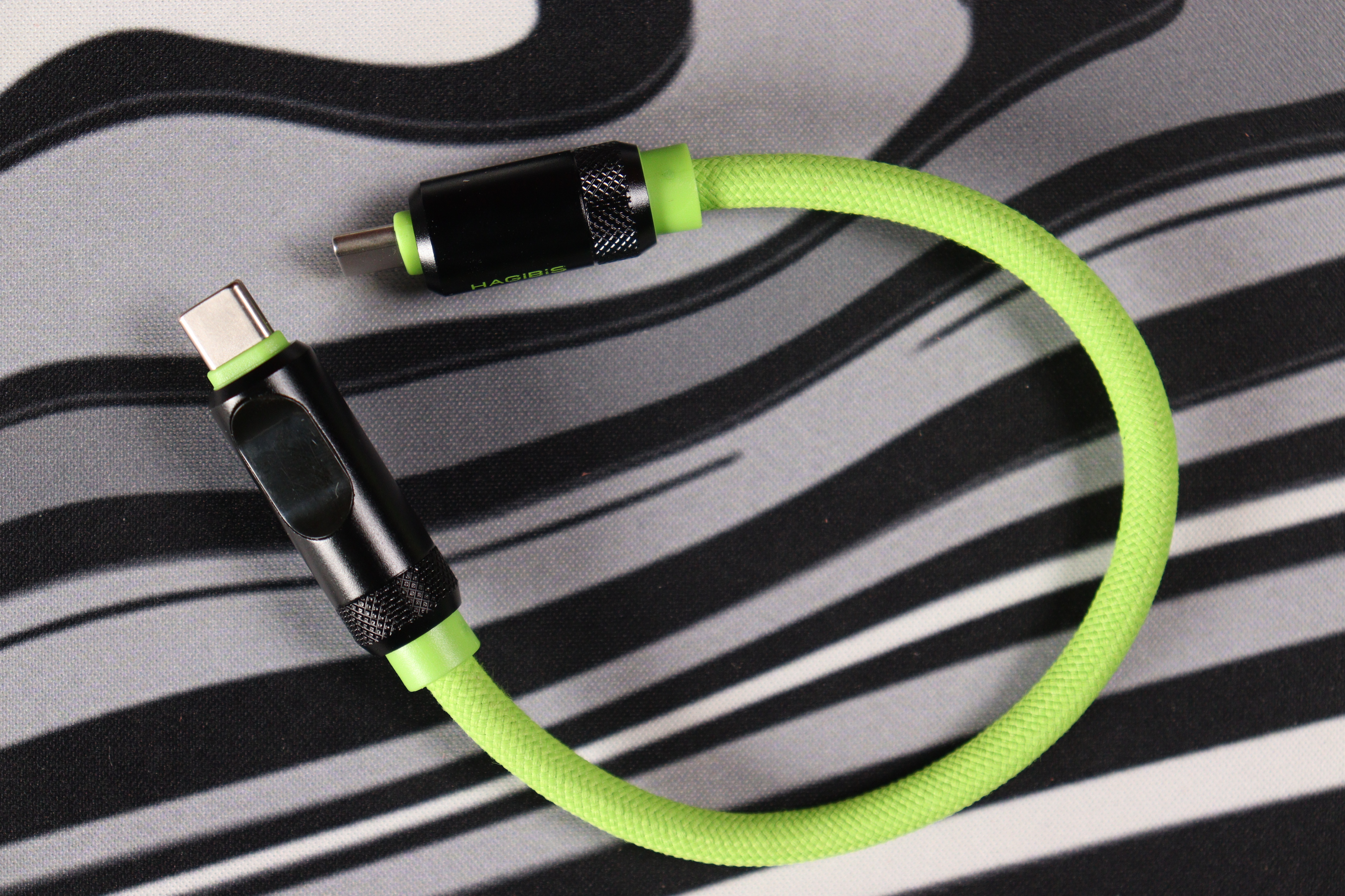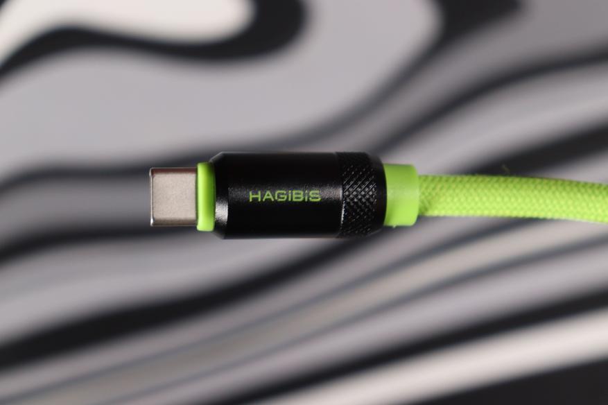 Кабель Hagibis SX02 представляет собой яркую модель с характерной неоново-зеленой оплеткой. Коннекторы изготовлены из черного алюминиевого сплава с рифленой текстурой для лучшего захвата, а яркие зеленые силиконовые кольца добавляют контраста и служат дополнительной защитой в местах изгиба. На одном из коннекторов четко виден логотип HAGIBIS, выполненный в том же зеленом цвете. Оплетка кабеля имеет плотную текстуру и выглядит достаточно прочной, а общая длина в 25 см делает его действительно компактным решением для близких подключений. Сам кабель очень послушный и сделан качественно. Масса его — 20 грамм