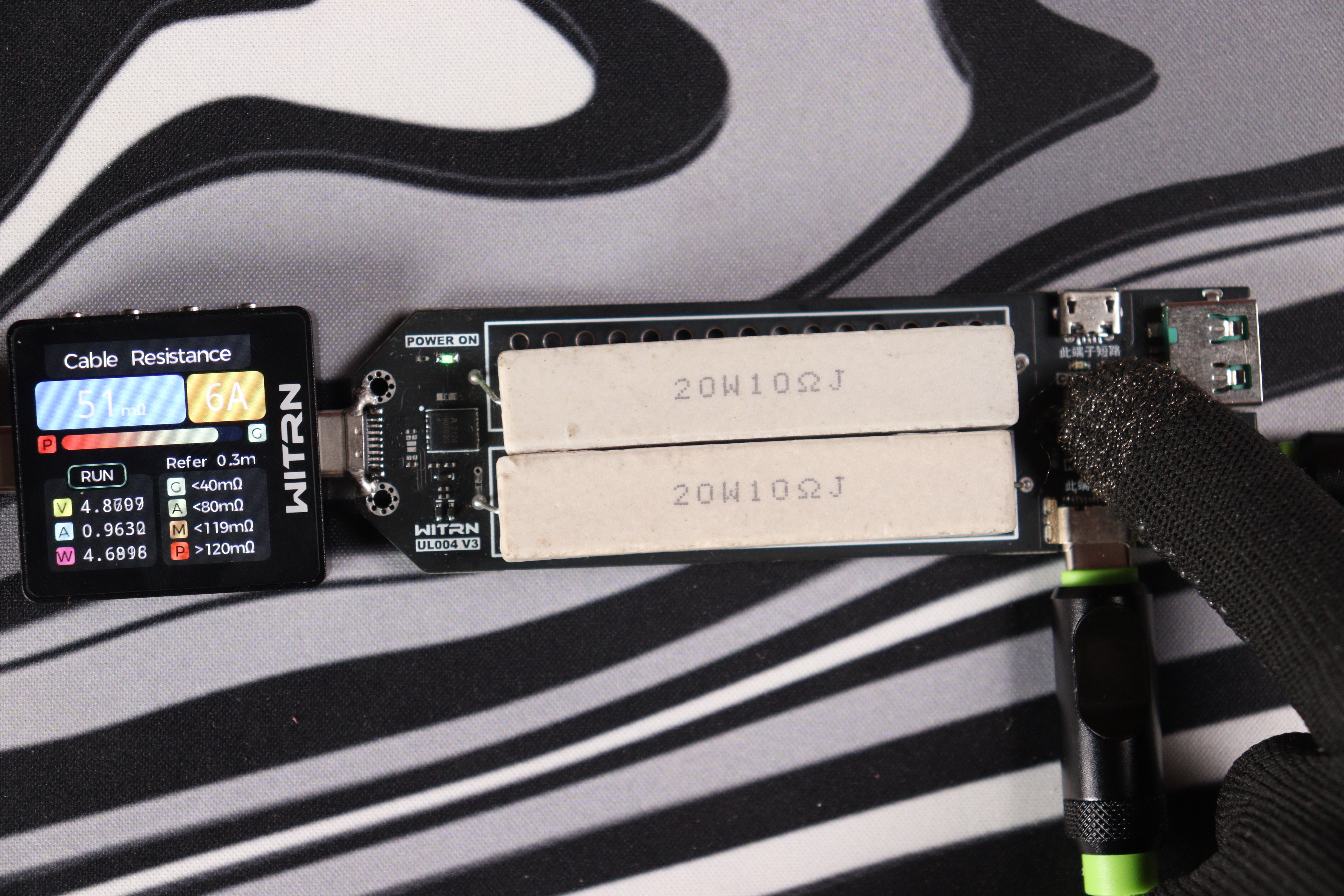 Тестирование внутреннего сопротивления выявило хорошие показатели — всего 51 миллиом. Подобные параметры обеспечивают незначительные энергопотери в процессе использования кабеля.