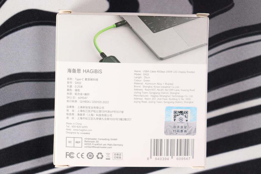 Кабель Hagibis SX02 поставляется в минималистичной белой упаковке с яркими акцентами — на лицевой стороне изображен сам кабель в характерном зеленом цвете с LED-дисплеем. Упаковка четко указывает ключевые характеристики, подчеркивая современный интерфейс и встроенный дисплей. С противоположной стороны представлена подробная информация о характеристиках продукта.
