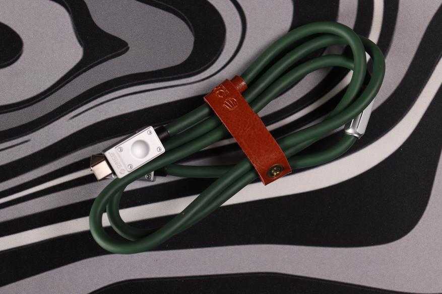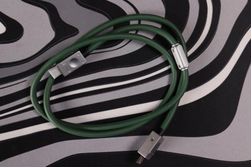 Первое впечатление от ORICO 240B2-40 — металлические коннекторы с фактурной поверхностью. Разъёмы изготовлены из алюминиевого сплава с углублением под палец, которая предотвращает соскальзывание при подсоединении. Боковая панель содержит лазерную гравировку технических параметров — 240W и 40Gbps. Переходные зоны между штекерами и основным проводником защищены эластичным пластиком, сделанным под резину. Это разумное решение — именно в этих местах обычно происходят поломки. Но главная особенность модели — исключительно мягкая силиконовая оболочка насыщенного зелёного оттенка. Материал приятен на ощупь и значительно превосходит по комфорту большинство альтернатив.