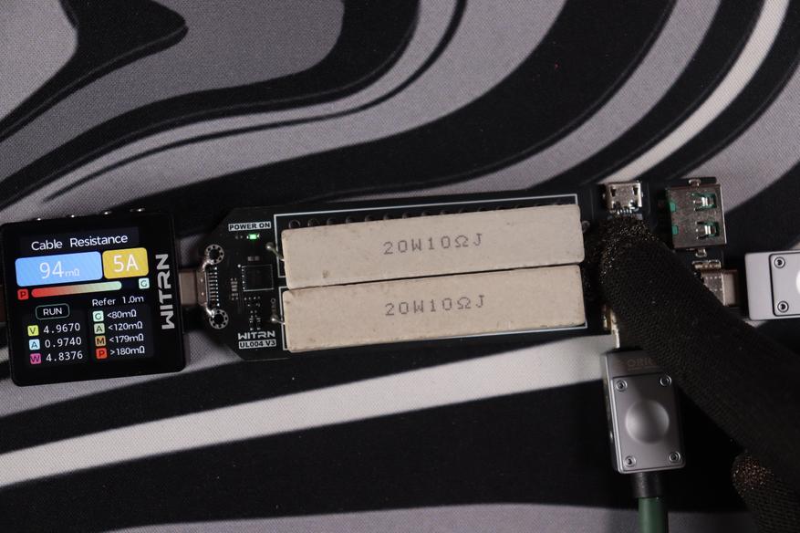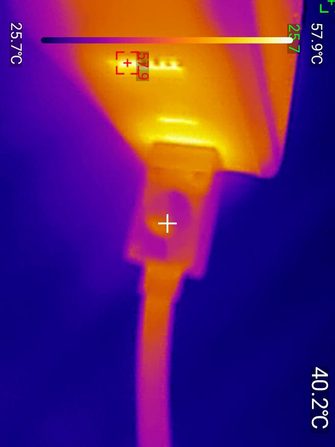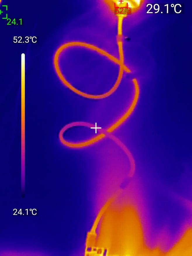 В области энергоснабжения 240B2-40 уверенно работал с нагрузкой до 138 Вт, корректно распознавая различные режимы Power Delivery. Продолжительное тестирование под максимальной нагрузкой показало отсутствие критического перегрева. Штекеры нагревались в пределах нормы, силиконовая оболочка оставалась едва тёплой. Термические замеры проводились тепловизором UNI-T UTI261M после часа работы на предельной мощности.