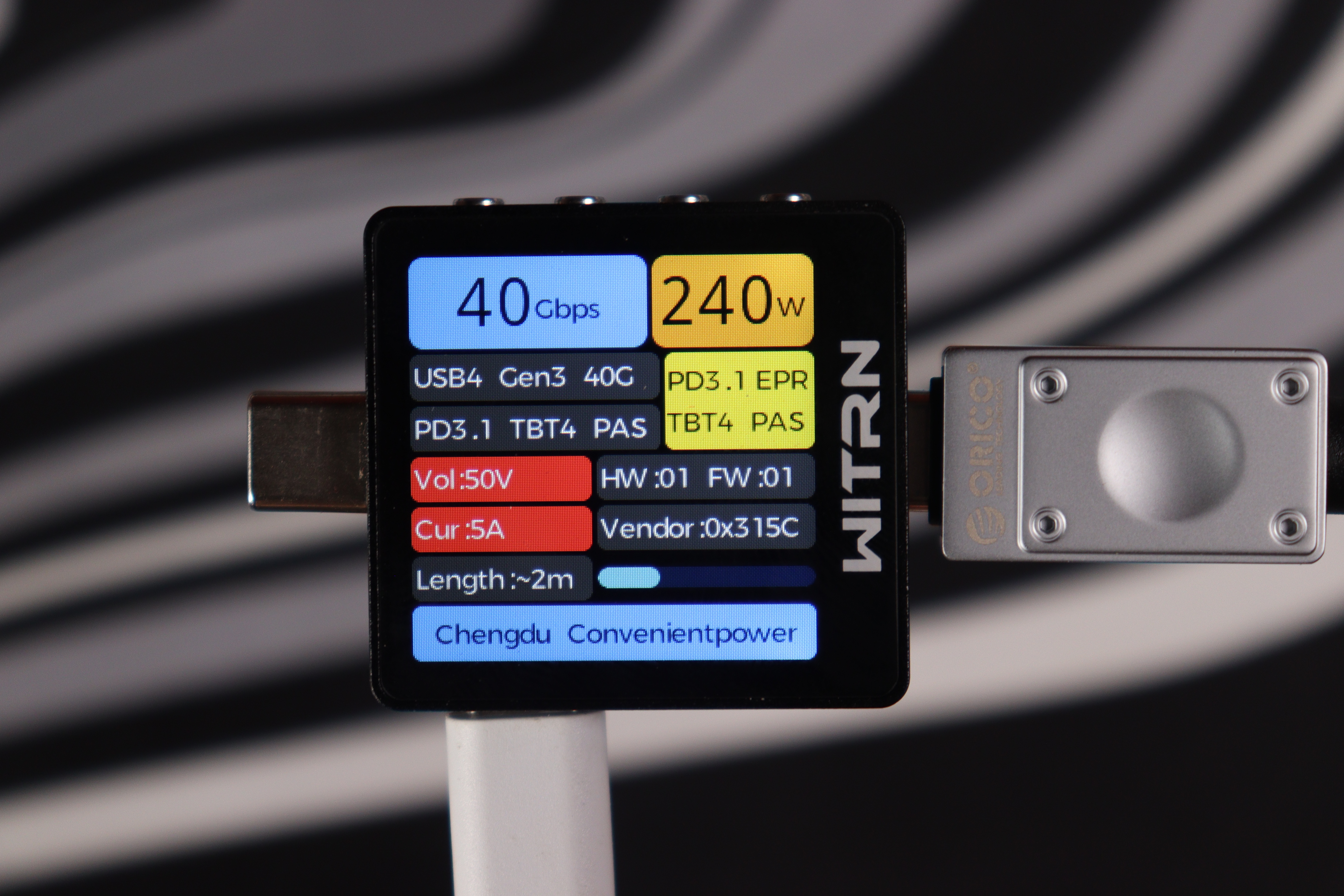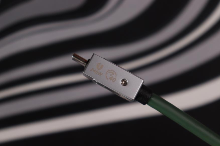 Функциональность USB4, как и Thunderbolt4 подтверждена через встроенную метку в кабеле, так и мощность передачи в 240Вт.