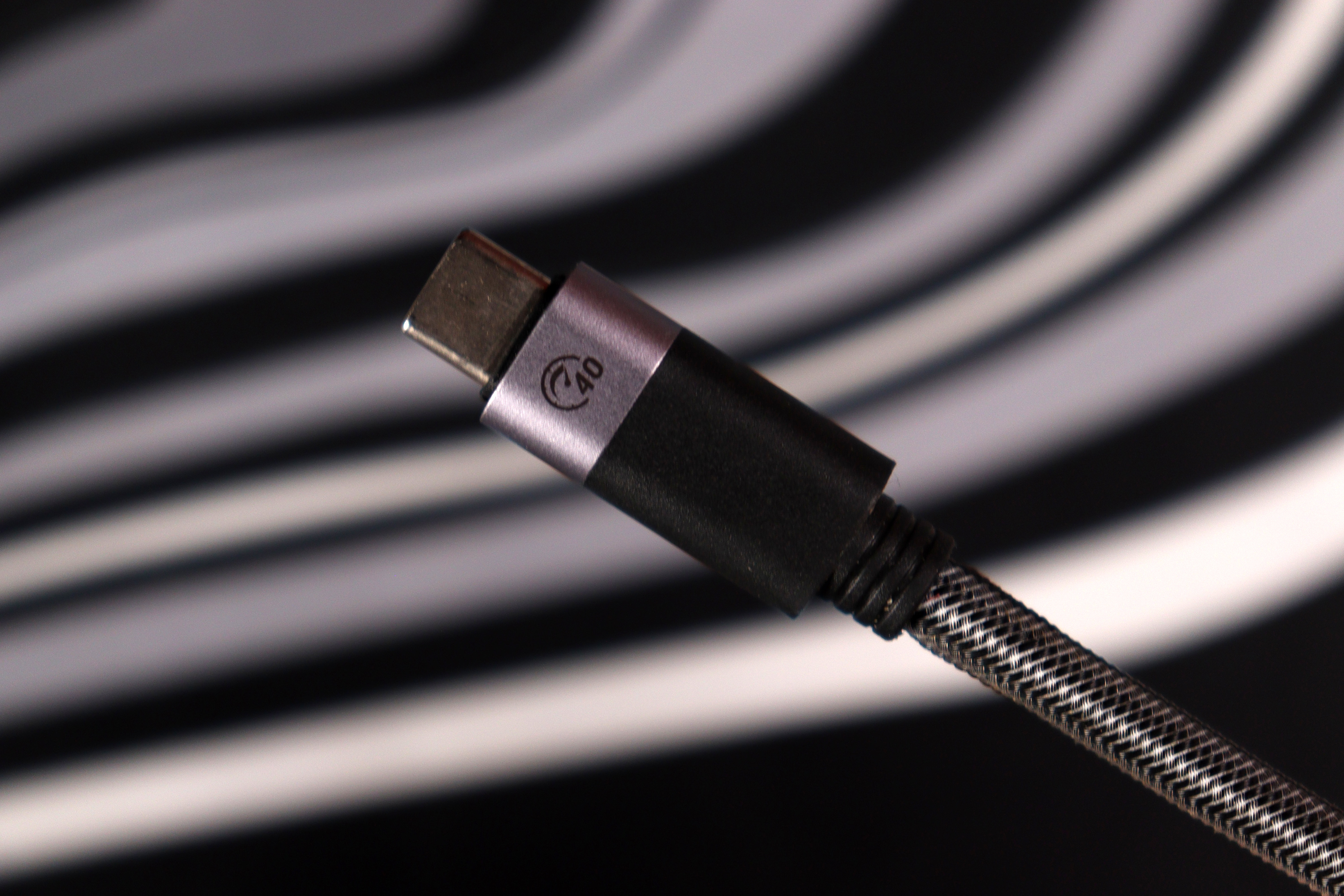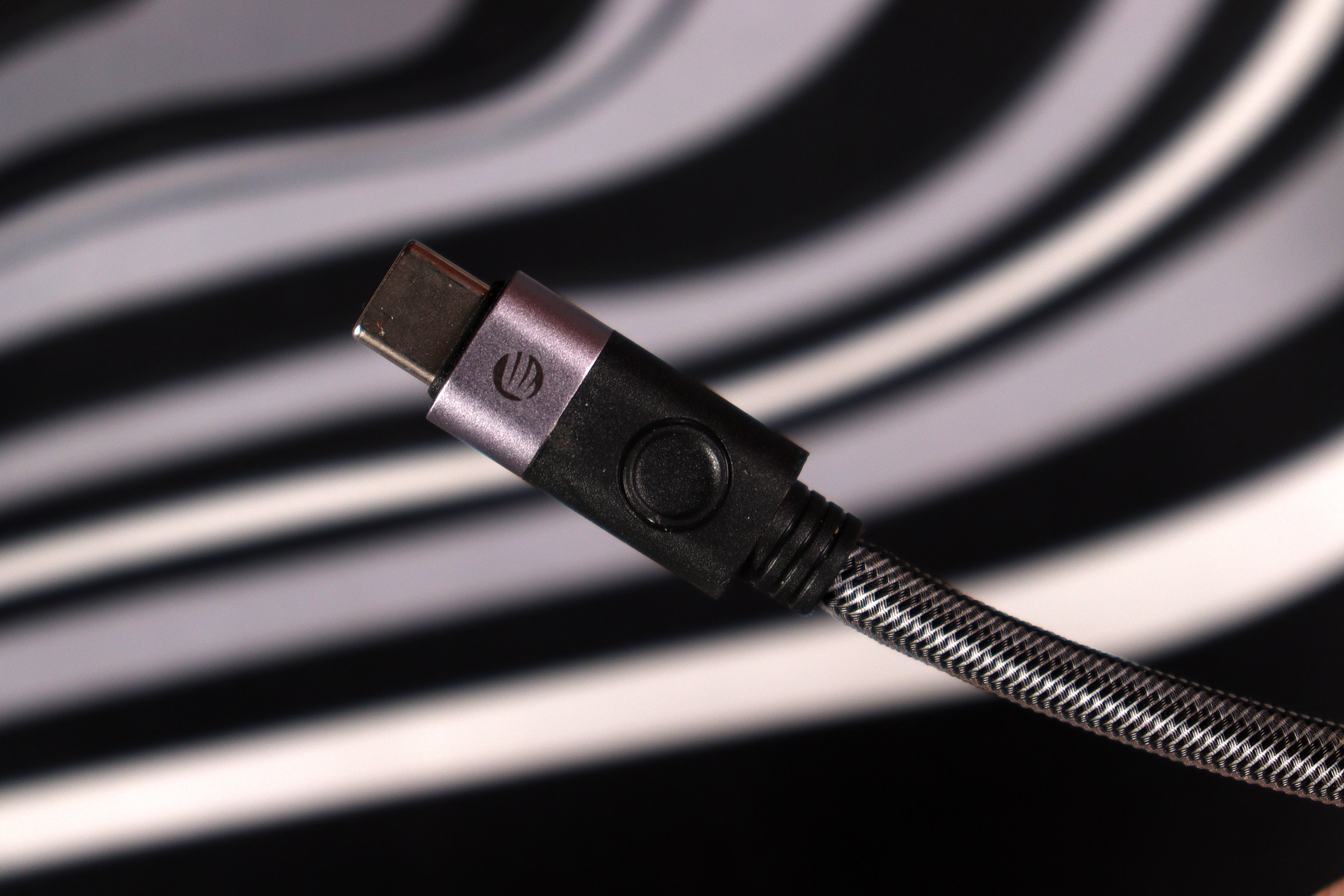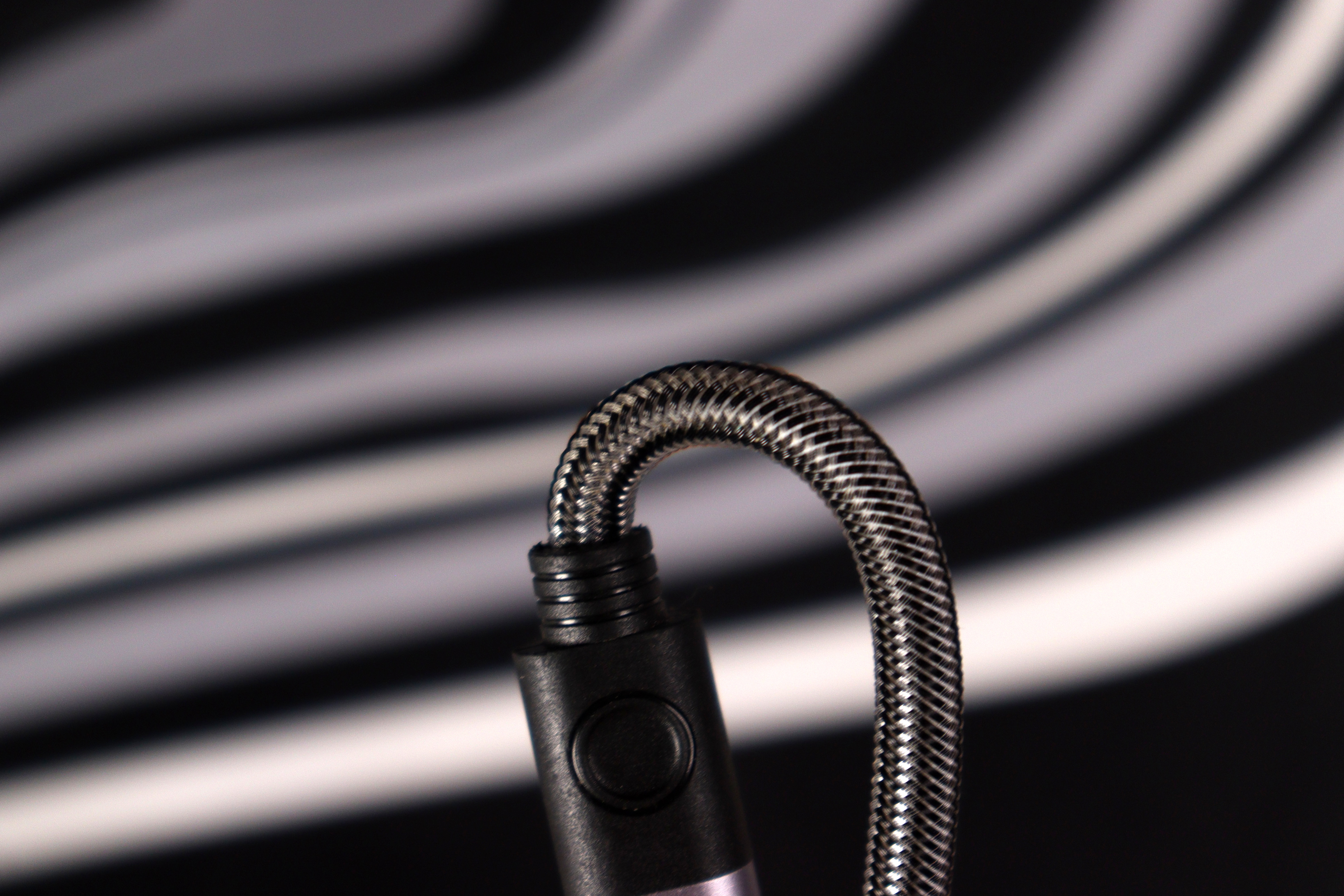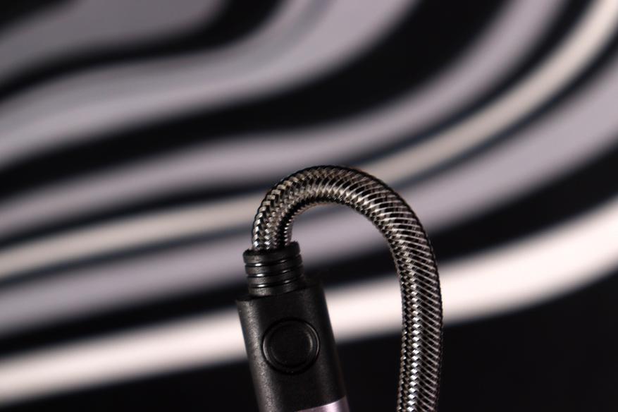 Сами коннекторы довольно компактные, а переход к проводу защищён гибкими вставками чёрного цвета, которые должны предотвратить перелом провода в критичных местах. Оплётка выполнена из плотного нейлона в серо-чёрную клетку. Выглядит добротно, напоминает дорогие аудиокабели. На ощупь довольно жёсткая — кабель хорошо держит форму и не путается, но остается слегка дубовым.