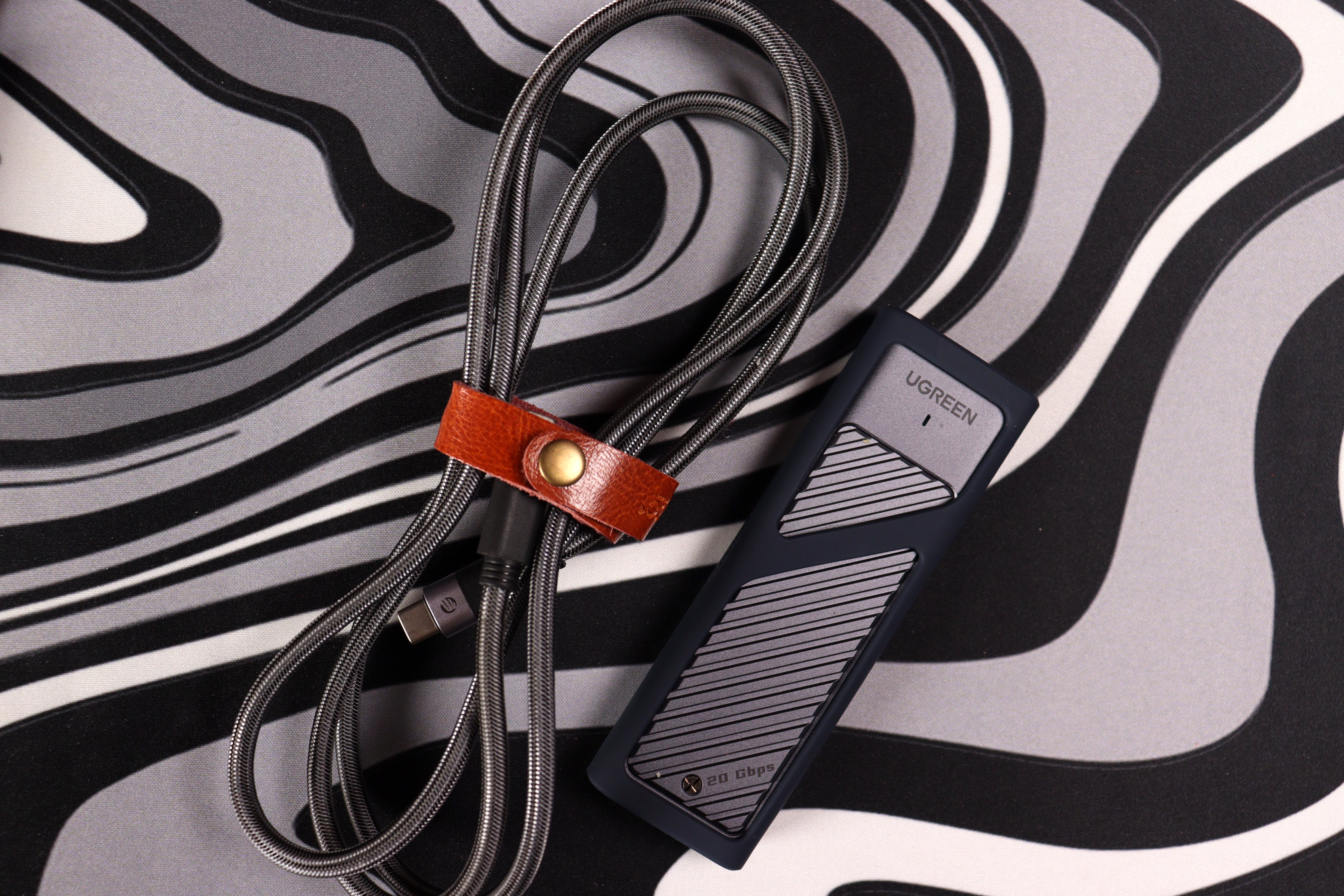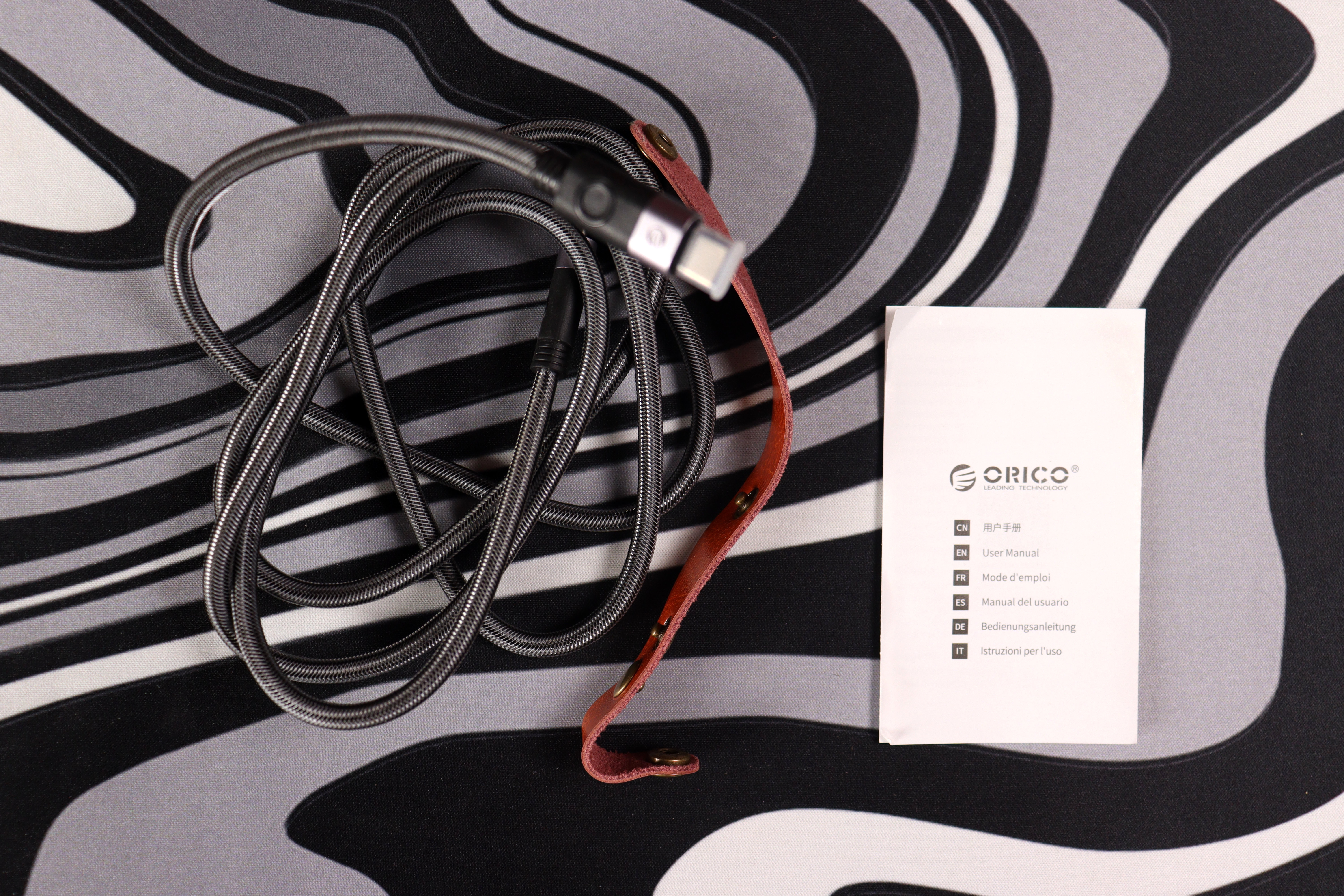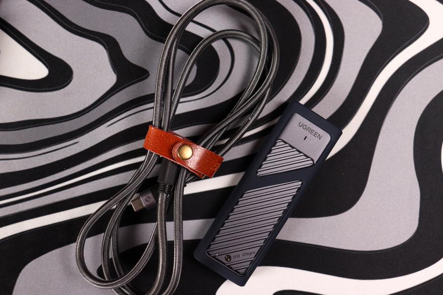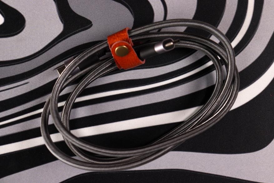 На внешней упаковке крупно представлены главные характеристики — поддержка 240W и скорость высокную способность. В комплекте только шнур и кожаный фиксатор для организации и минимум документации.