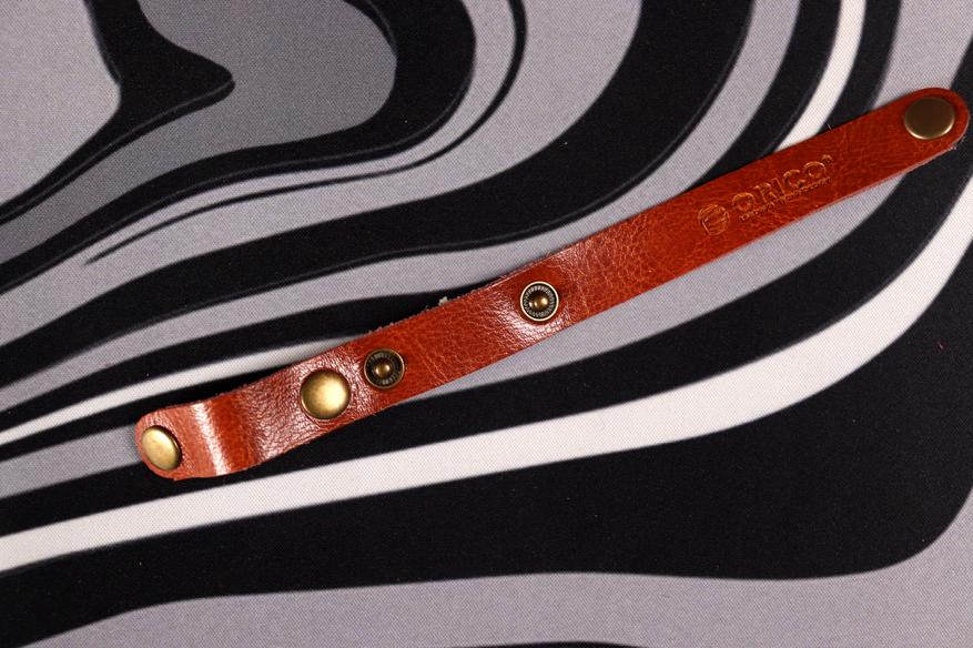 Особо стоит отметить стяжку — она сделана из экокожи оранжевого цвета с металлическими кнопками и реально удобна в использовании — можно регулировать размер петли.