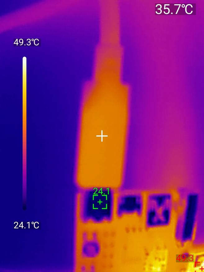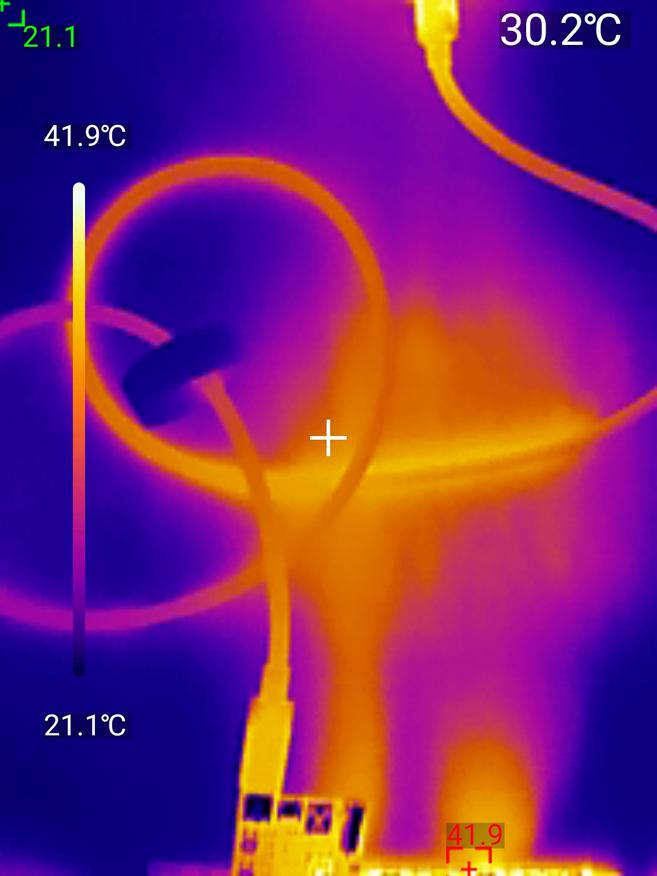 Для проверки подачи мощности использовалось несколько адаптеров с поддержкой Power Delivery 3.1: от 65 Вт до 140 Вт. Кабель верно синхронизировал настройки, обеспечивая безопасную зарядку ноутбуков и других устройств. На на полной нагрузке в 140 Вт нагрев кабеля был умеренным — корпус коннекторов и оплётка оставались тёплыми (до 36 градусов), но не горячими спустя час нагрузки. Показания с тепловизора UNI-T UTI260M представлены ниже