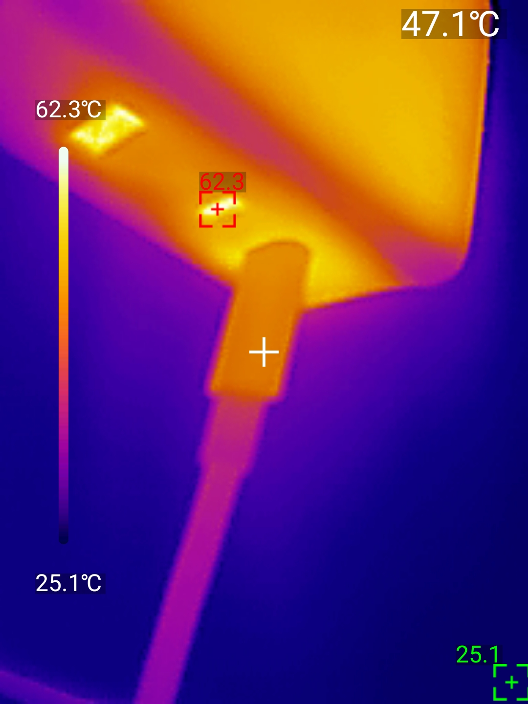 L709 протестирован с адаптерами различной мощности от 30W до заявленных 140W. Кабель корректно согласовывает параметры с подключаемыми гаджетами, обеспечивая максимально возможную скорость пополнения батареи. При максимальной нагрузке температура коннекторов поднимается до 47°C согласно тепловизионным измерениям (UNI-T UTI260M) — вполне безопасный уровень.
