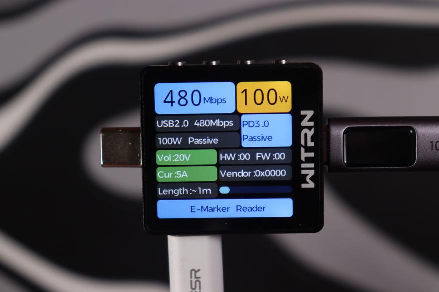 Встроенный е-маркер подтверждает, что кабель поддерживает скорость USB 2.0 до 480 Мбит/с, рассчитан на передачу питания до 100 Вт (20 В x 5 А) и совместим с протоколом USB Power Delivery 3.0. Также чип передаёт информацию о длине кабеля (около 1 м).