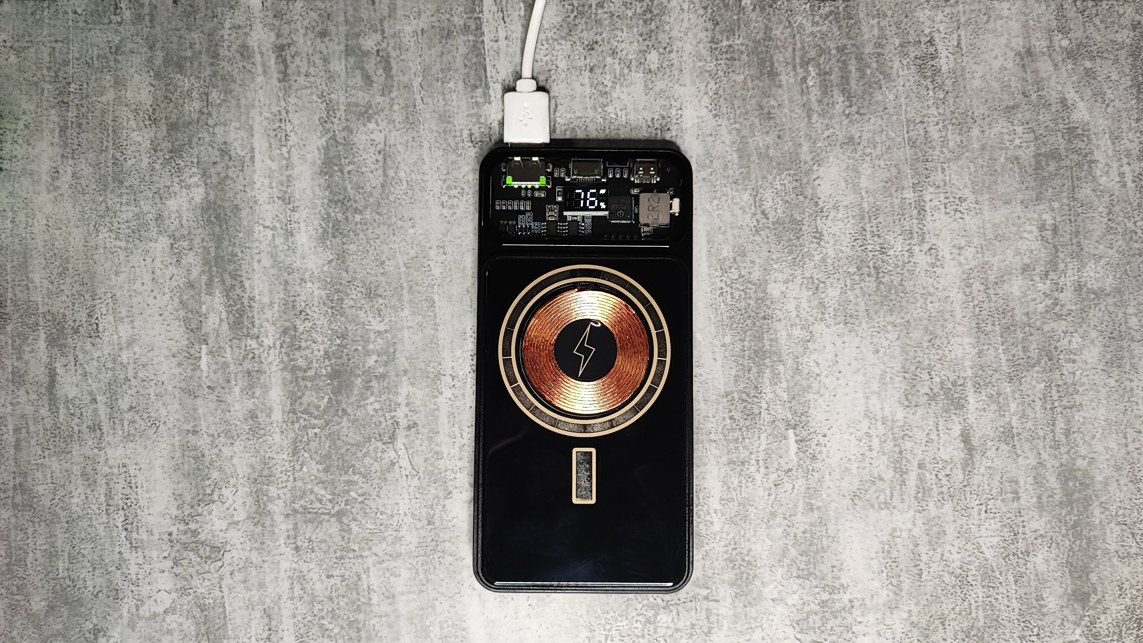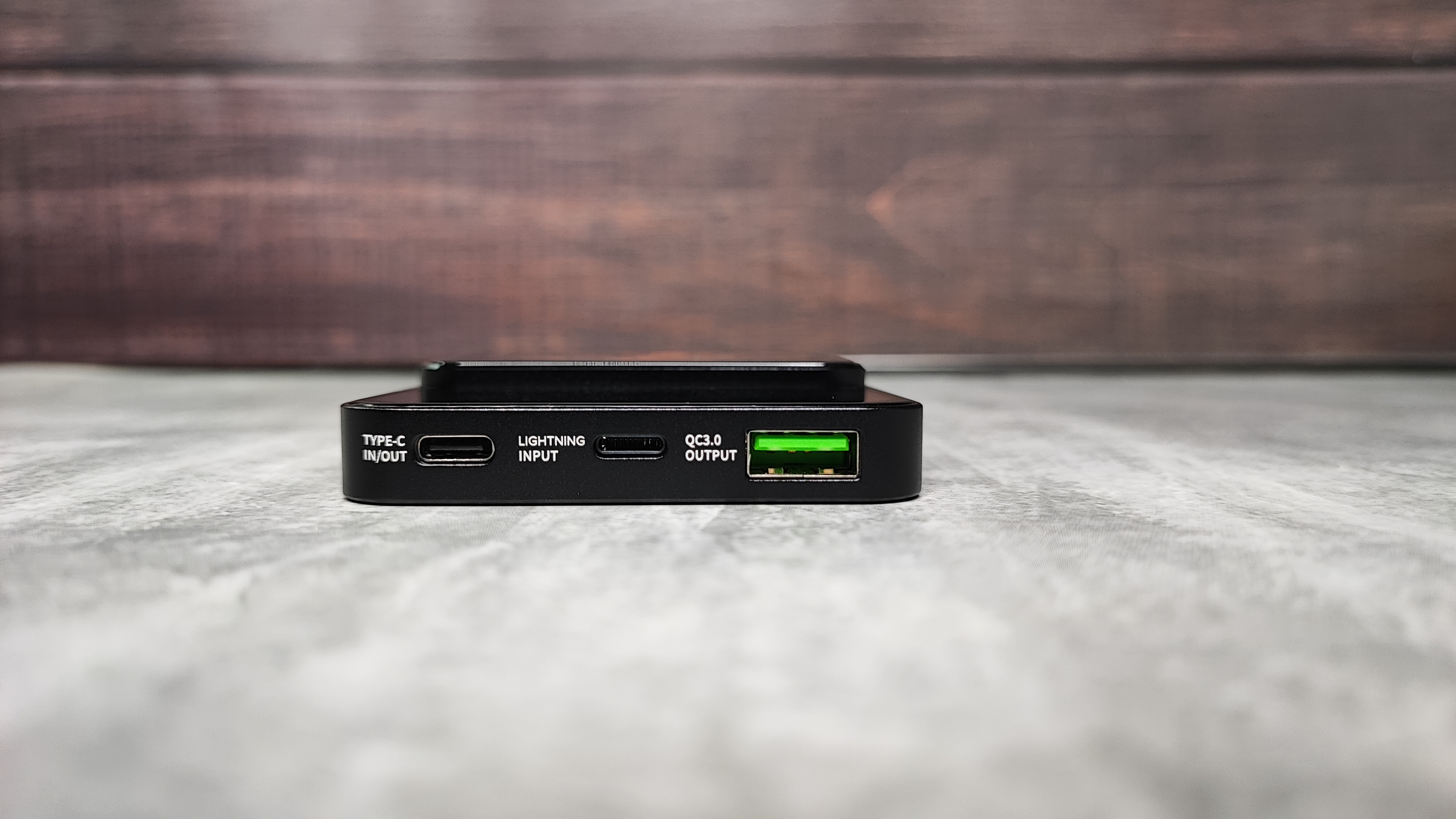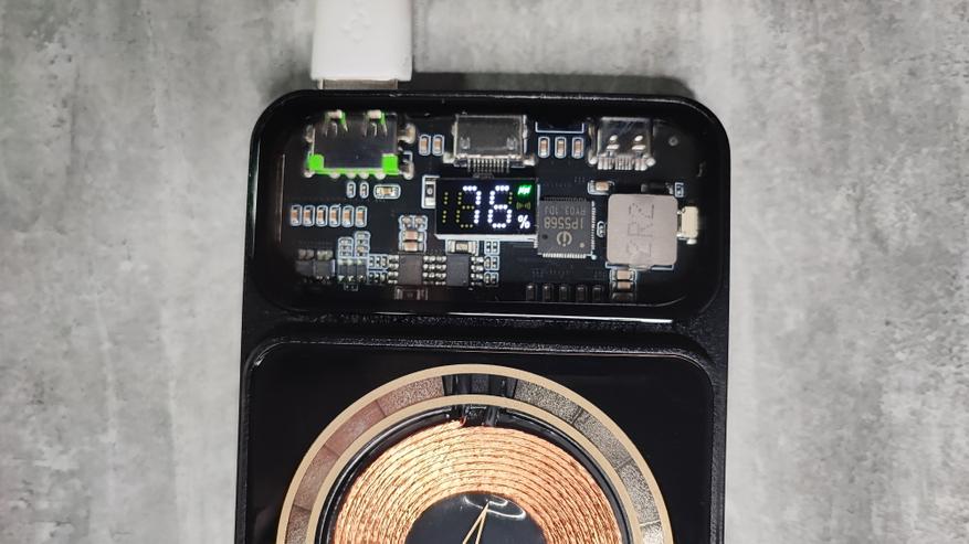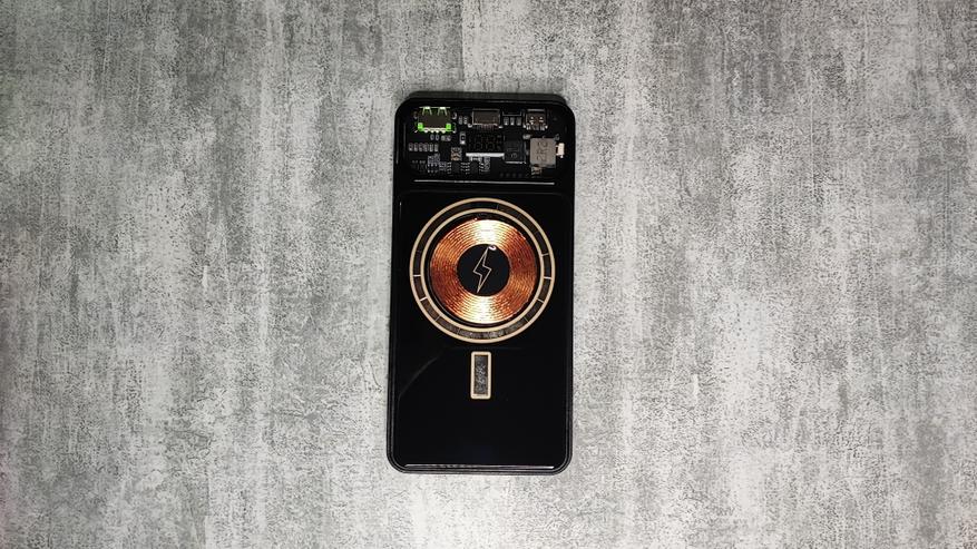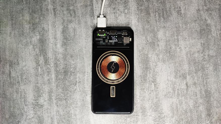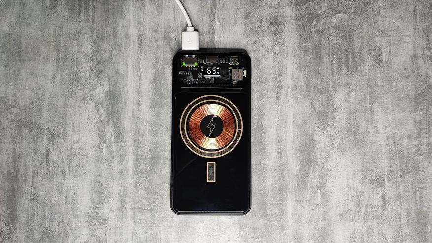 Корпус изготавливается из алюминиевого сплава со стеклом. Алюминий используется для изготовления рамки, стекло — для тыльной и лицевой стороны. Верх панели частично прозрачный. Потому пользователь может детально осмотреть плату управления, поверхность разъема и дисплея. Мне почему-то это напомнило устройство из вселенной Стимпанка. Ну уж очень оригинально смотрится данное устройство. Тут же есть небольшой дисплей, показывающий оставшийся заряд в процентах. Ниже прозрачной части на той же стороне расположена магнитная катушка беспроводного подзаряда. Это не только дизайнерская особенность, но и практическая польза. Состоит она в том, что пользователю не требуется искать место для беспроводной зарядки смартфона. Еще одной полезной фишкой выступает наличие тут мощных магнитов. Они дают надежную фиксацию девайсов Apple с MagSafe или техники сторонних марок в чехлах, которые поддерживают опцию. Единственным недостатком, который портит впечатление о конструкции так это глянцевая лицевая и тыльная панель, т.к. все отпечатки пальцев и грязь очень видны и ее нужно регулярно вытирать, чтобы она аккуратно выглядела.