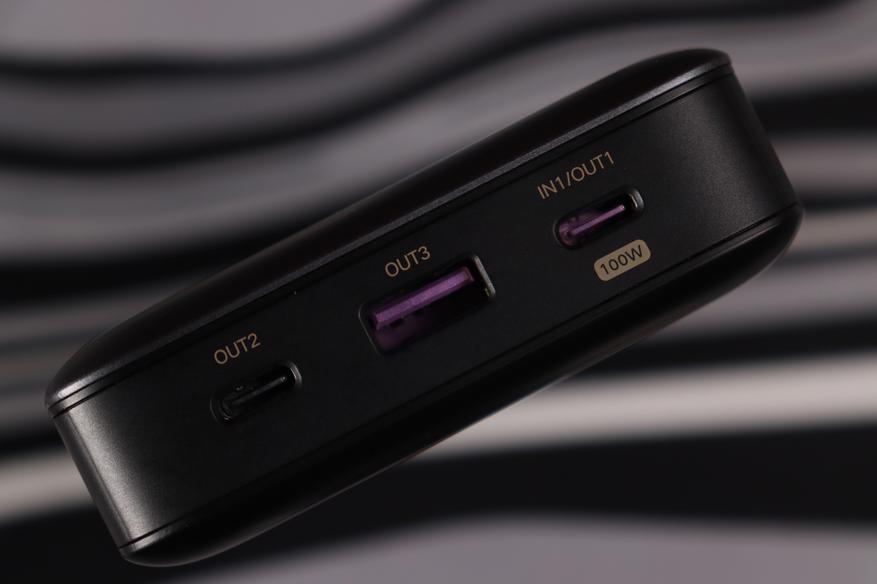 Все три порта находятся на верхней грани с четкой маркировкой функциональности. Только первый USB-C поддерживает двунаправленную работу и полную мощность 100 Вт, второй ограничен 30 Вт, USB-A — 18 Вт.