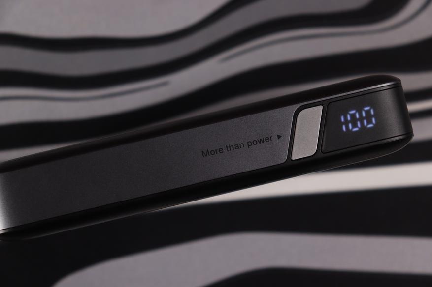 Конструкция в форме плоского кирпичика с закругленными краями обеспечивает удобство размещения в различных карманах и отделениях сумок. Корпус имеет матовую поверхность и выполнен из пластика серого оттенка, устойчивого к появлению отпечатков и мелких повреждений. На лицевой панели размещен логотип бренда с указанием максимальной мощности. Технические параметры перенесены на боковую грань, что делает дизайн более минималистичным. Справа расположена кнопка активации LED-индикатора заряда и переключения в режим зарядки маломощных устройств.