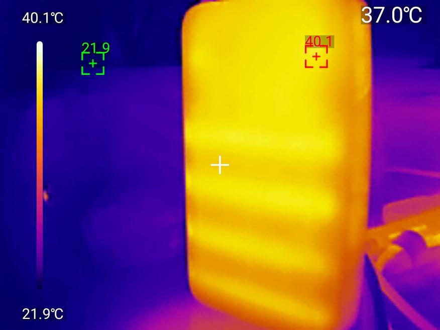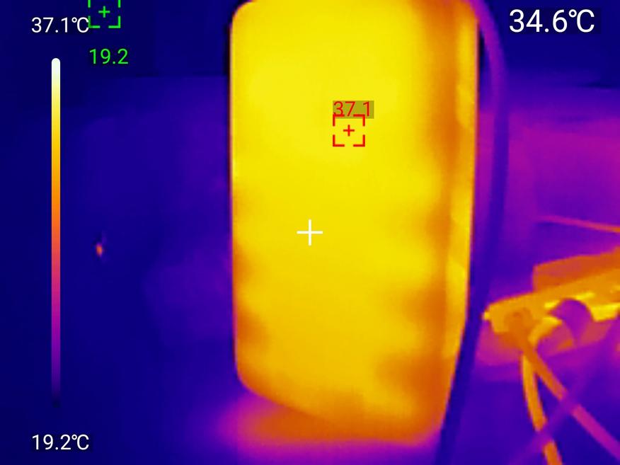 Корпус во время зарядки оставался умеренно теплым без критического нагрева, что свидетельствует показания тепловизора UNI-T UTI 260M — до 30 градусов