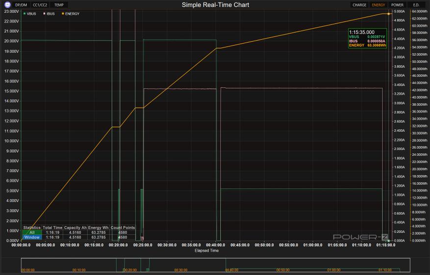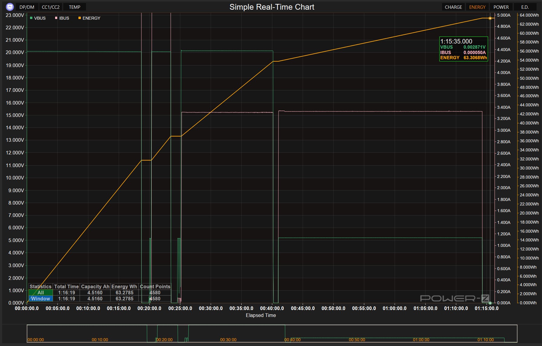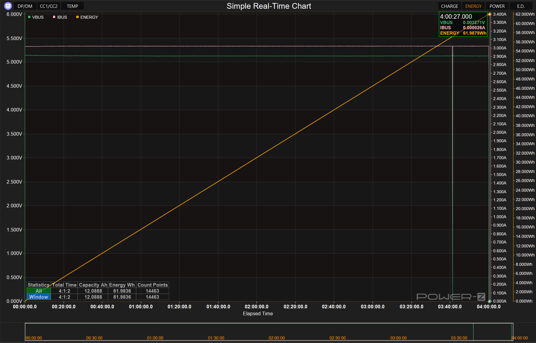 Первое тестирование осуществлялось при типовых условиях нагрузки 5 вольт и силе тока 3 ампера, что позволило получить достоверные данные о производительности батареи в процессе питания стандартных электронных приборов без поддержки быстрой зарядки. Проведённые эксперименты продемонстрировали надёжное функционирование источника питания на протяжении 4 часов, где аккумуляторы отдали практически 62Втч. (график получен с помощью тестера Power-Z KM003C)