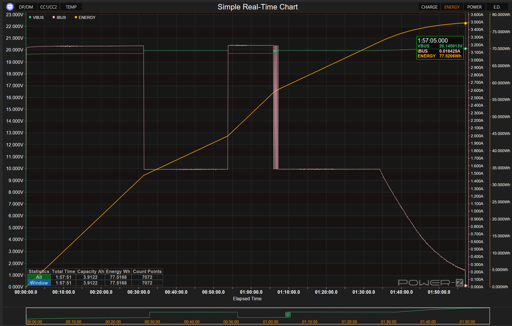 Оба разъема показали отличные результаты в рамках своих возможностей. Первый порт способен стабильно работать во всех режимах до 20В/5А включительно. Система защиты функционирует корректно, обеспечивая запас мощности 11-15% относительно номинала. Из ограничений — при достижении уровня заряда менее 9% контроллер ограничивает работу протокола Power Delivery и отключает 20В.