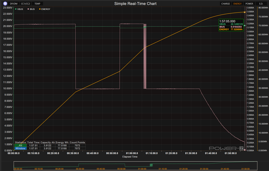 Общее время зарядки составило около 2 часов, за которые аккумулятор накопил 77,5 Втч энергии. Такие показатели говорят о нормальной работе устройства без каких-либо отклонений от заявленных характеристик.