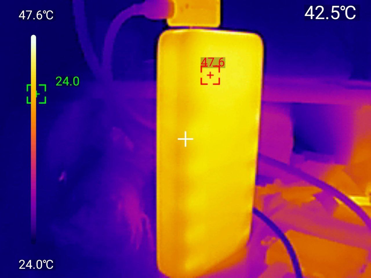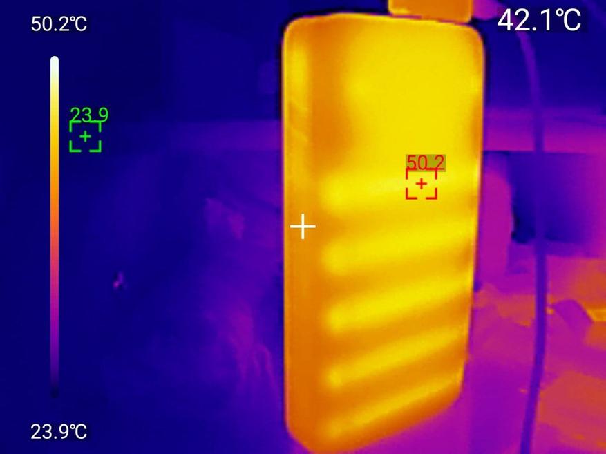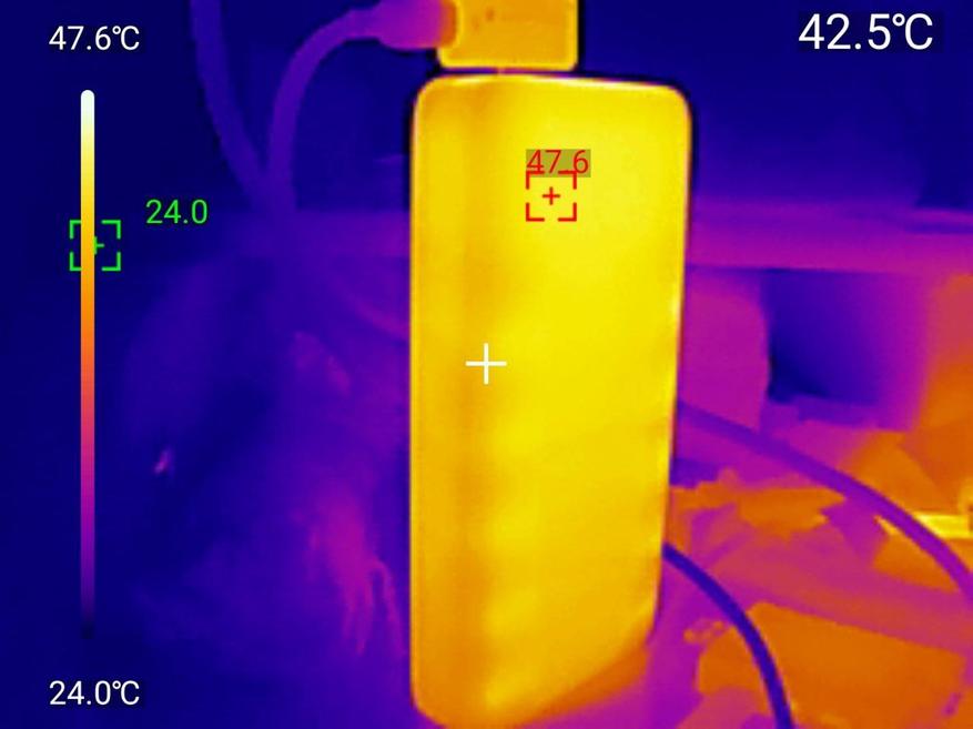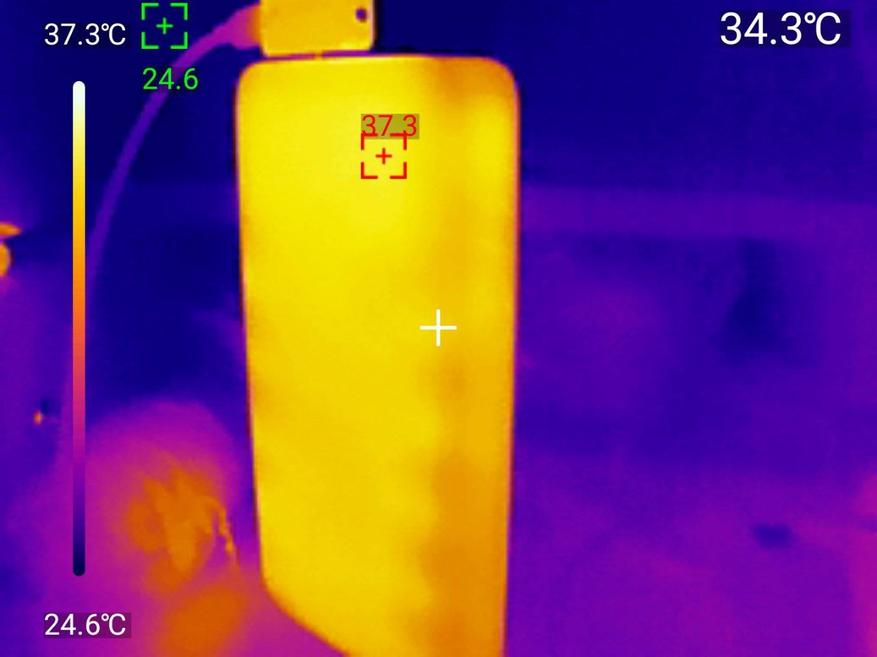 Температурный режим корпуса во время зарядки оставался в приемлемых пределах без критического перегрева, что подтверждают показания тепловизионной камеры UNI-T UTI 260M— максимум 37.3°C.