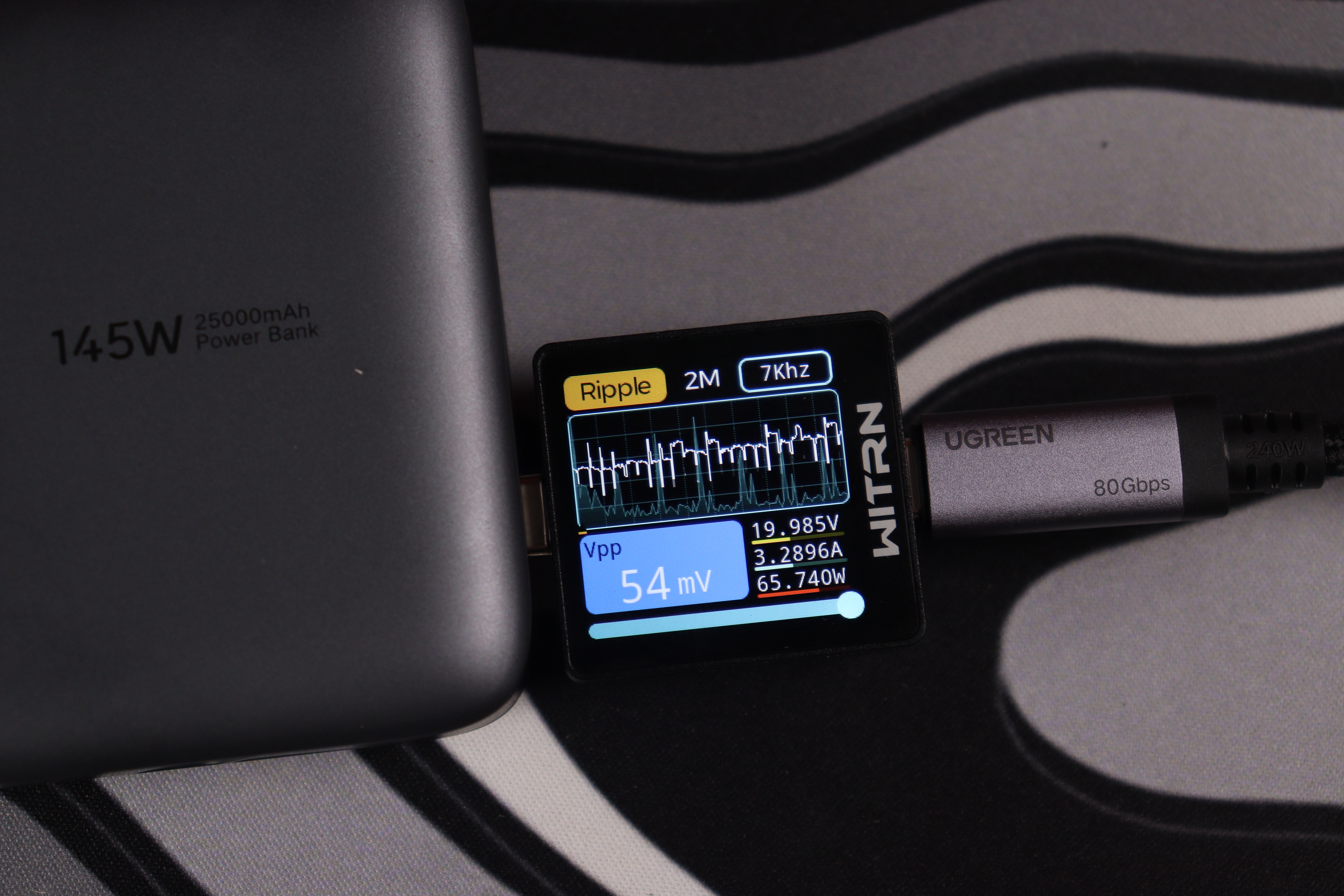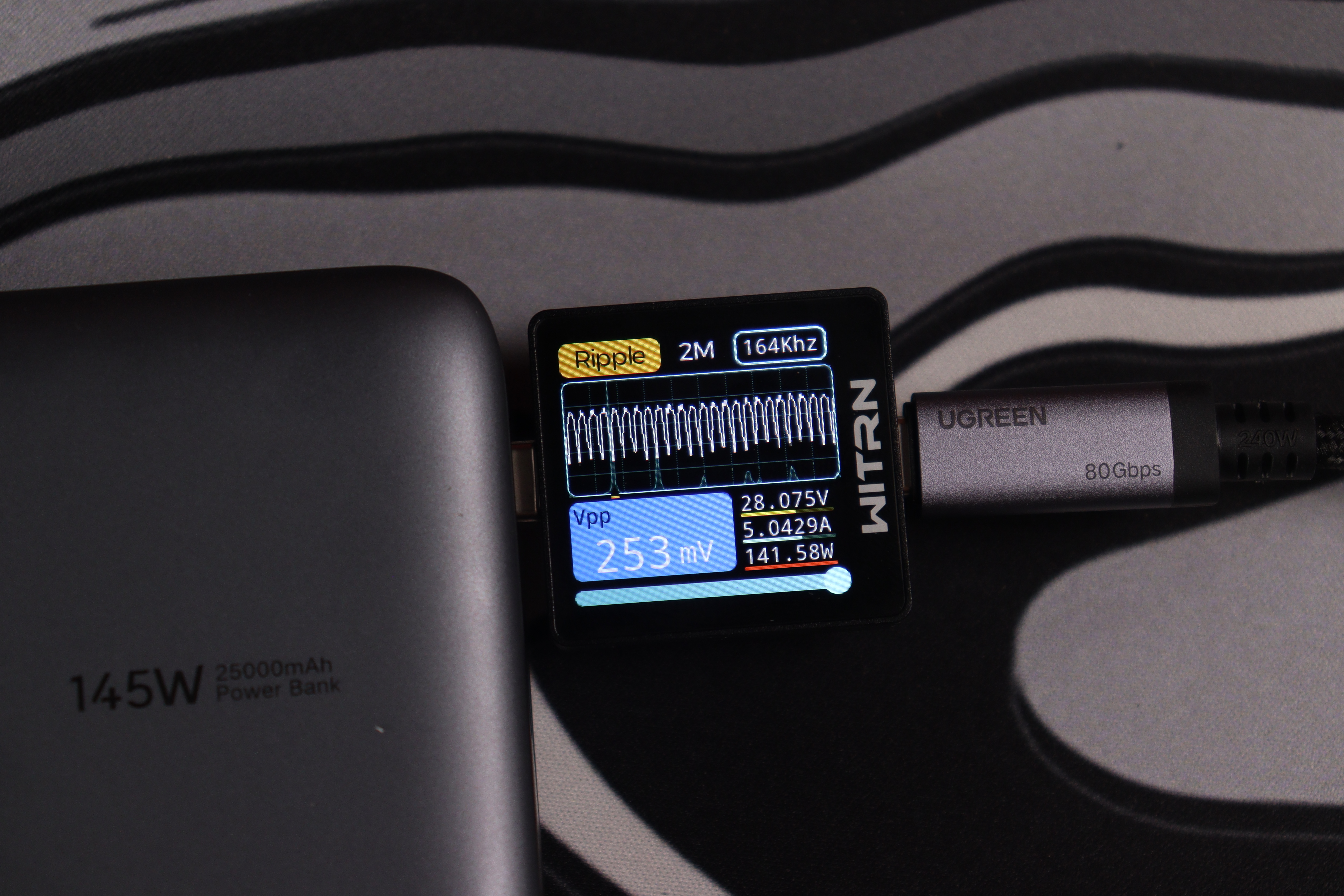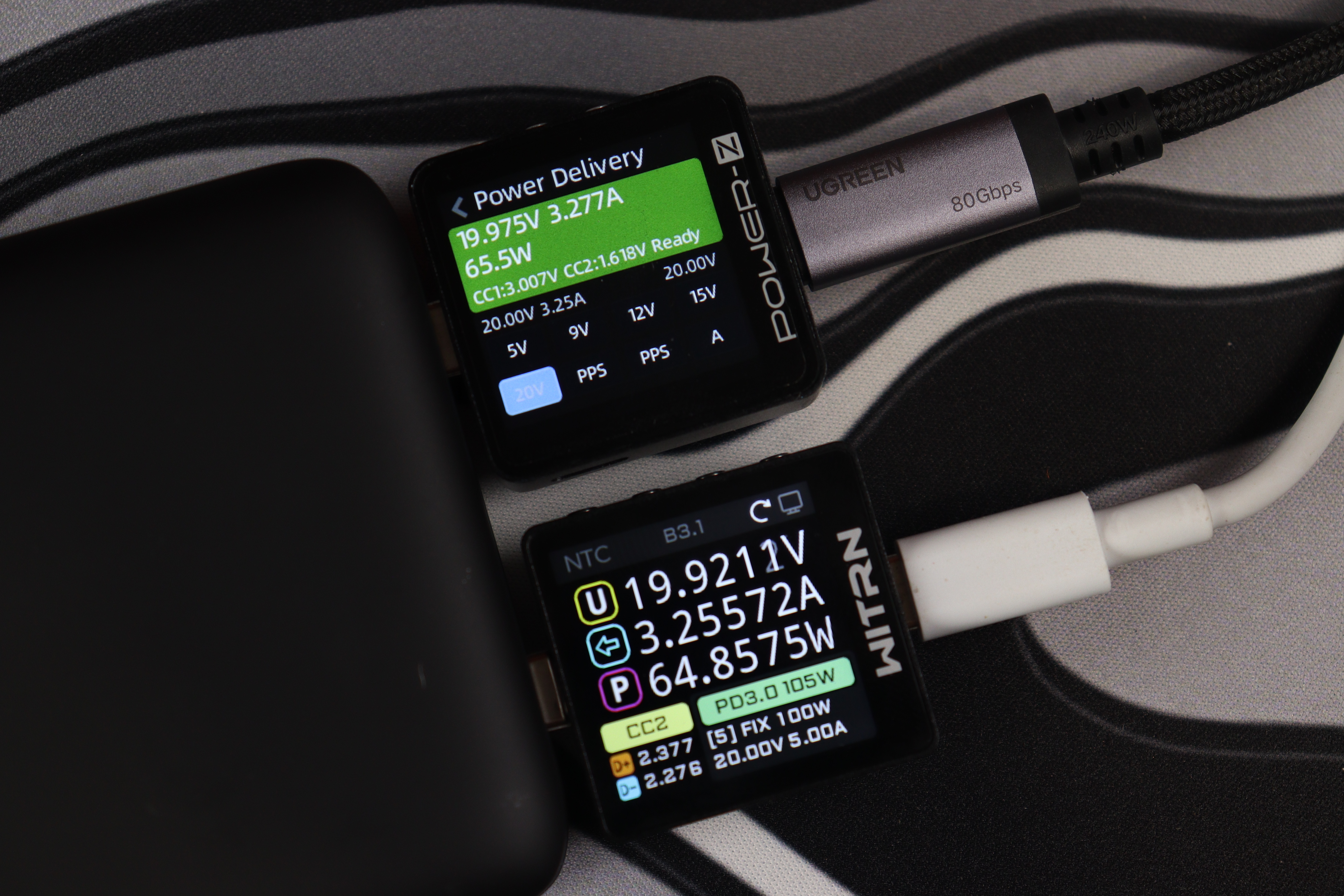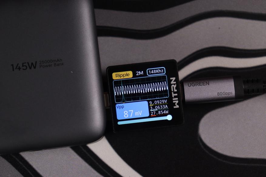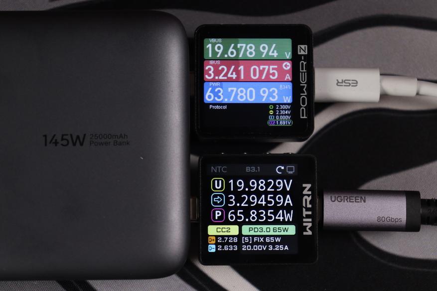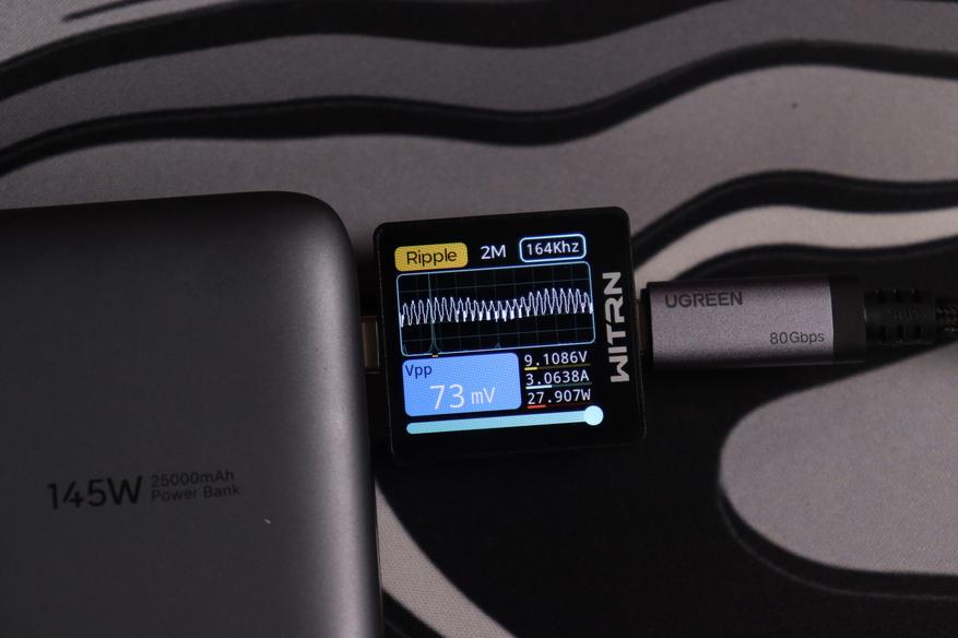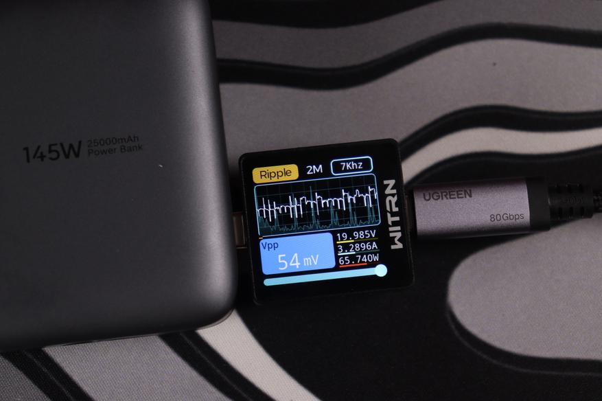 Оба разъема показали выдающиеся результаты в пределах своих технических возможностей. Главный порт обеспечивает стабильное функционирование во всех режимах до 28В/5А включительно, а второй — 20В/3.25А. Защитные протоколы работают безупречно, поддерживая запас мощности 8-12% от заявленного значения. Единственное ограничение — при критическом снижении заряда переводит устройство в энергосберегающий режим, отключая высоковольтные профили PD 3.1.
