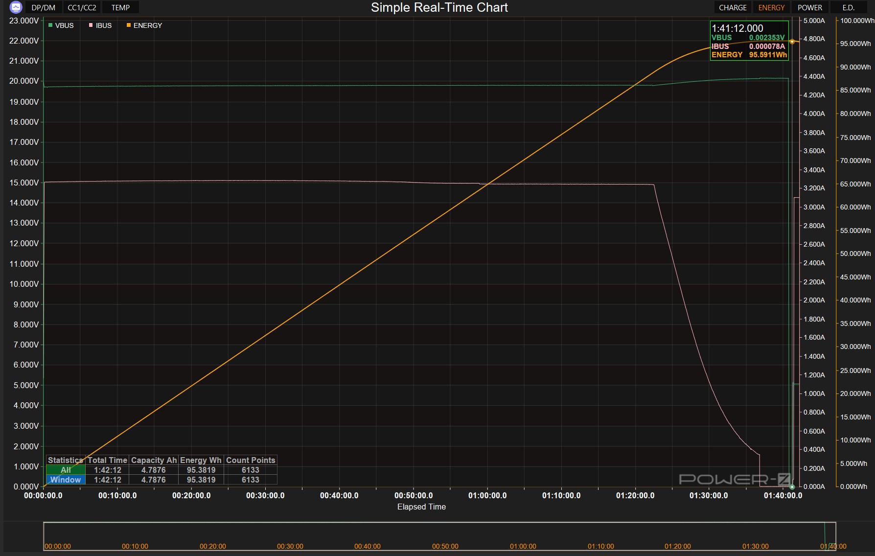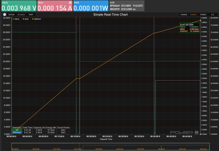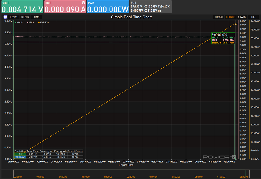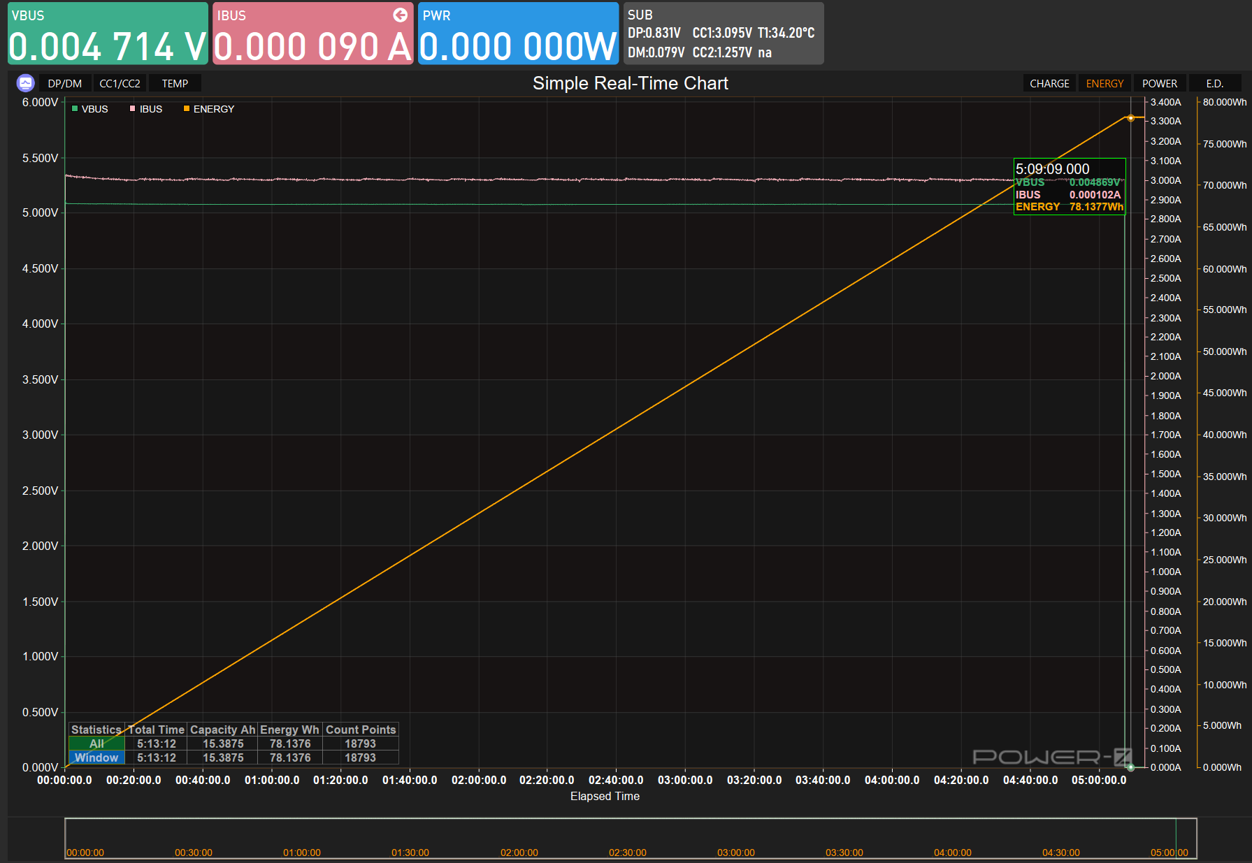 Первичное тестирование проводилось при стандартных параметрах 5В/3 А, что позволило получить объективные данные о производительности батареи при питании типовых электронных устройств без поддержки быстрой зарядки. Проведенные измерения продемонстрировали устойчивое функционирование источника на протяжении 4 часов 45 минут, при этом аккумуляторы отдали 78,13 Втч энергии (данные c Power-Z KM003C)