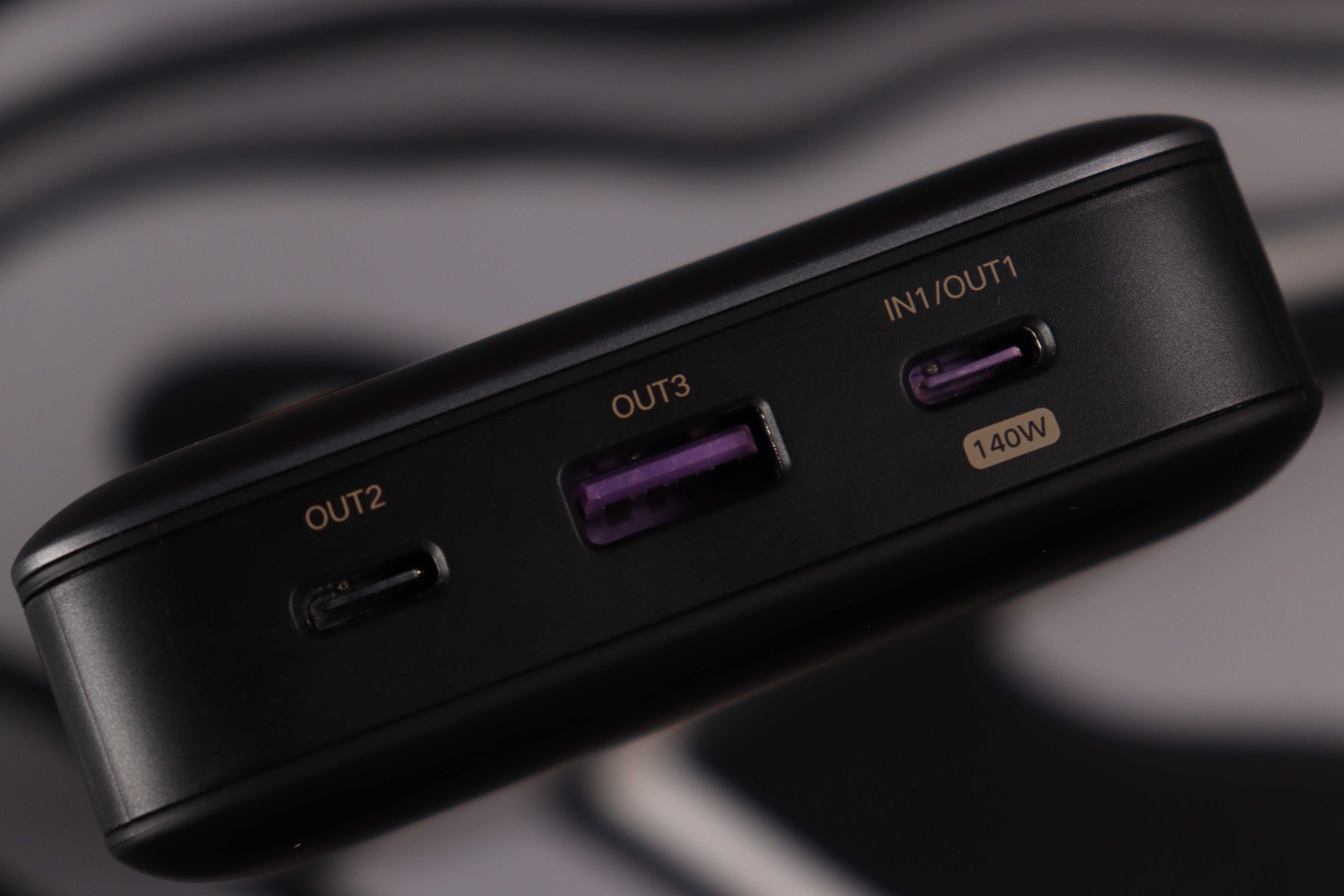Конфигурация портов размещена на верхней грани с четким функциональным разделением. Первый USB-C поддерживает двунаправленную работу с максимальной мощностью 140W (протокол PоwerDelivery 3.1, 28В), второй ограничен 65W, порт USB-А обеспечивает до 22,5W.