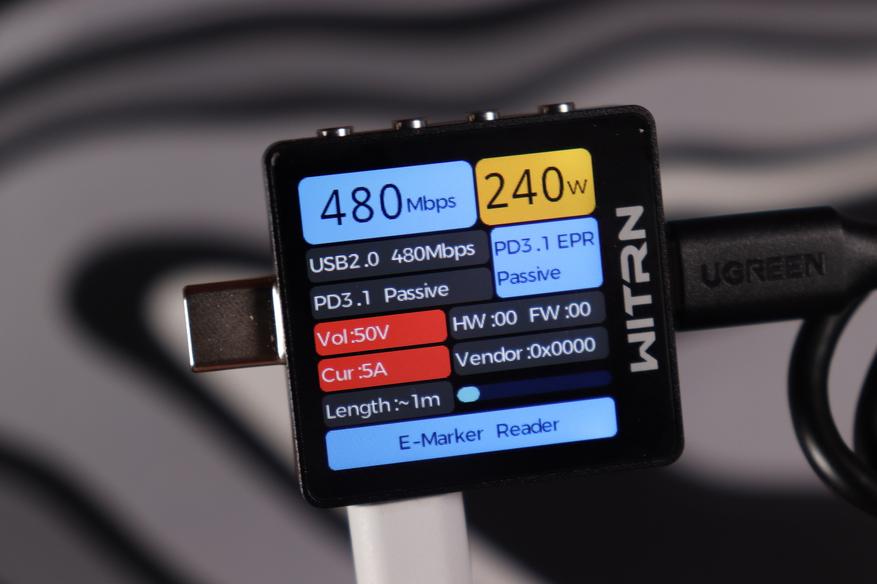 Входящий в комплект кабель поддерживает PоwerDelivery 3.1, обеспечивая передачу заявленной мощности.