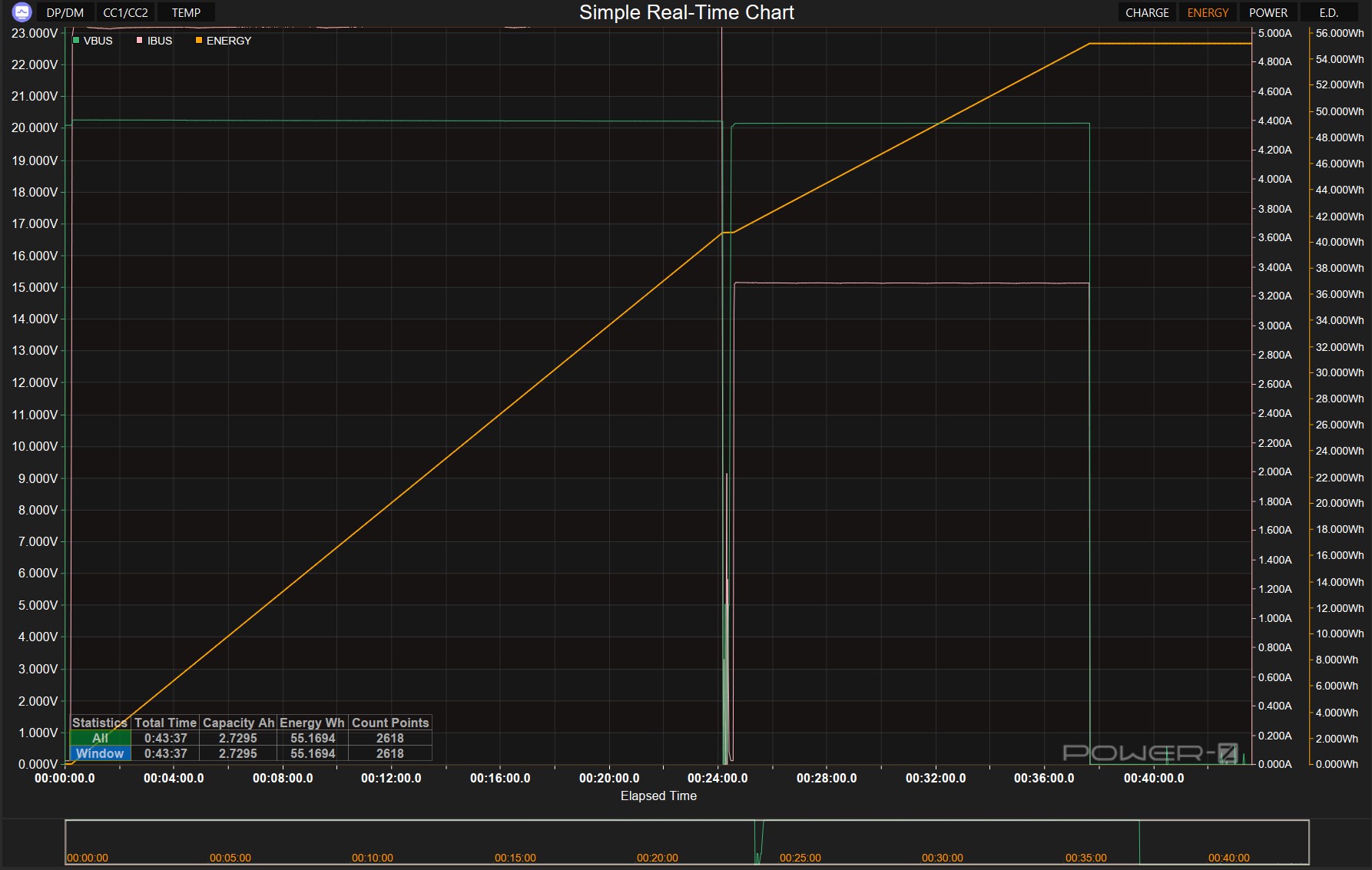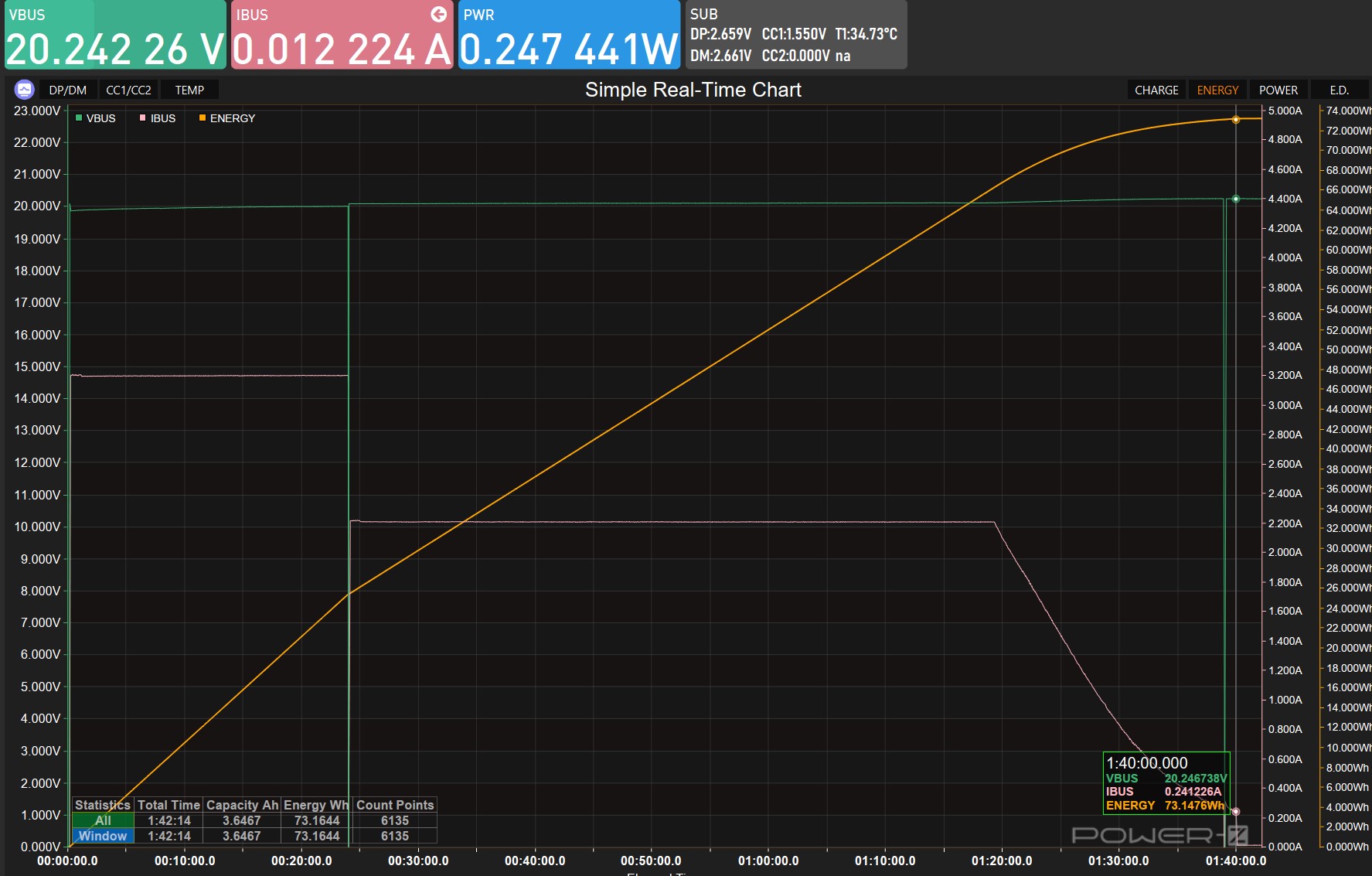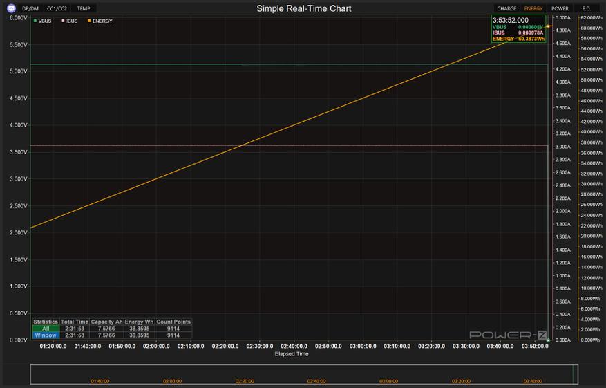Оценка началась с определения реальной ёмкости при токе 3А и напряжении 5В, позволяющего объективно оценить энергетический резерв при питании стандартных устройств. Результаты показали непрерывное функционирование и соответствие заявленным параметрам. Устройство выдало 60.37Втч за почти 4 часа работы.