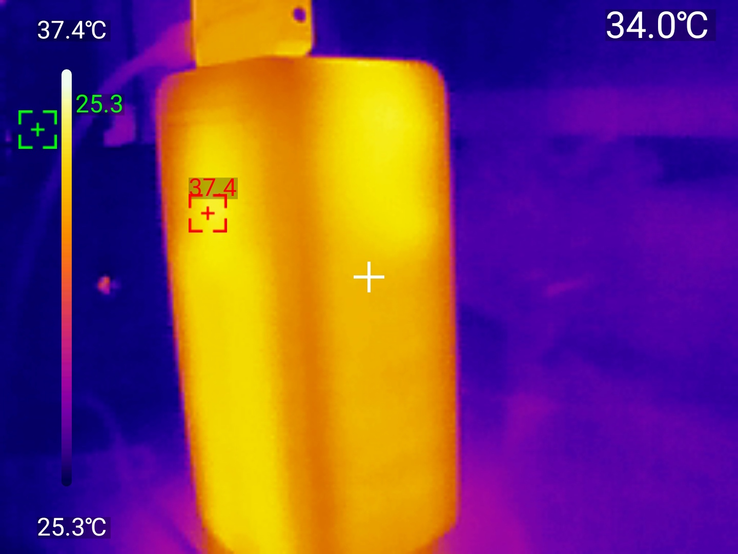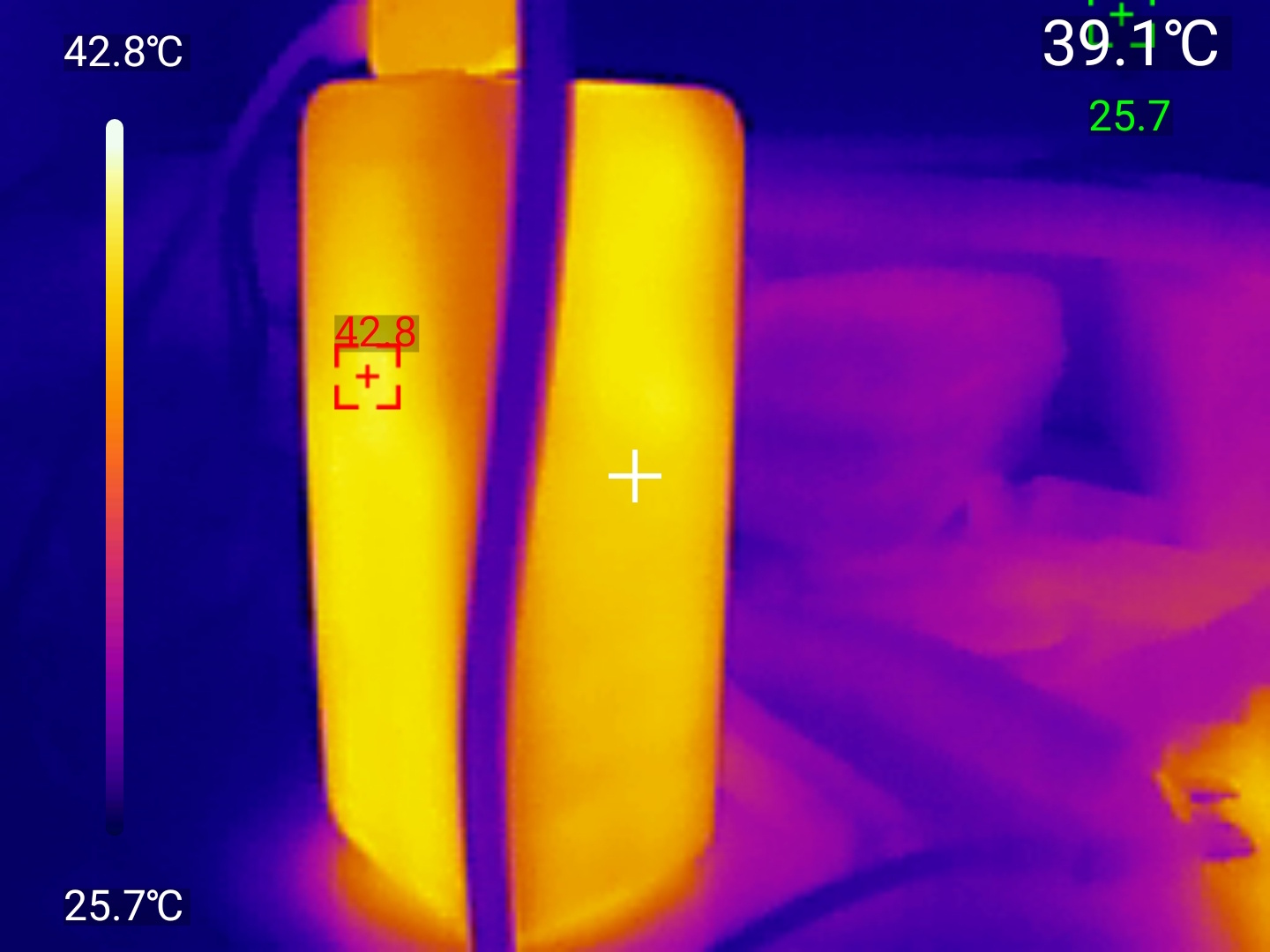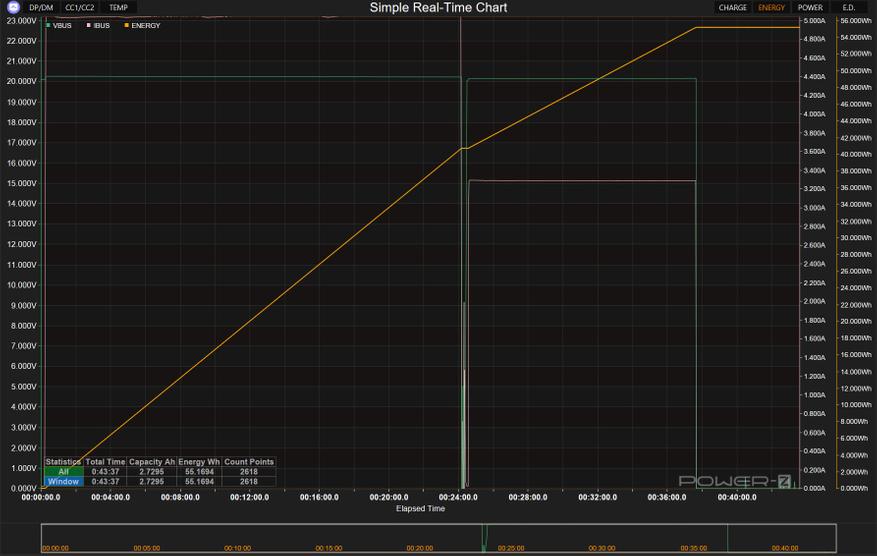 PB725 ограничен скоростью собственной зарядки мощностью 65Вт, причём данная мощность действует кратковременно, обычно стабилизируясь на уровне 45Вт. Напряжение устойчиво поддерживалось на отметке 20В, а ток плавно снижался по мере насыщения аккумулятора. «Залитая» ёмкость находилась на уровне 73.14Втч, а максимальный нагрев корпуса составил почти 43℃, показания были сняты с тепловизора UNI-T UТI260M.