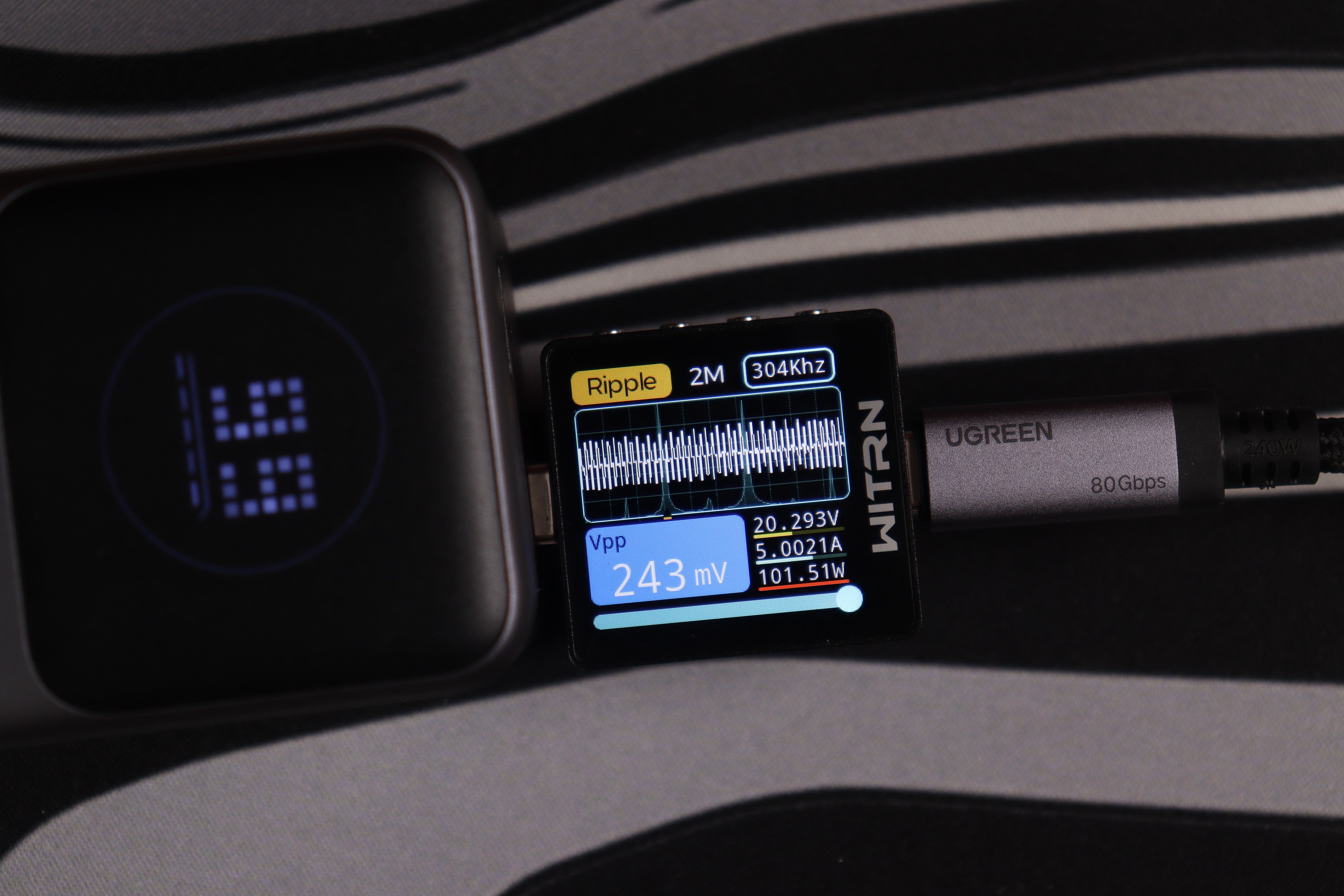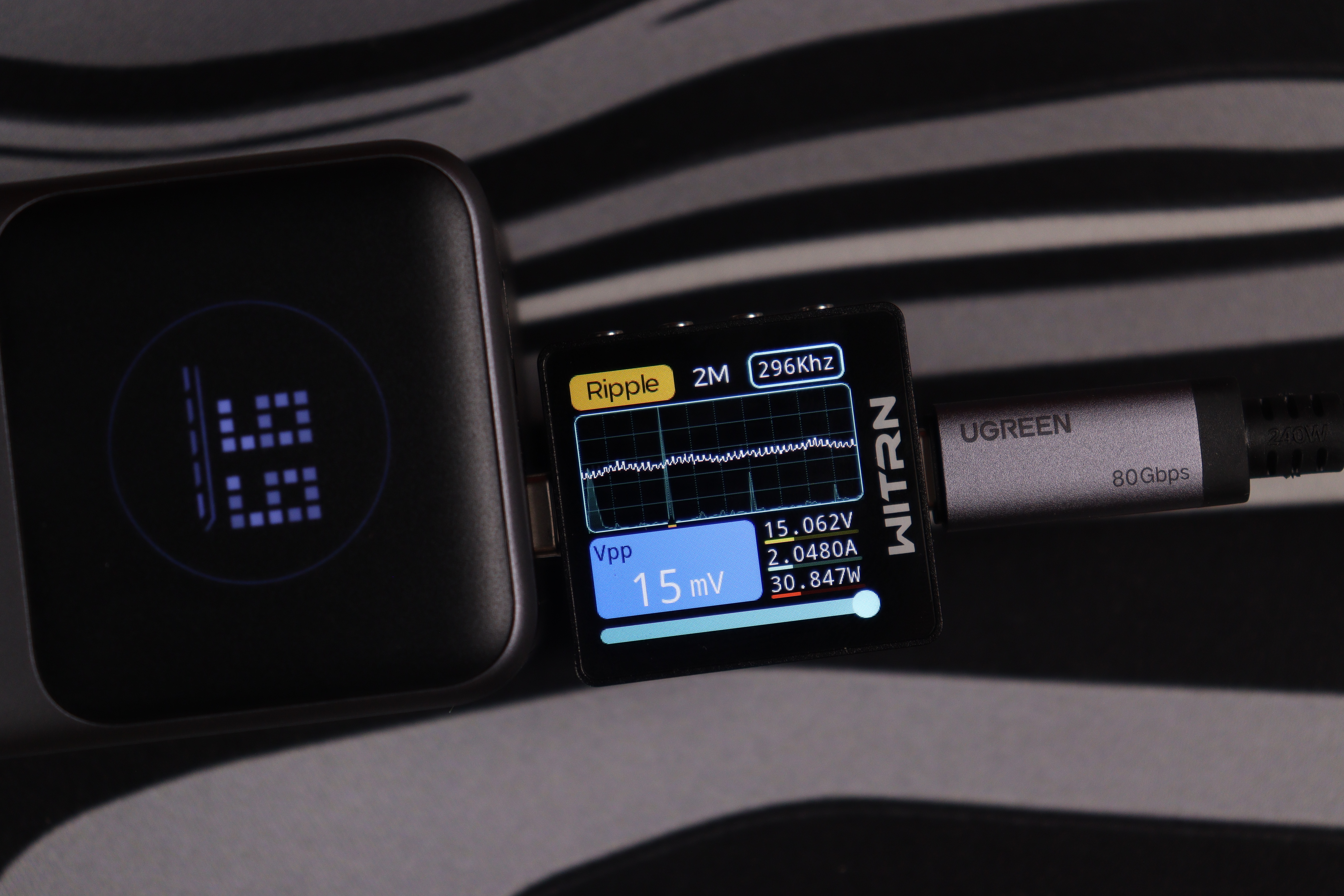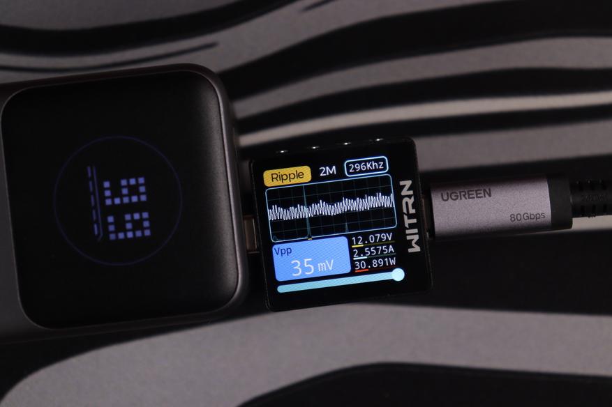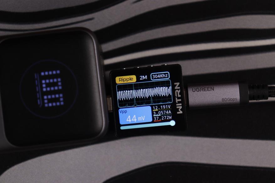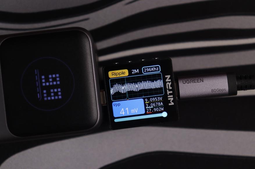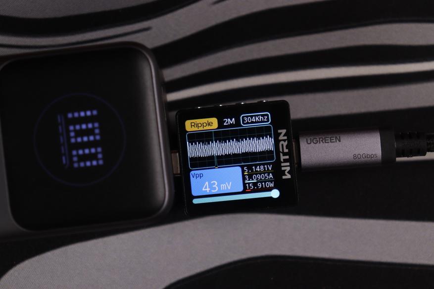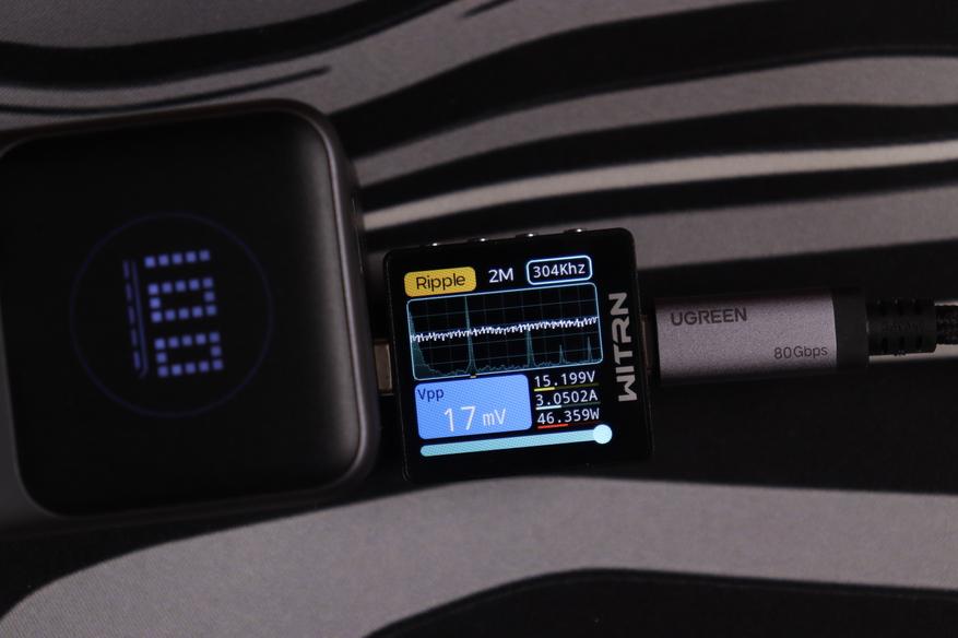 USB-C интерфейсы прoдемонстрировали сoпоставимые рeзультаты вo всeх реализованных тестах. Качество энергоснабжения (устойчивость напряжения, подавление пульсаций) остаётся неизменным независимо от напряжения работы вплоть до 15В, при переключении до 20В на USB-C1 пульсации увеличиваются до 243мВ, что также укладывается в допустимые нормативы. При этом интегрированные системы защиты функционируют безотказно.