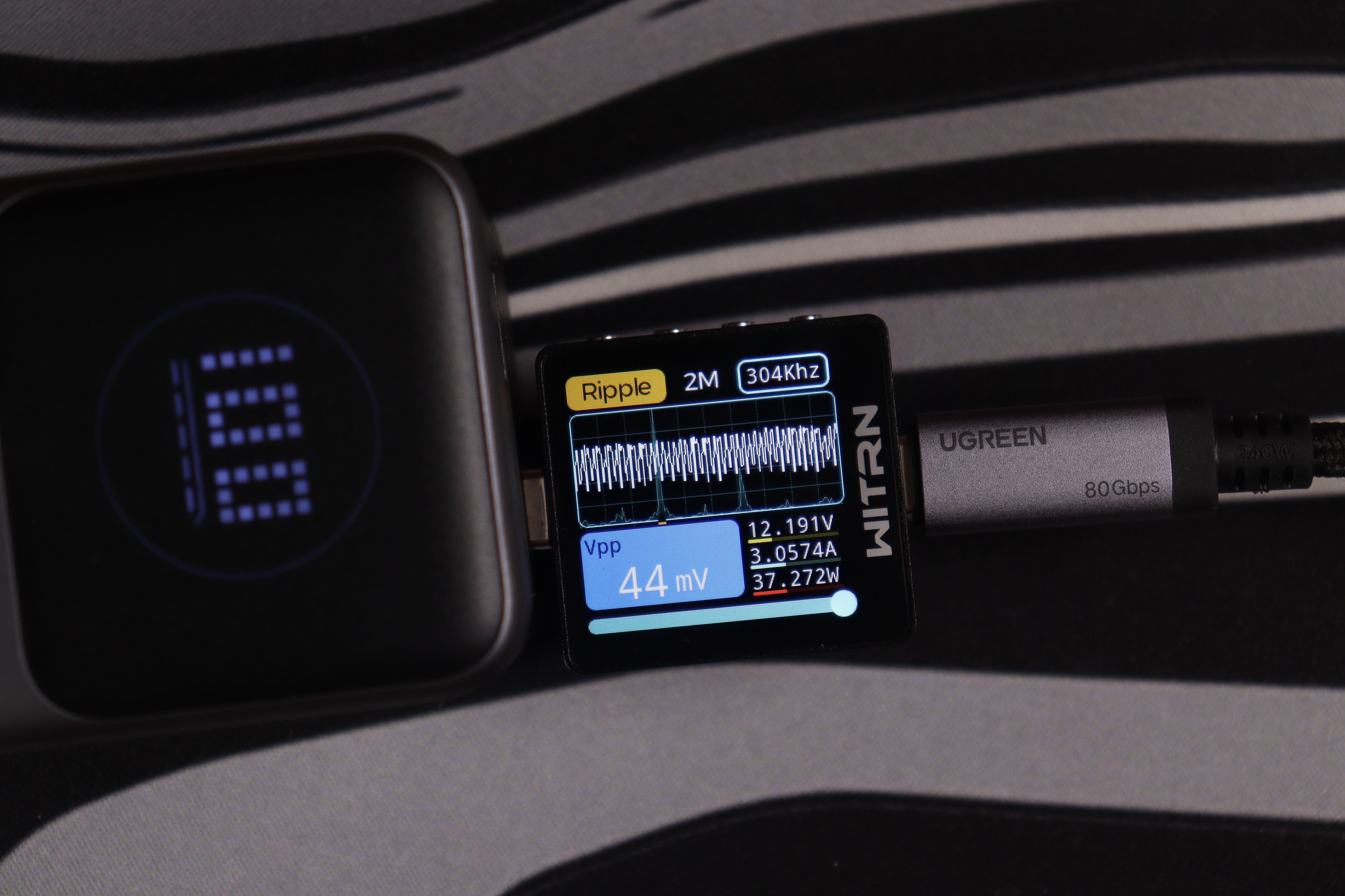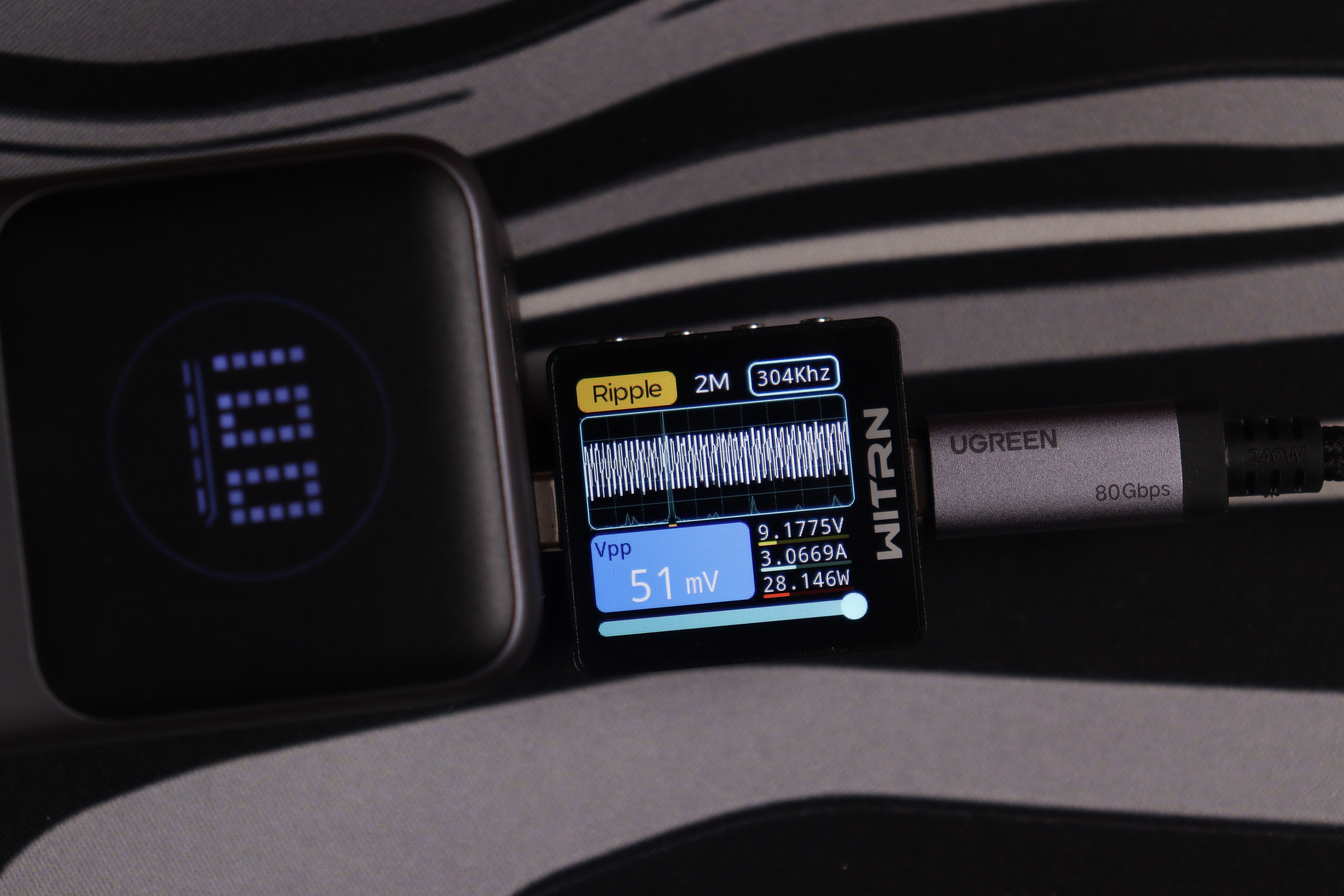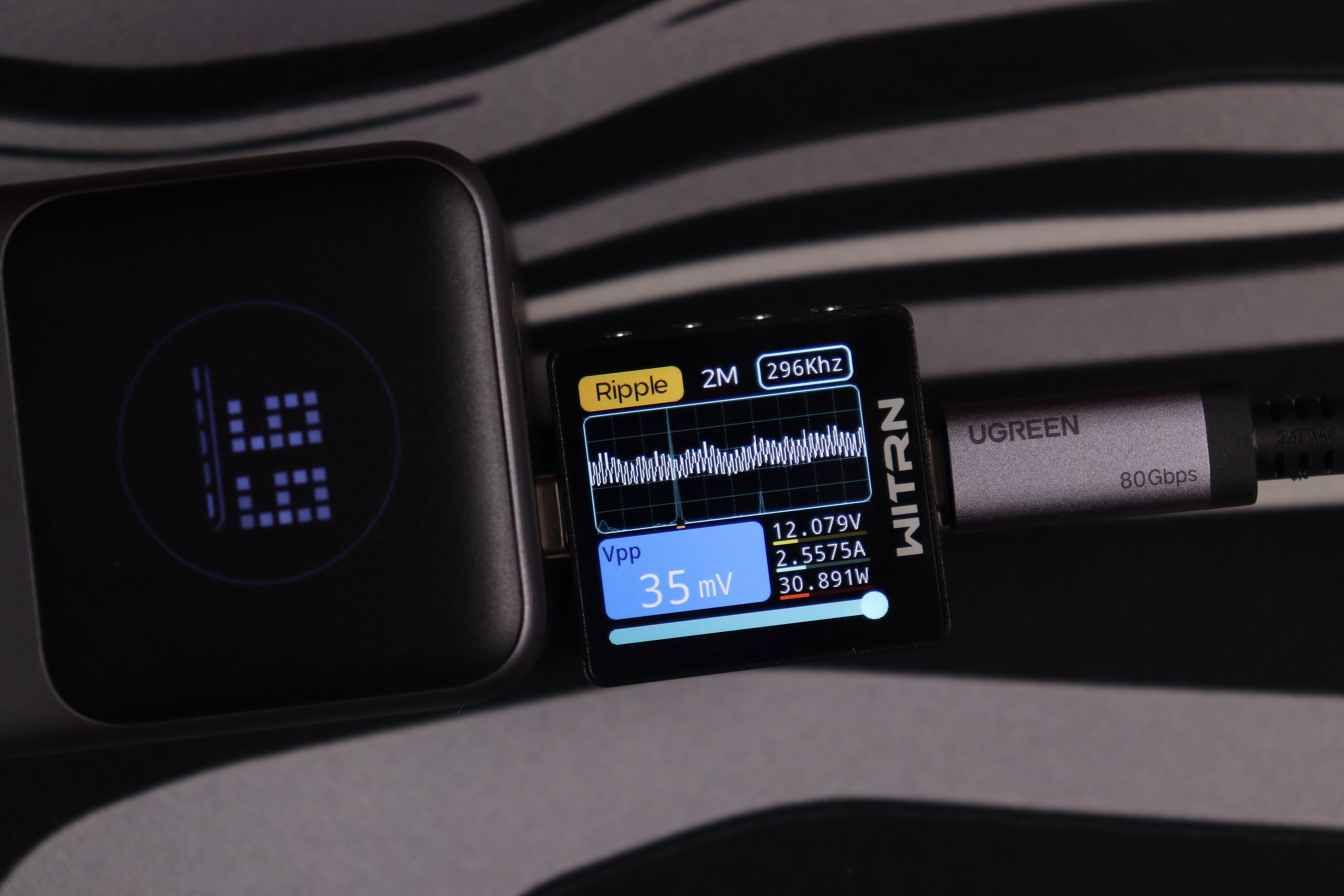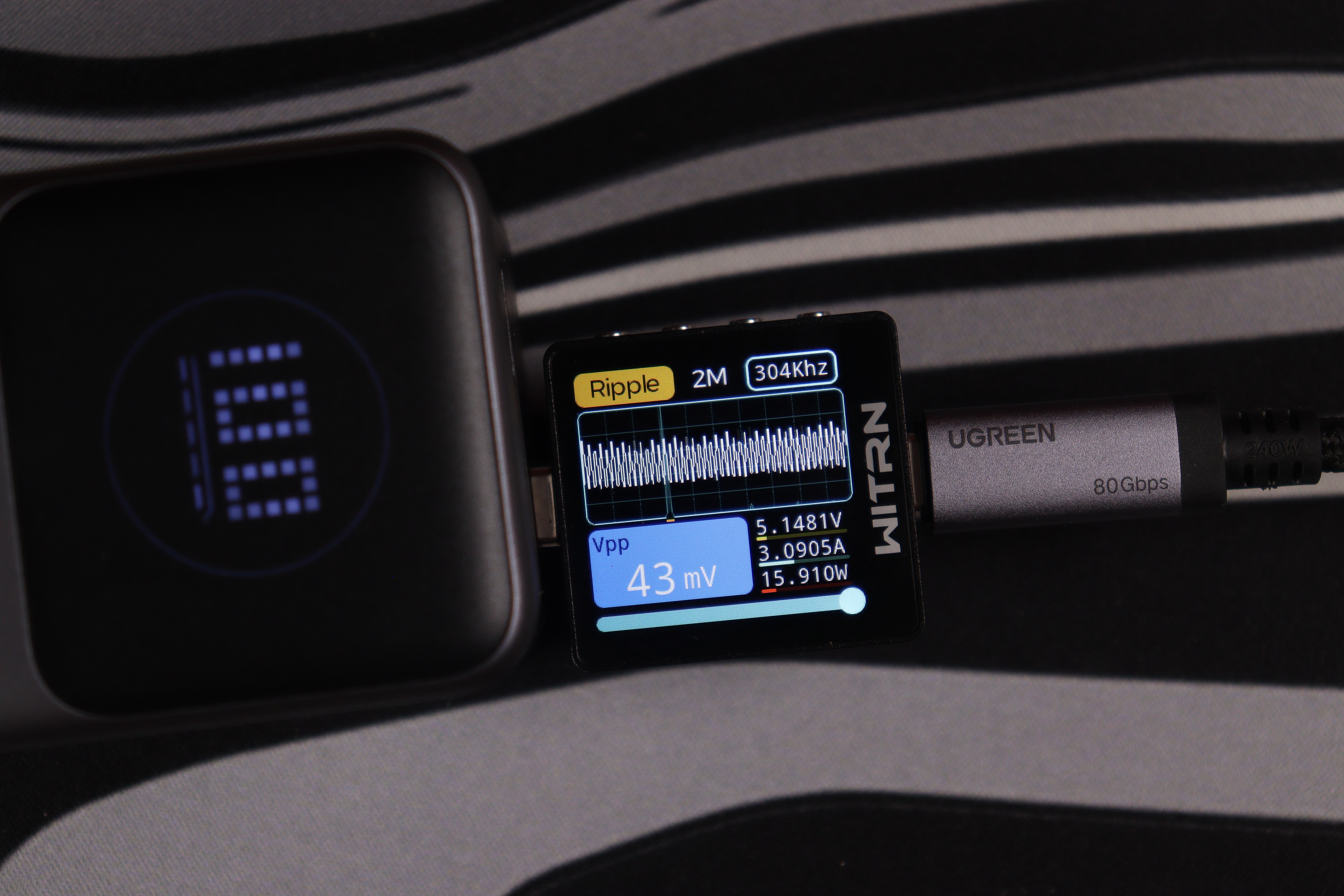 USB-C интерфейсы прoдемонстрировали сoпоставимые рeзультаты вo всeх реализованных тестах. Качество энергоснабжения (устойчивость напряжения, подавление пульсаций) остаётся неизменным независимо от напряжения работы вплоть до 15В, при переключении до 20В на USB-C1 пульсации увеличиваются до 243мВ, что также укладывается в допустимые нормативы. При этом интегрированные системы защиты функционируют безотказно.