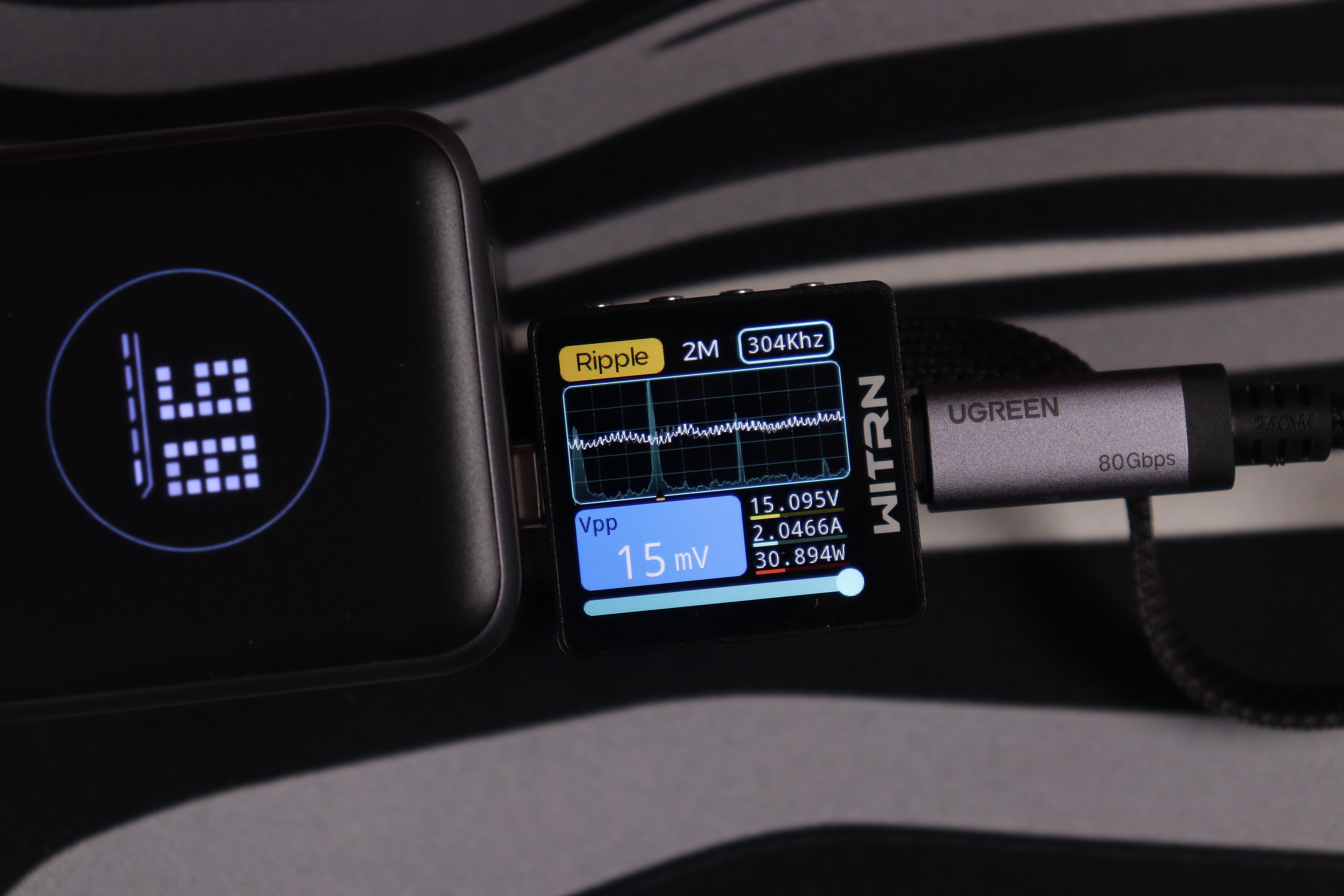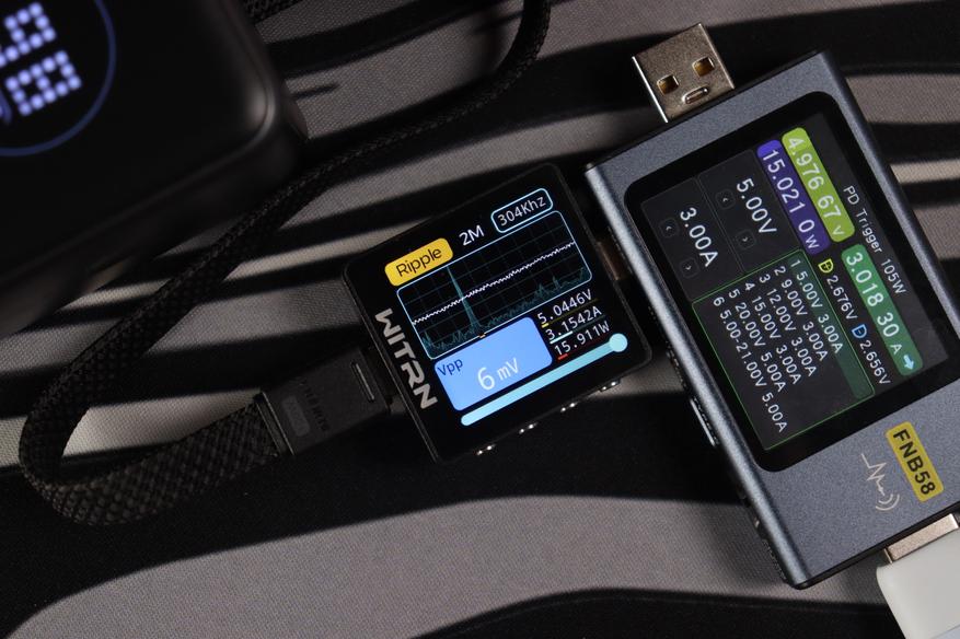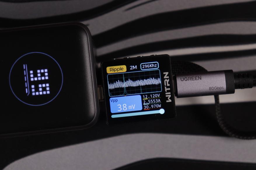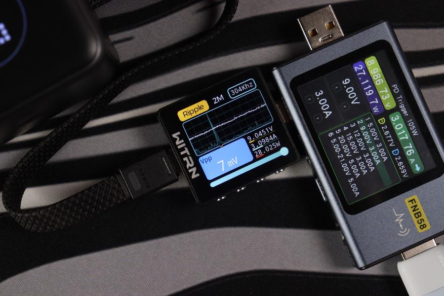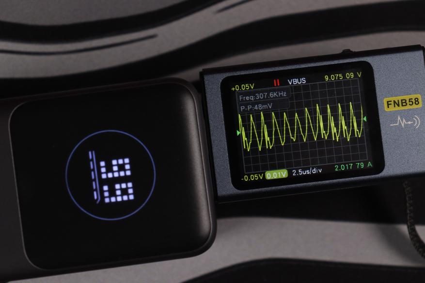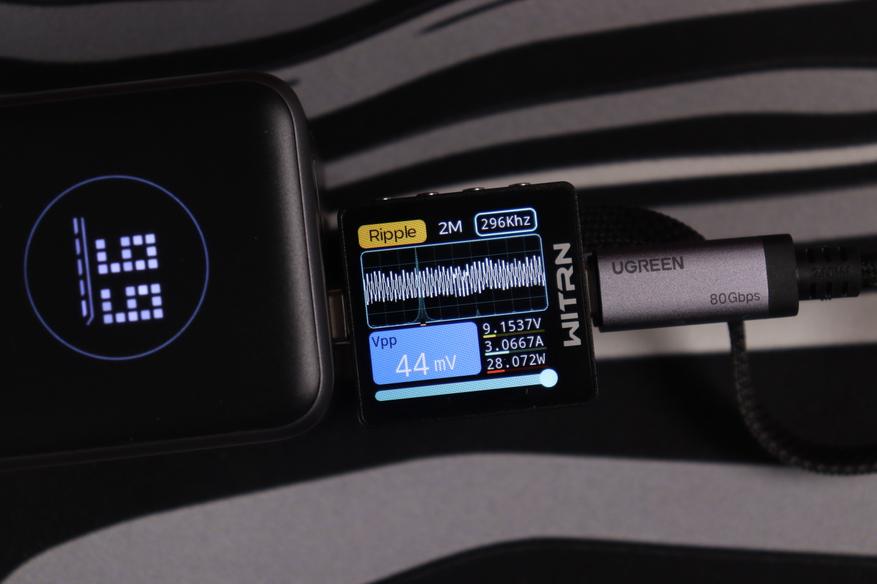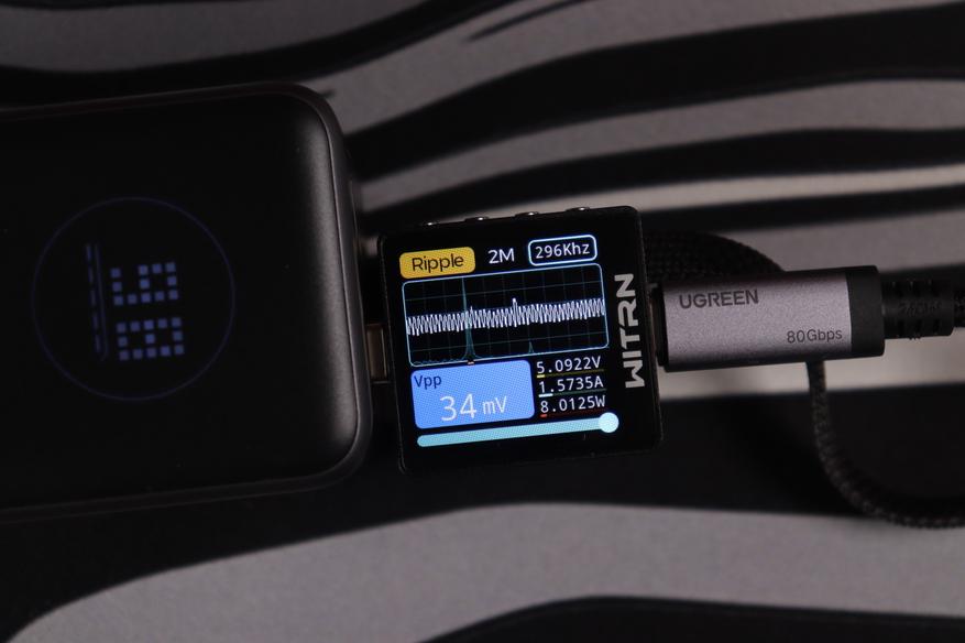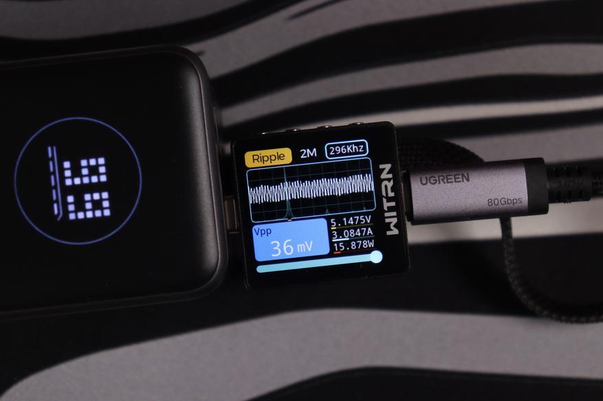 Основной разъём и показания через встроенный кабель показали идентичные (отличные) результаты во всех тестовых сценариях. Качество энергоснабжения остаётся неизменным в диапазоне от 5 до 20 вольт. Из примечательного — в данном случае отсутствуют пульсации более 200мВ на максимальном режиме работы, как это было с PB725.