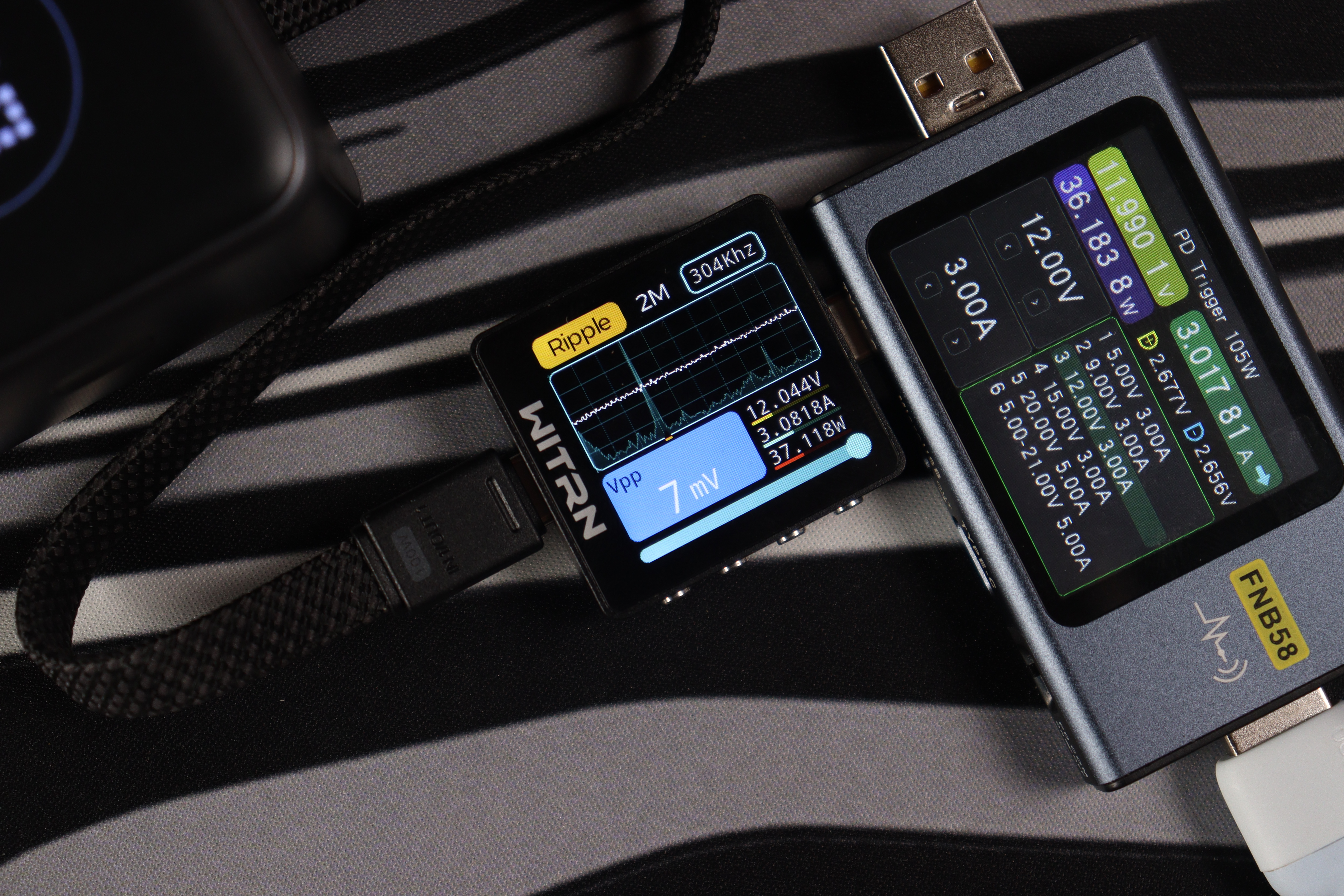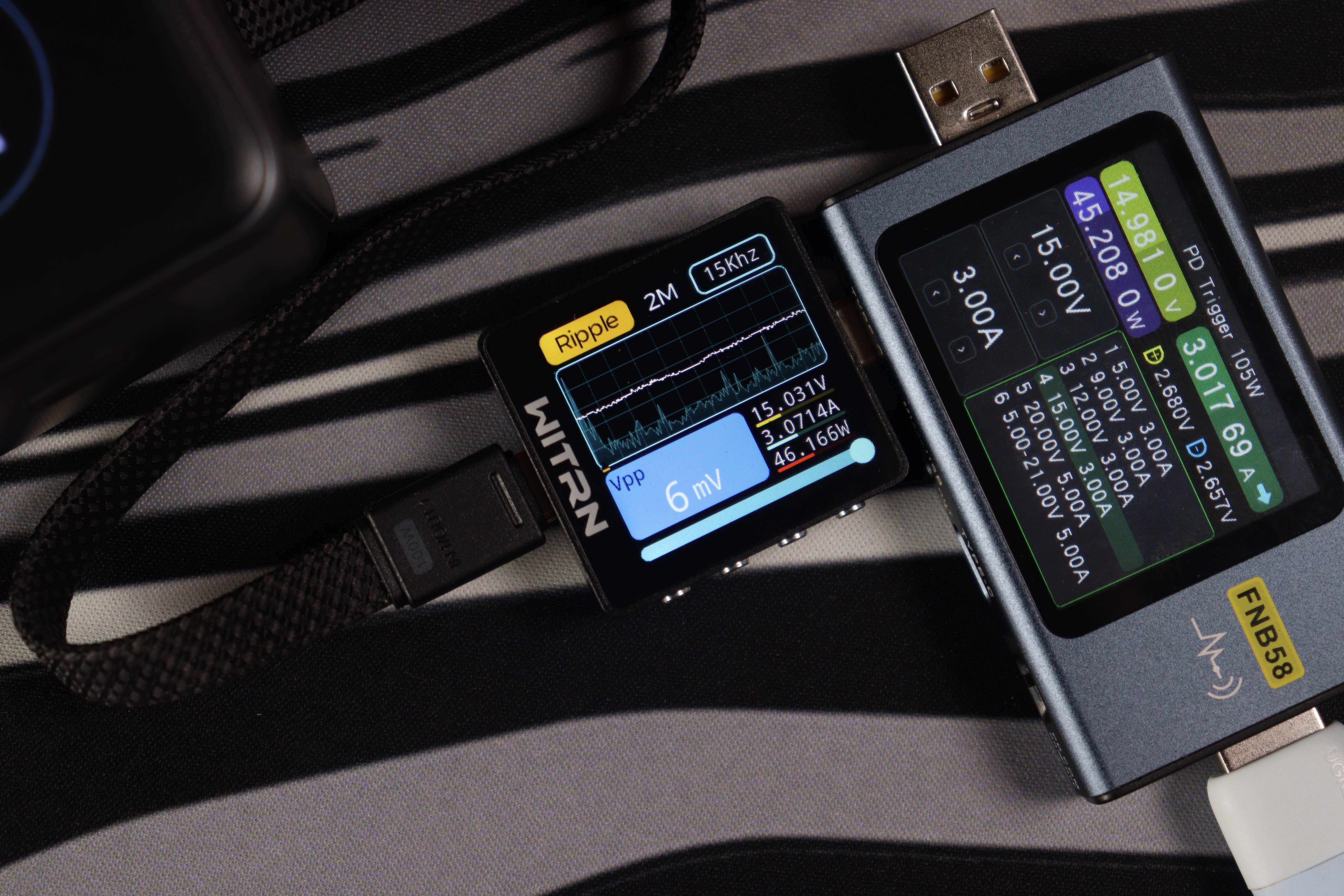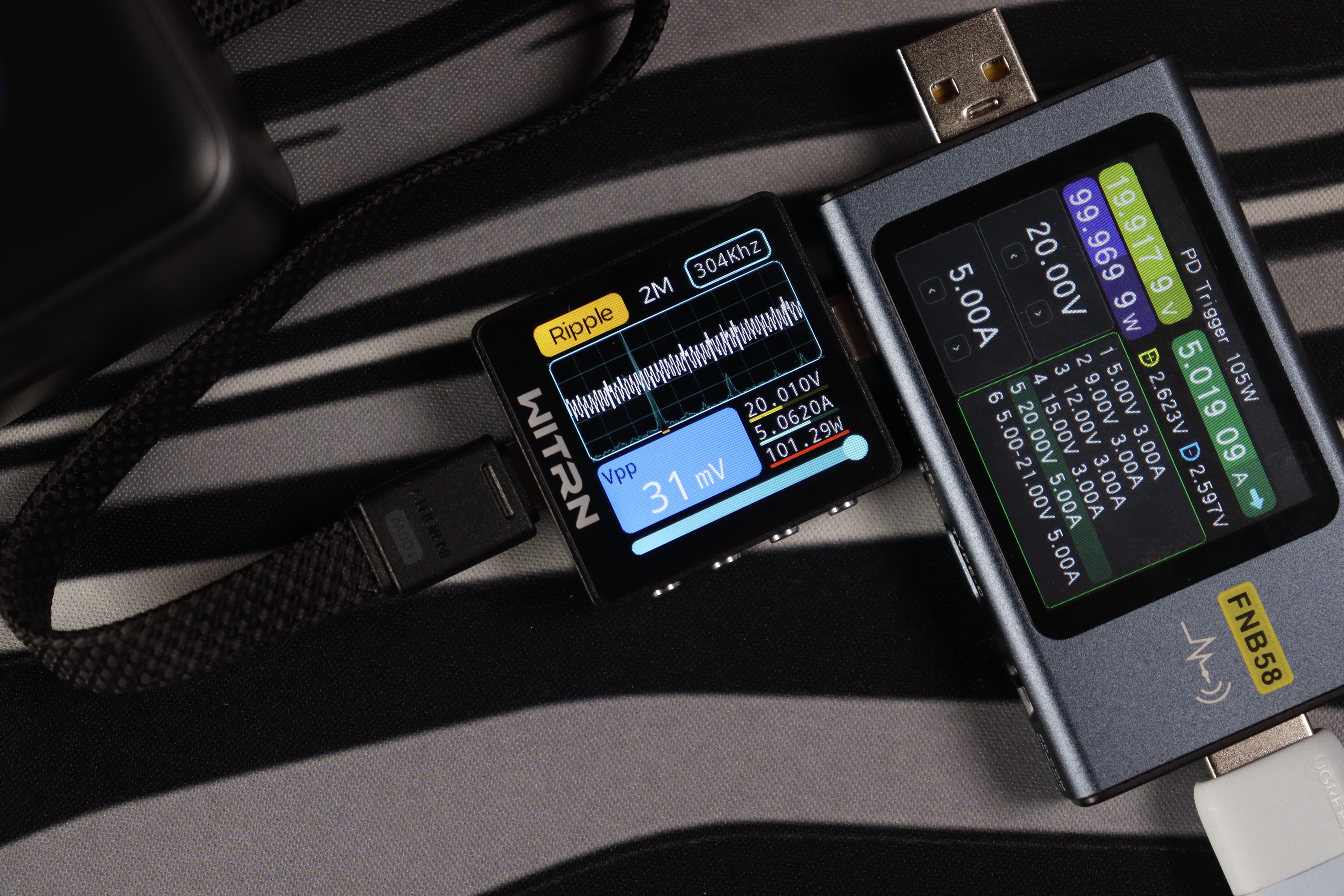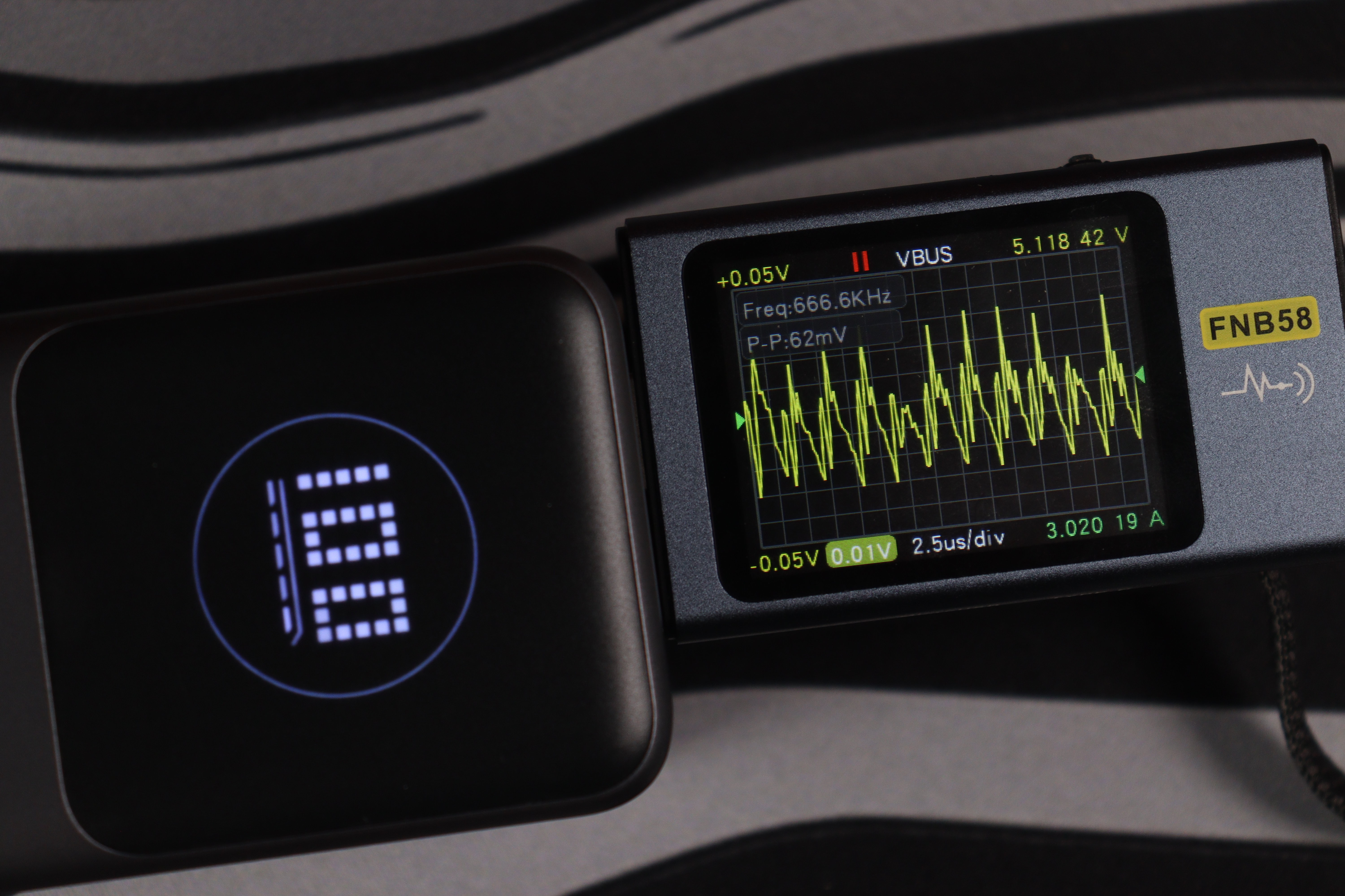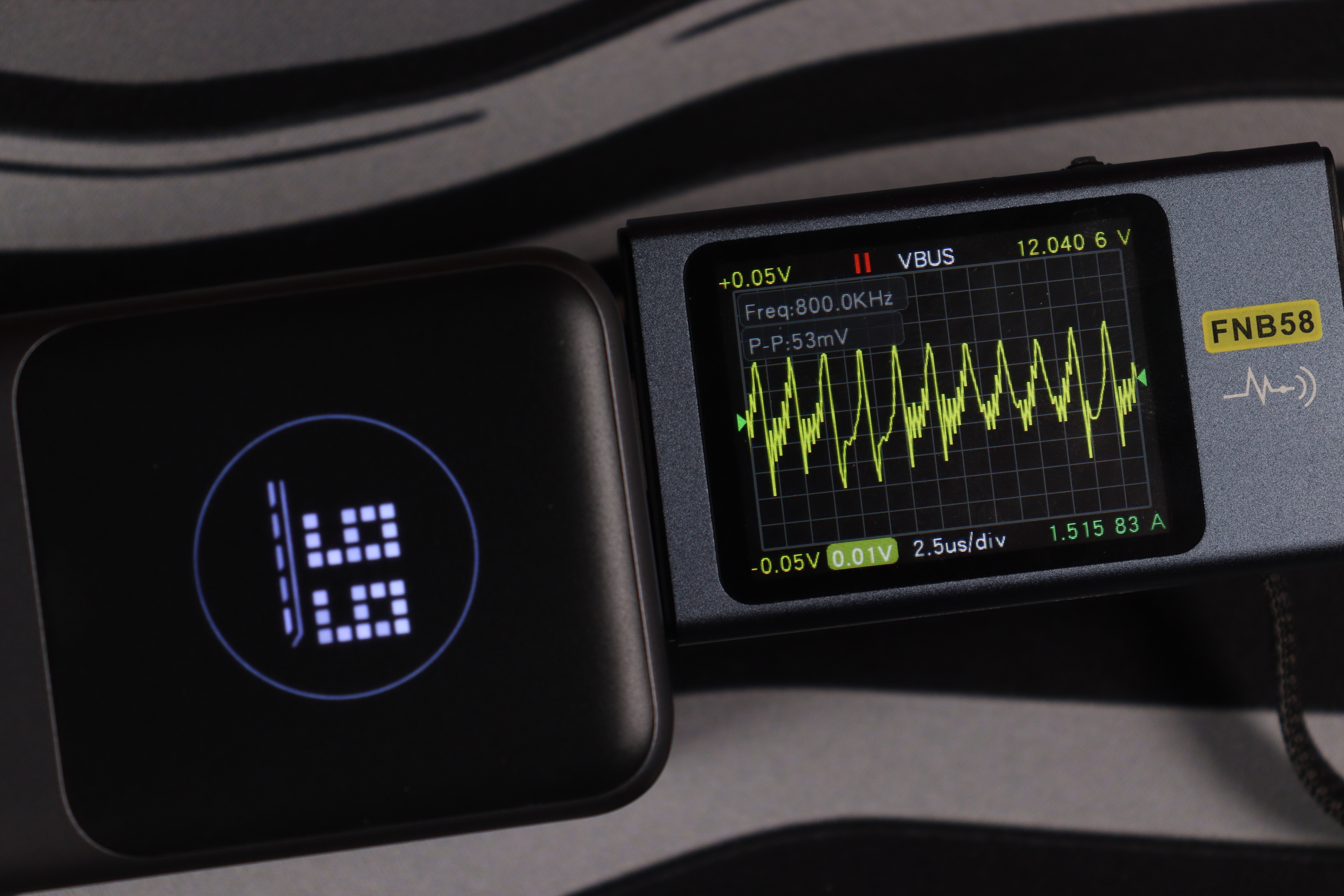Основной разъём и показания через встроенный кабель показали идентичные (отличные) результаты во всех тестовых сценариях. Качество энергоснабжения остаётся неизменным в диапазоне от 5 до 20 вольт. Из примечательного — в данном случае отсутствуют пульсации более 200мВ на максимальном режиме работы, как это было с PB725.
