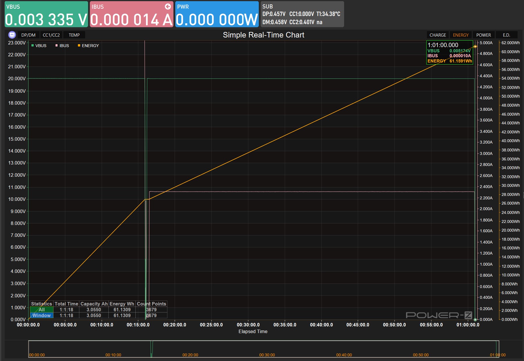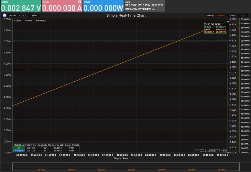 Определение реальной ёмкости производилось при стандартизированной нагрузке 3А/5В на протяжении непрерывного цикла разрядки. Результат составил 60.9 ватт-часа за 3часа 54минуты непрерывной работы, что демонстрирует честное соответствие заявленным характеристикам.