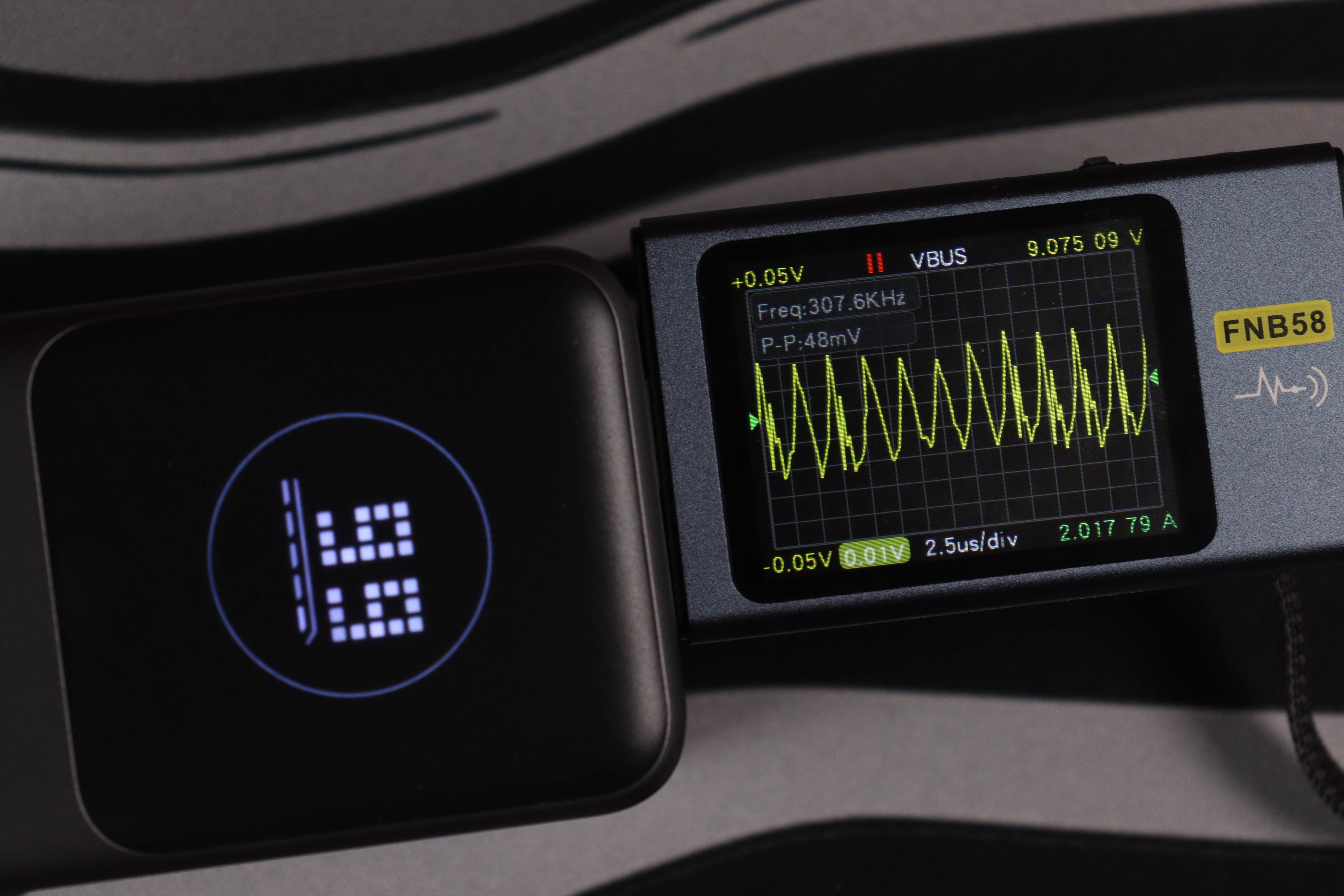 Проверка функционирования в режиме 5В/3А на USВ-A выявила стабильную работу с пульсациями, не превышающими 62мВ. При переключении на конфигурацию на 9 и 12В наблюдается аналогичная устойчивость параметров без значительных отклонений от номинальных значений.