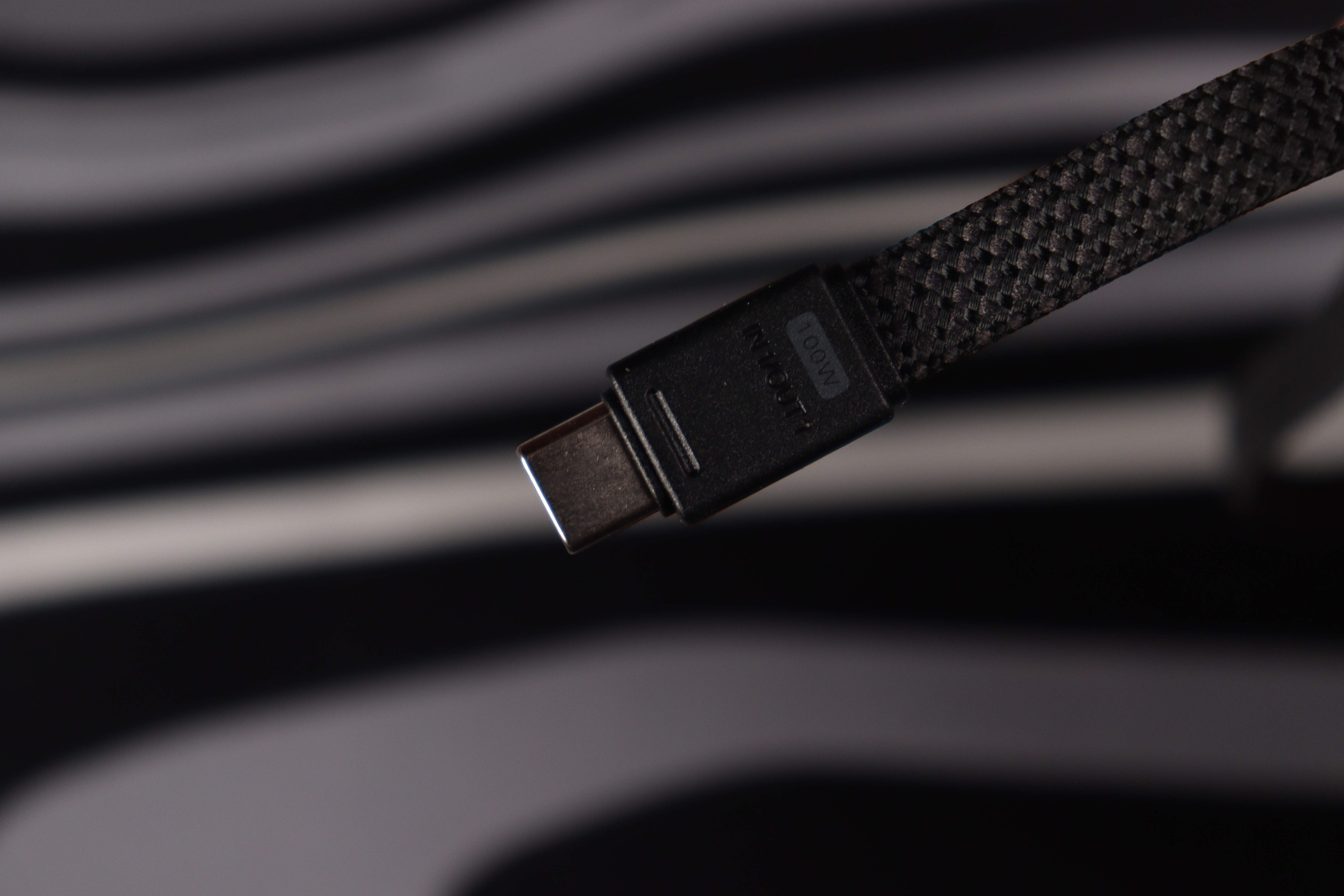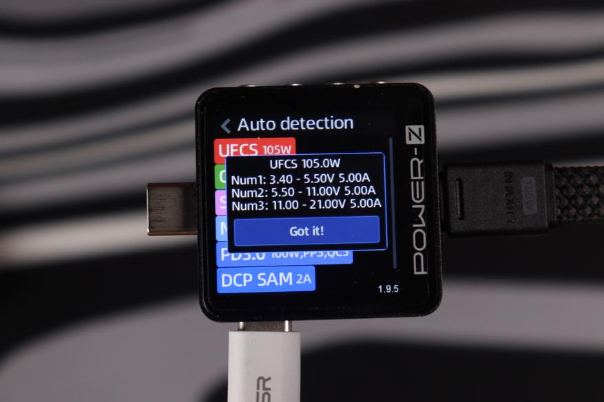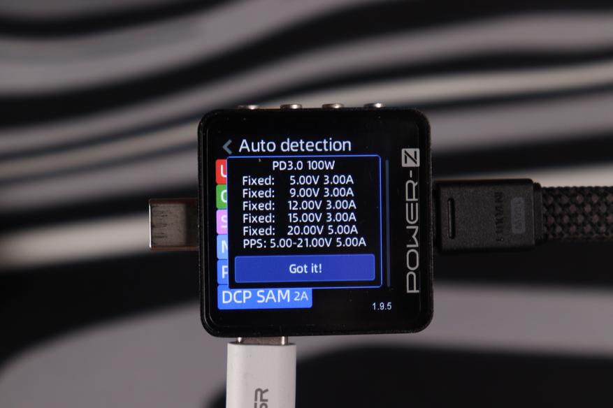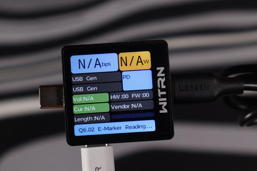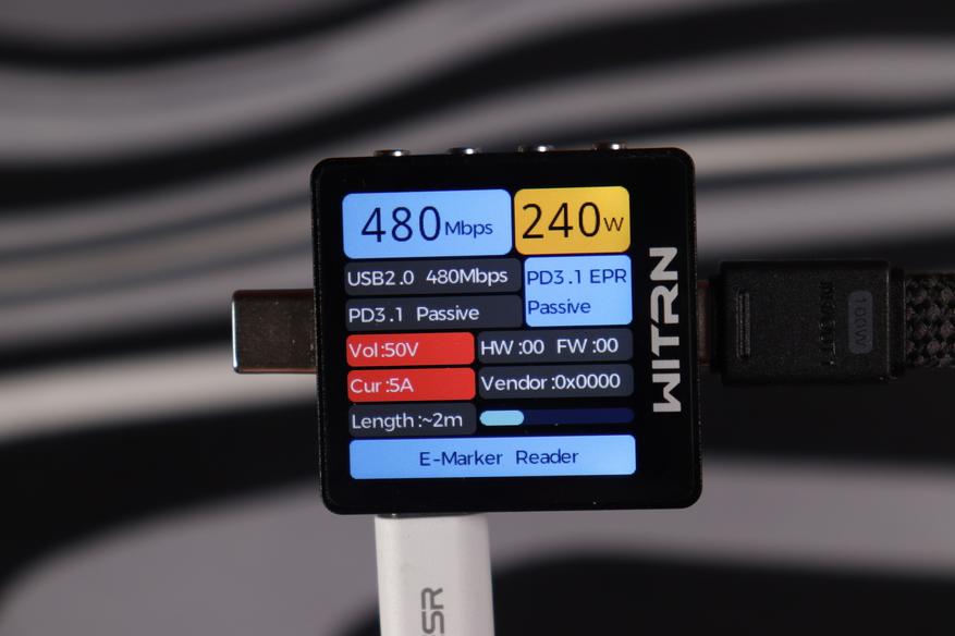 Кабель с комплекта поставки рассчитан на передачу мощности до 60 ватт, поскольку отсутствует встроенная метка. Встроенный же способен передавать вплоть до 240Вт