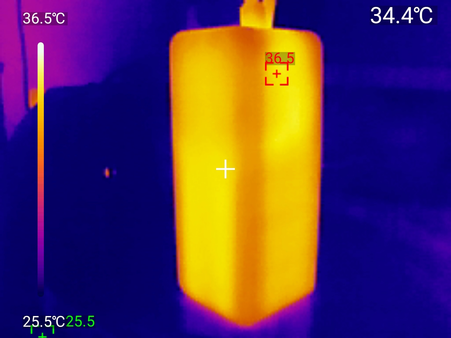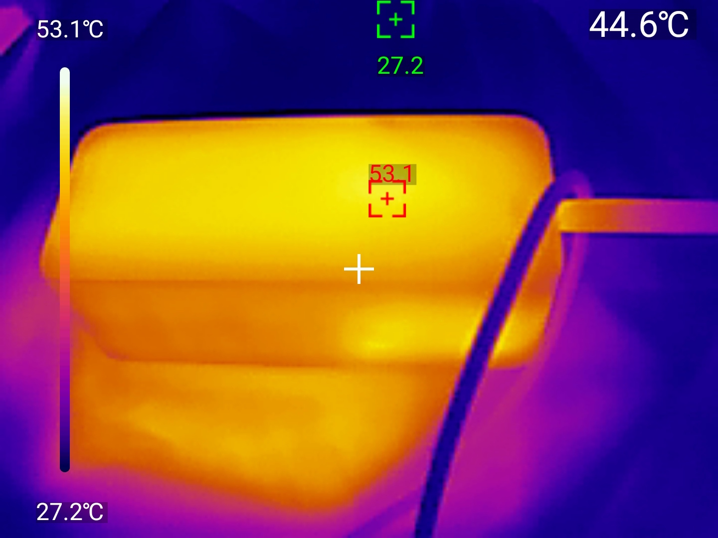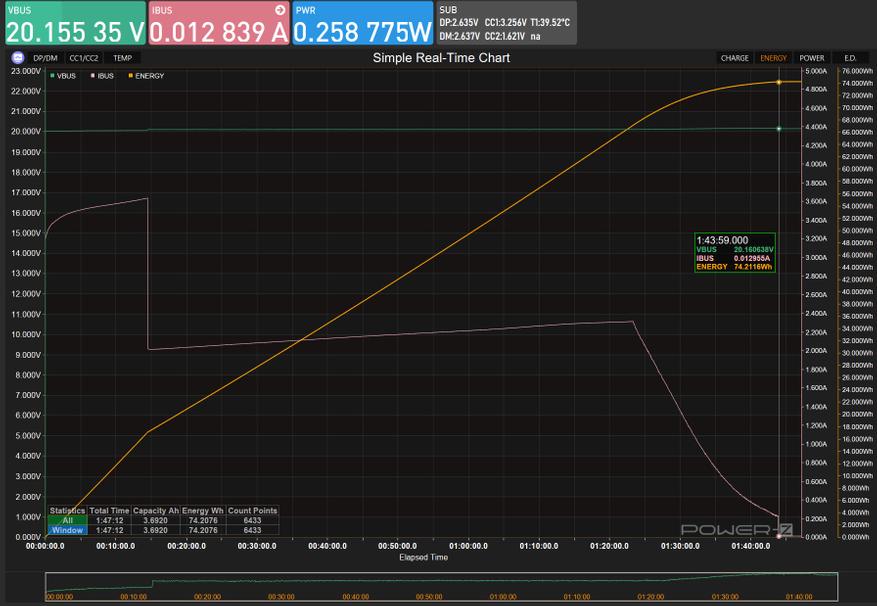 Собственная зарядка — напряжение стабильно поддерживается на уровне 20В, кратковременными пиками до 73Вт в начальной фазе, после чего ток резко снижается до 2А. Общее время восполнения составляет 104минуты при поглощённой энергии 74.21ватт-часа. Нагрев же зафиксирован на уровне 39 градусов тепловизором UNI-T UТI260M.