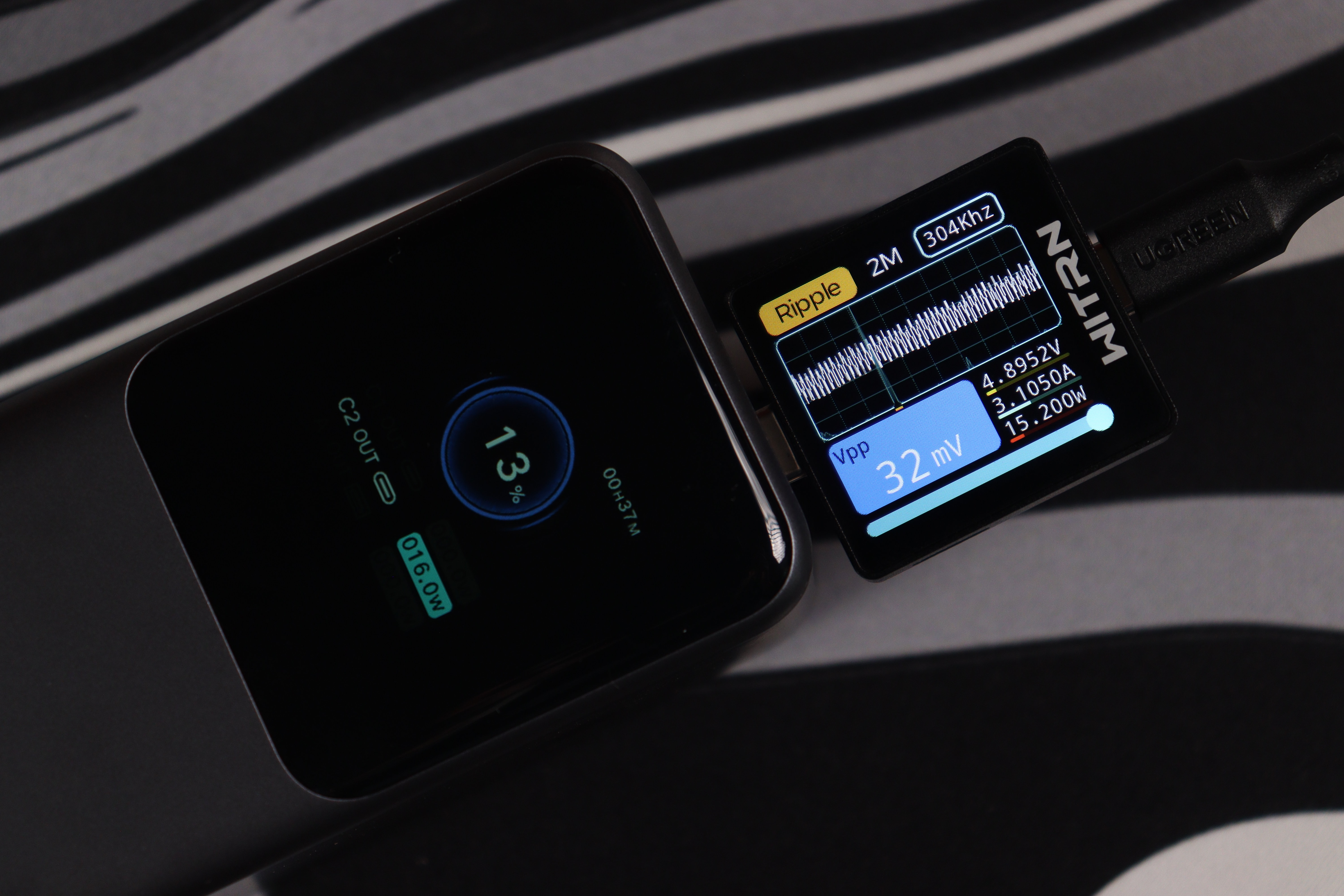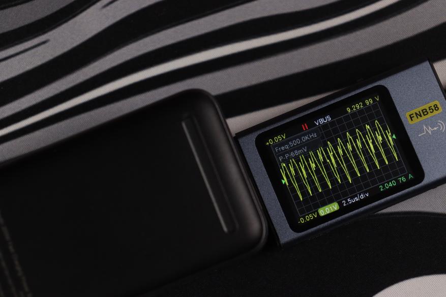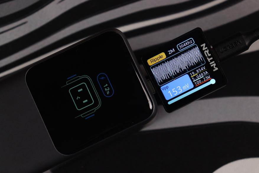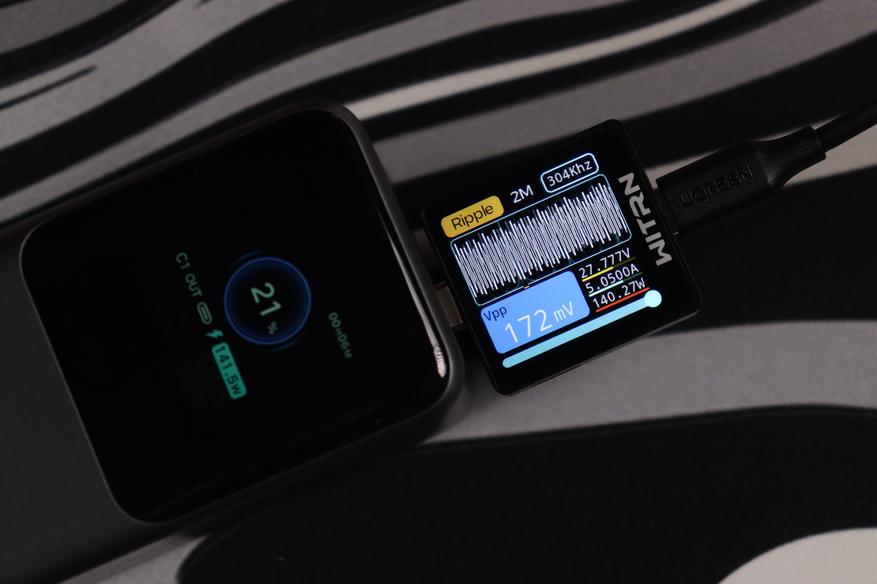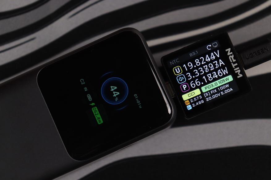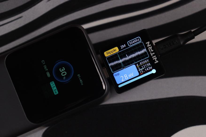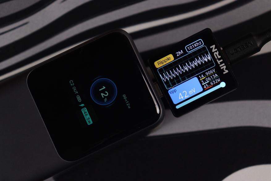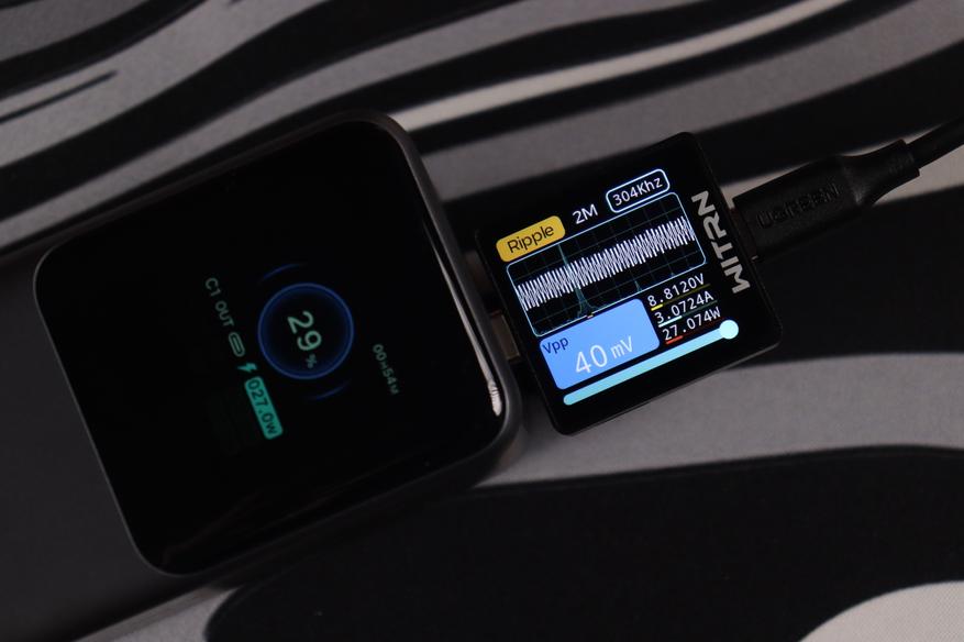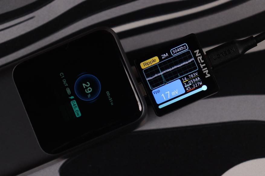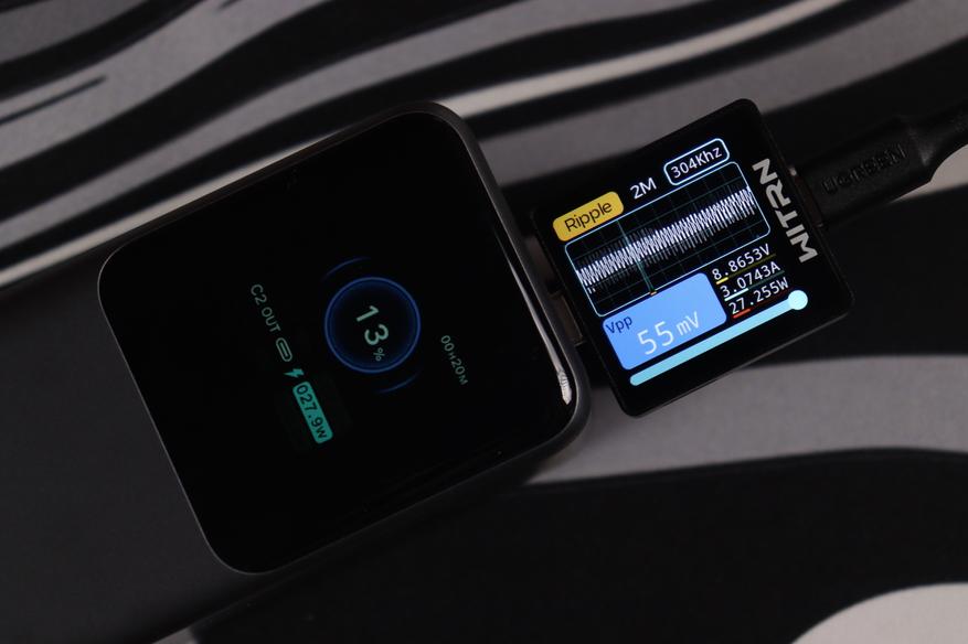 USB-C разъемы показали сопоставимые результаты во всех протестированных конфигурациях. Качество электропитания (напряжение, пульсации) остаются стабильным даже при максимальных нагрузках, а встроенные системы безопасности функционируют без нареканий. Показания на дисплее и тестере WITRN K2 очень схожи (отклонение менее 1 Вт), что свидетельствует о высокой точности измерительных элементов внешнего аккумулятора