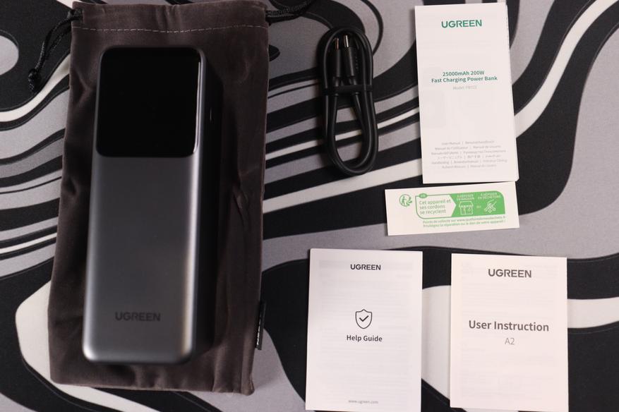 Внутри находится сам аккумулятор, кабель USB-C-USB-C длиной 20 см, мягкий чехол для транспортировки и документация.