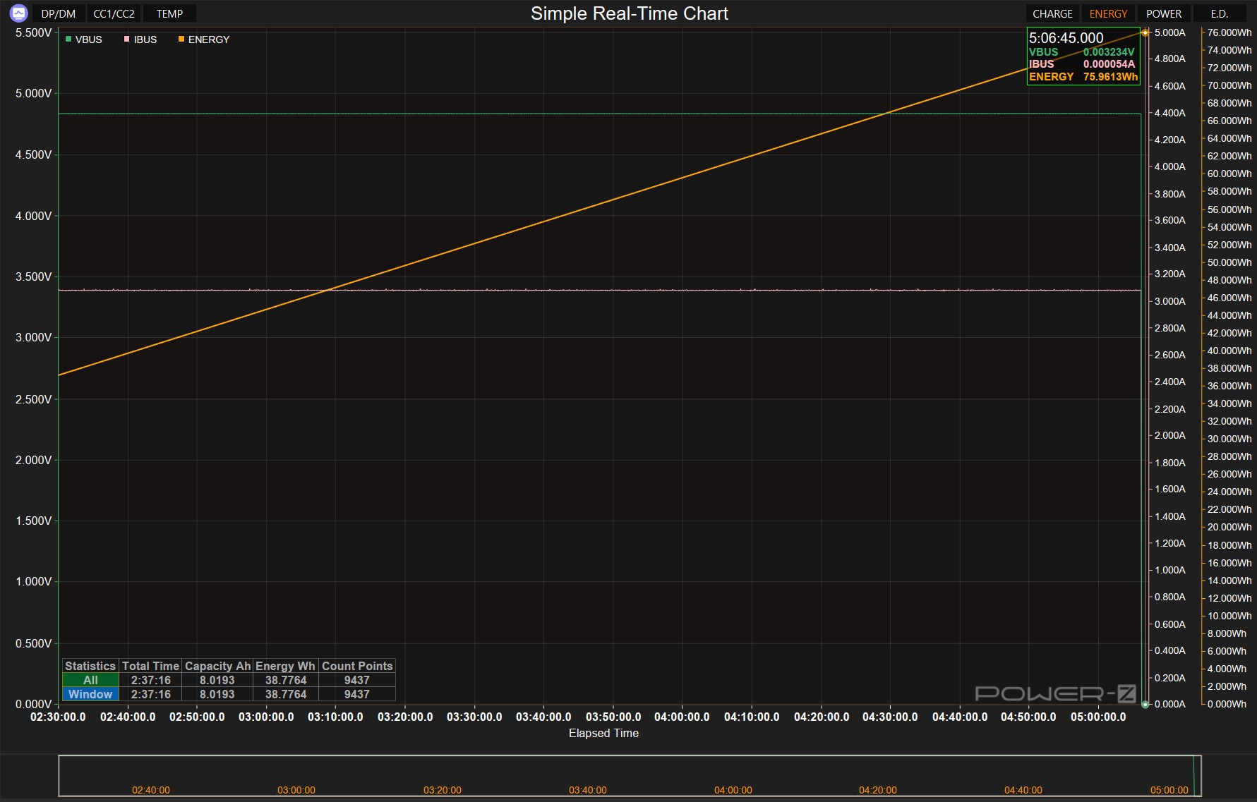 График (полученный с помощью тестера Power-Z KM003C) разряда показывает типичную для качественных литий-ионных аккумуляторов разрядную характеристику с длительным плато напряжения и резким спадом в конце цикла (полный разряд аккумулятора). Линейное накопление выданной энергии, что подтверждает стабильность выходных параметров, что свидетельствует о корректной работе преобразователя и эффективном управлении разрядом аккумуляторных элементов. Нагрев корпуса оставался незначительным, незначительно теплее температуры в комнате