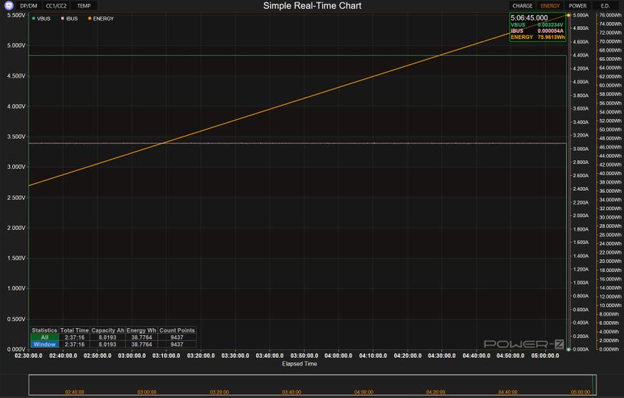 Тестирование началось с измерения ёмкости в режиме 5В/3А, который позволяет объективно оценить сколько аккумулятор способен выдать при зарядке простых устройств. Испытания показали стабильную работу устройства и полное соответствие заявленным характеристикам