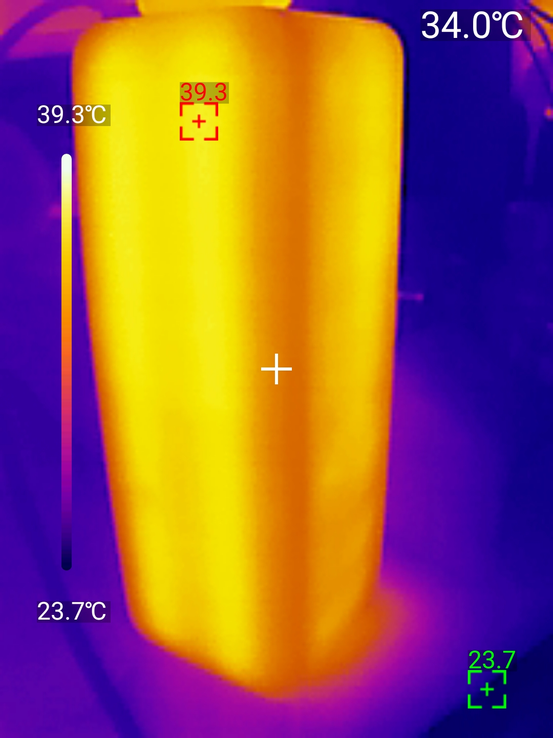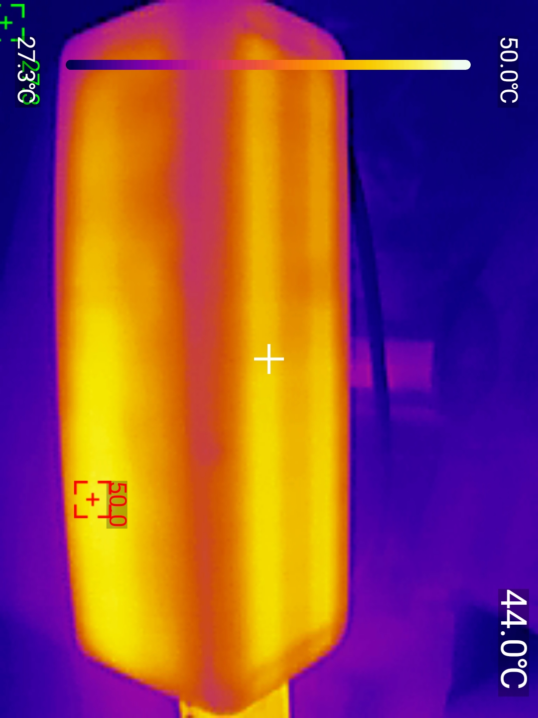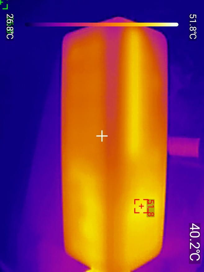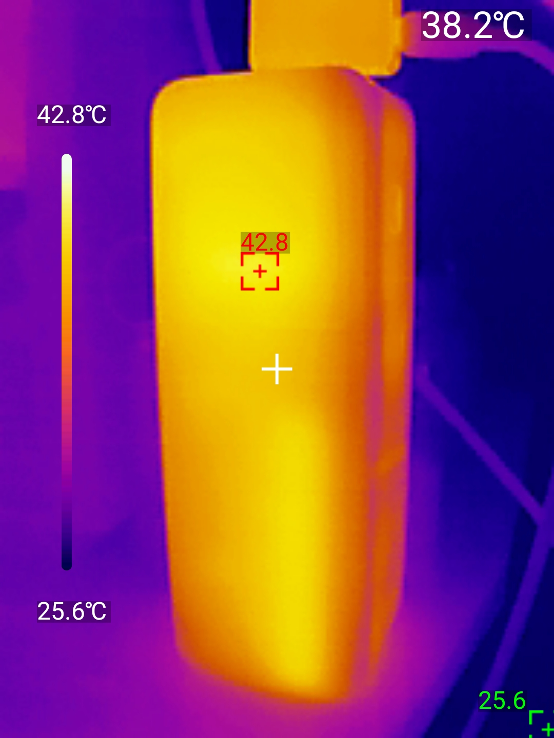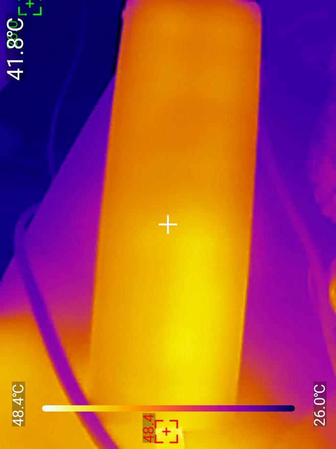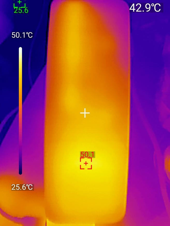 Нагрев при зарядке оказался более ощутимым — 42.8℃, тепловые фотографии были получены тепловизором UNI-T UTI 260M.