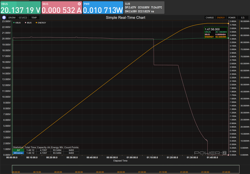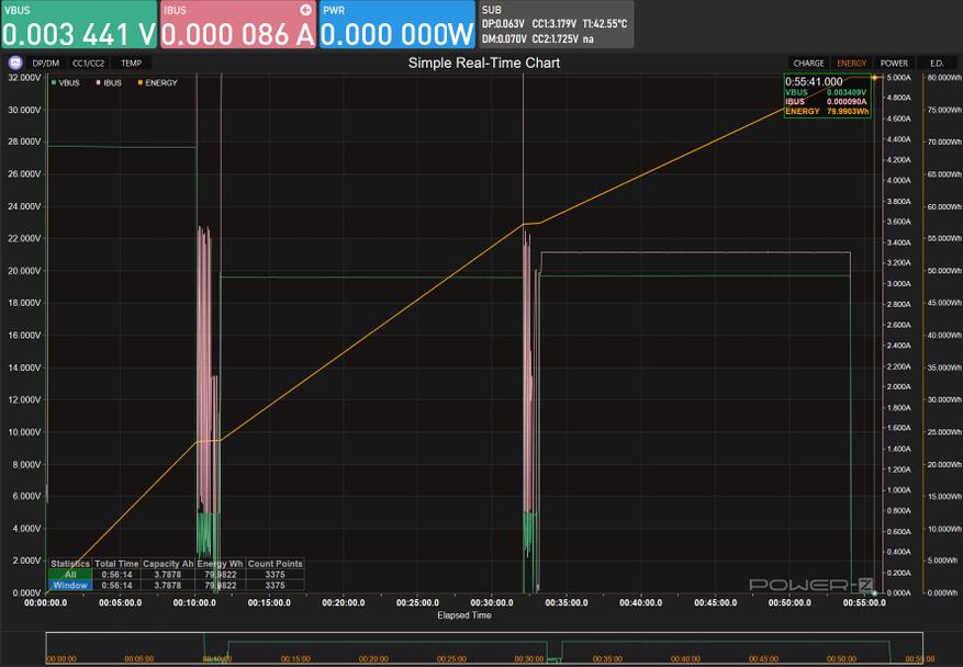 К сожалению, данное зарядное устройство ограничено зарядом в 65 Вт, против 140 у того же Anker 737. Напряжение стабильно держалось на уровне 20В, а ток, по мере заряда, снижался постепенно.