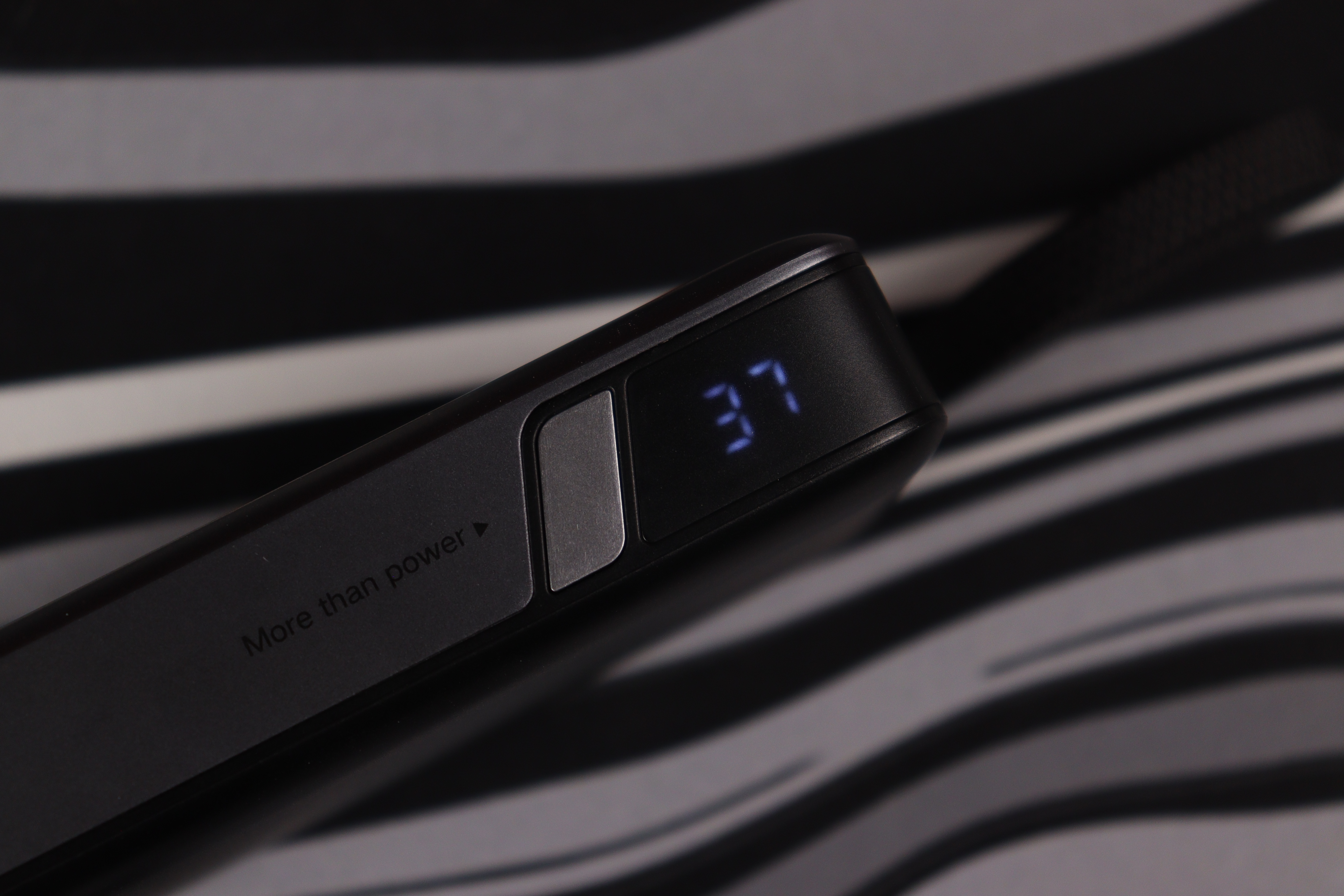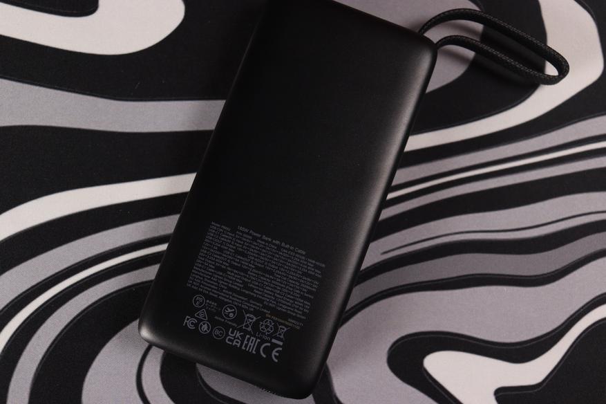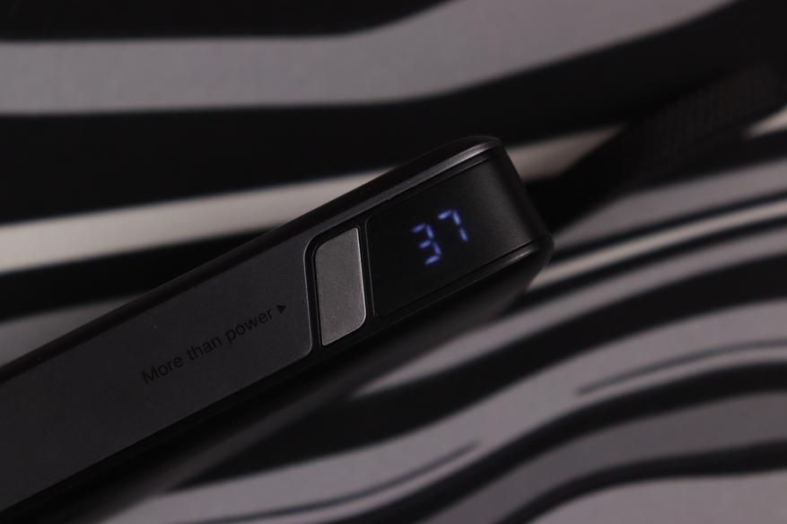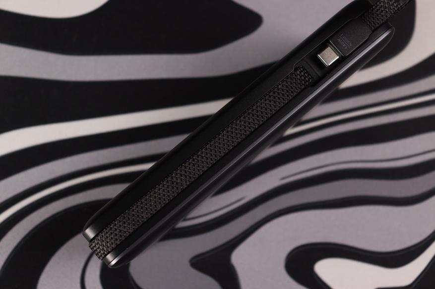 Устройство имеет вытянутую форму прямоугольника с плавно скруглёнными углами, что делает его удобным для размещения в карманах. Корпус выполнен из матового пластика серого цвета с текстурированной поверхностью — она не только приятна на ощупь, но и меньше собирает отпечатки пальцев и мелкие царапины, что сохраняет аккуратный внешний вид даже при активном использовании. На задней стороне нанесены все технические параметры. С правой стороны размещена клавиша для включения LED-индикатора уровня питания и активации режима использования с низкотоковой электроникой.