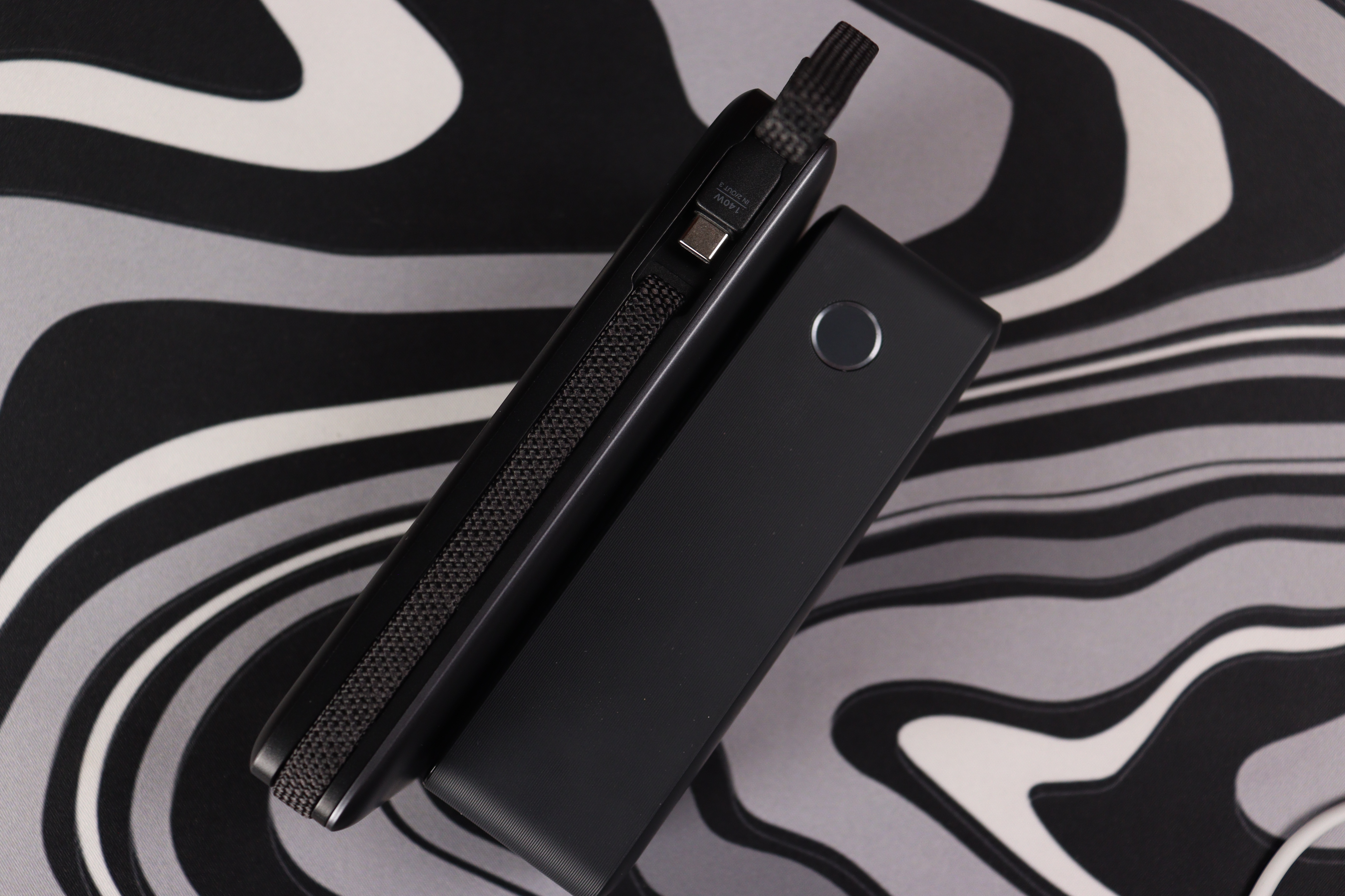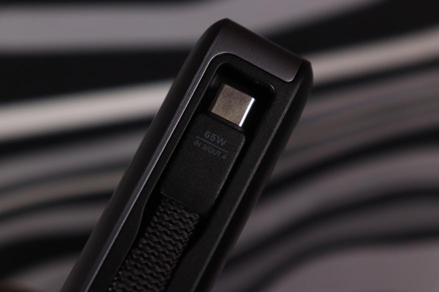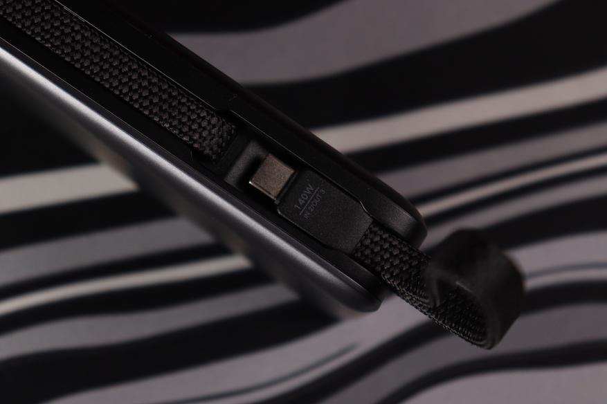 Отдельная особенность — встроенные выдвижные кабели. В корпус встроены USB-С длиной 17.5 см до 140Вт и второй USB-С на 17 сантиметров, способный передавать до 65Вт. Они выдвигаются плавно и убираются обратно в своё ложе, дополнительно подмагничиваясь в местах посадки.