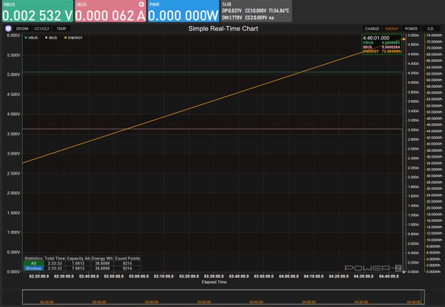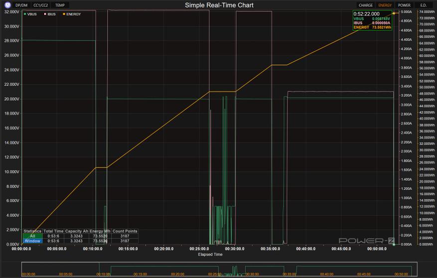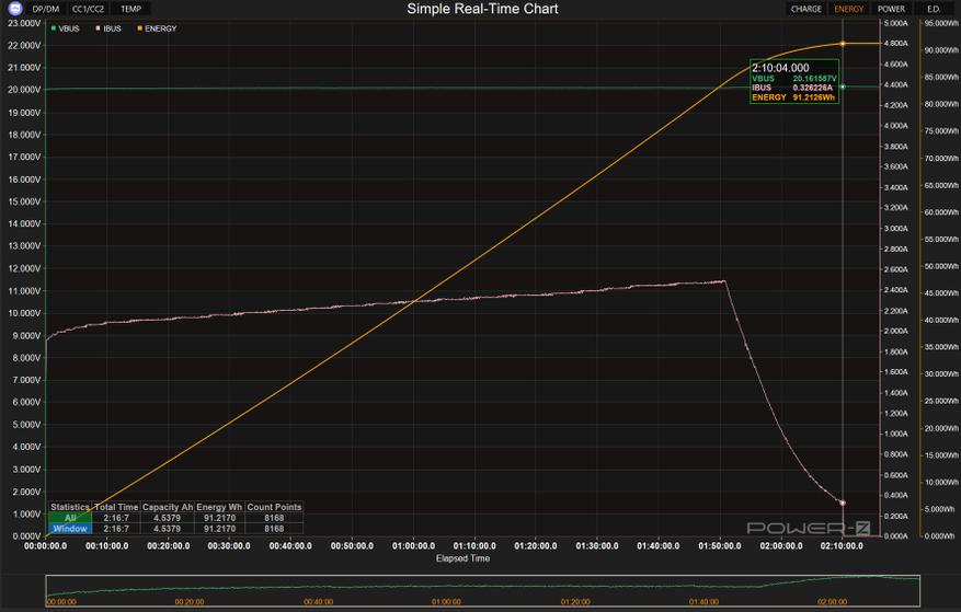 Пpи стандартной нагрузке 5B/3А аккумулятоp проработал 4 часа 46 минут, передав 72.8 Bтч, что отвечает указанным параметрам с учетом потерь на преобразование. Значения были измерены с помощью Pоwer-Z KM003C