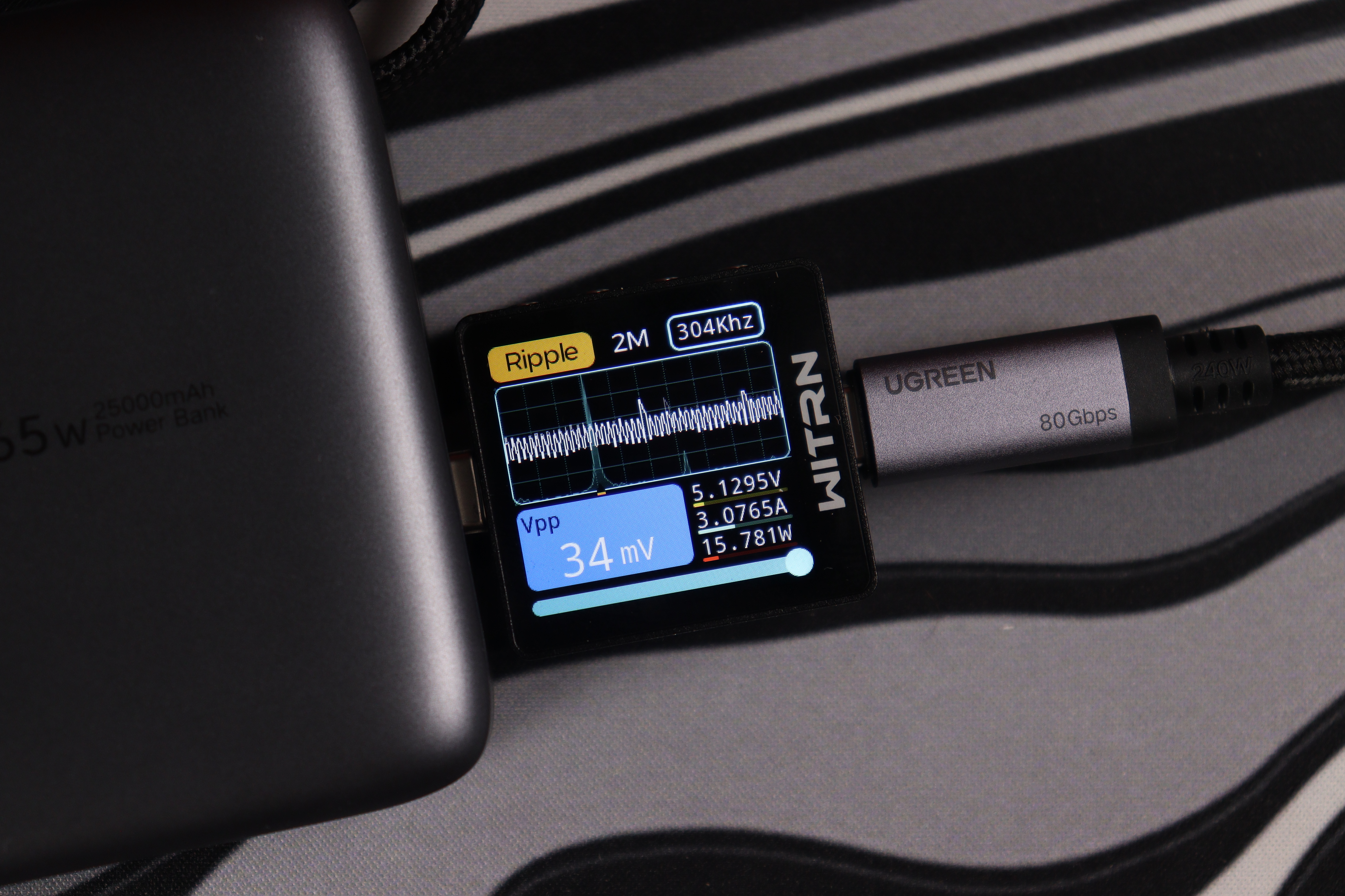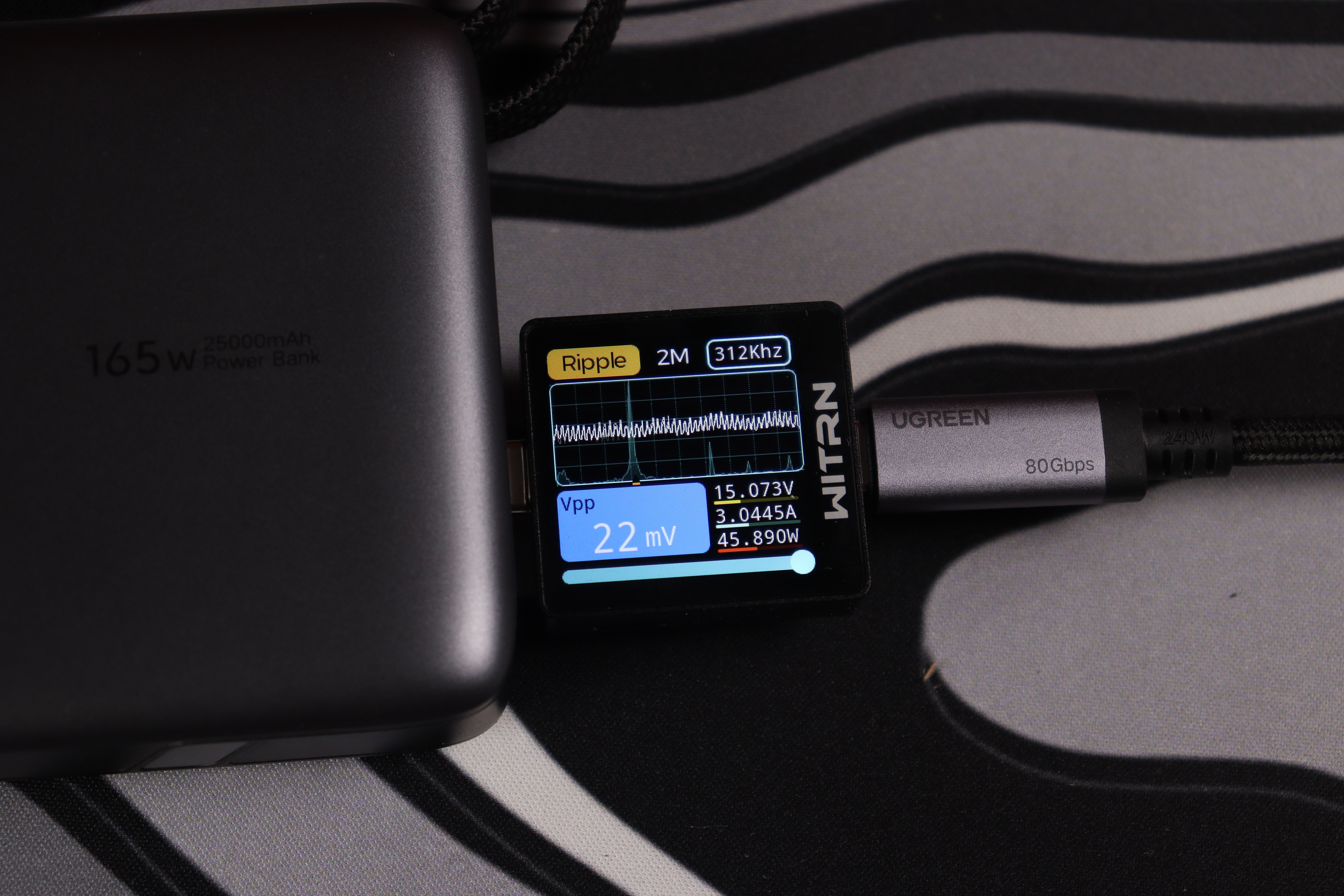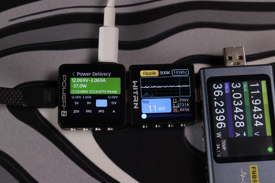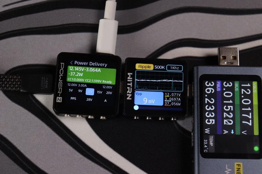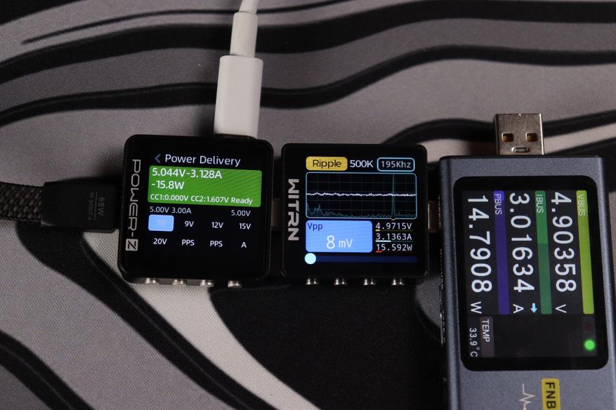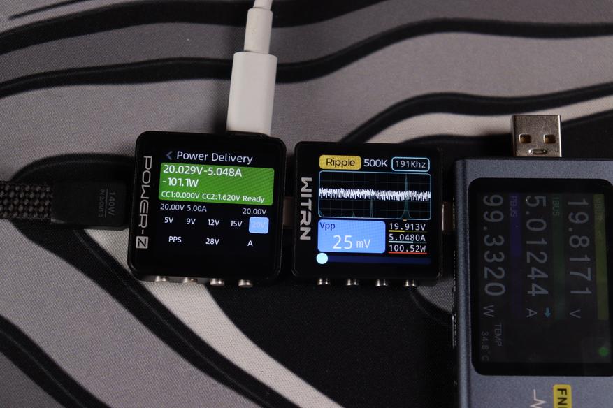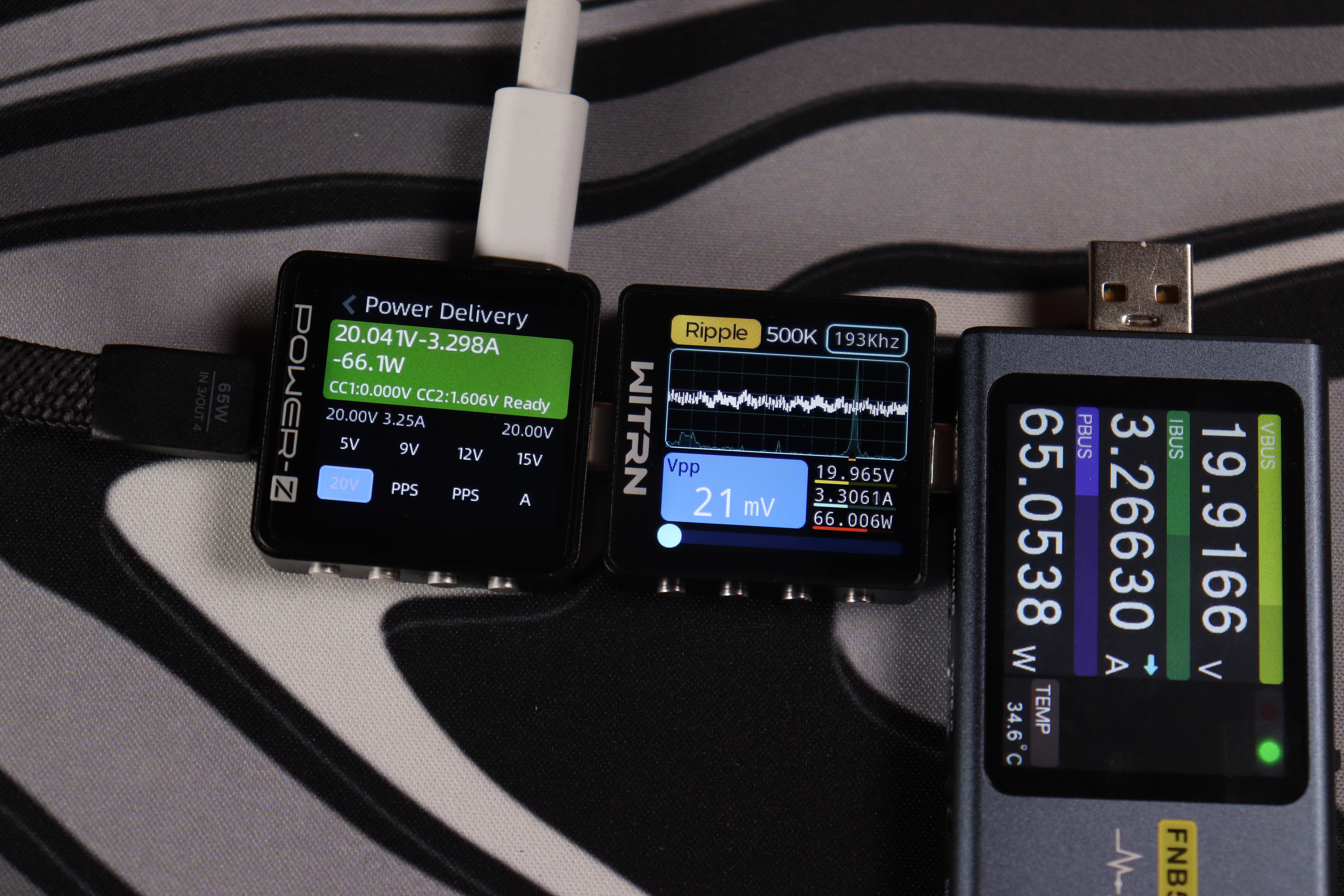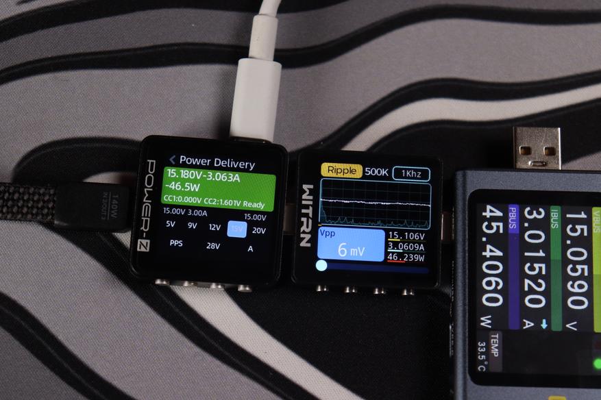 При тестировании второго USB-C кабеля в режиме совместной работы устройство продемонстрировало точное соблюдение параметров: напряжение 20.047V при силе тока 3.298A, что соответствует реальной мощности 66.1W. Качество выходного сигнала превосходное — пульсации напряжения составляют всего 21mV (0.105% от номинала), что обеспечивает стабильную работу подключенных устройств.