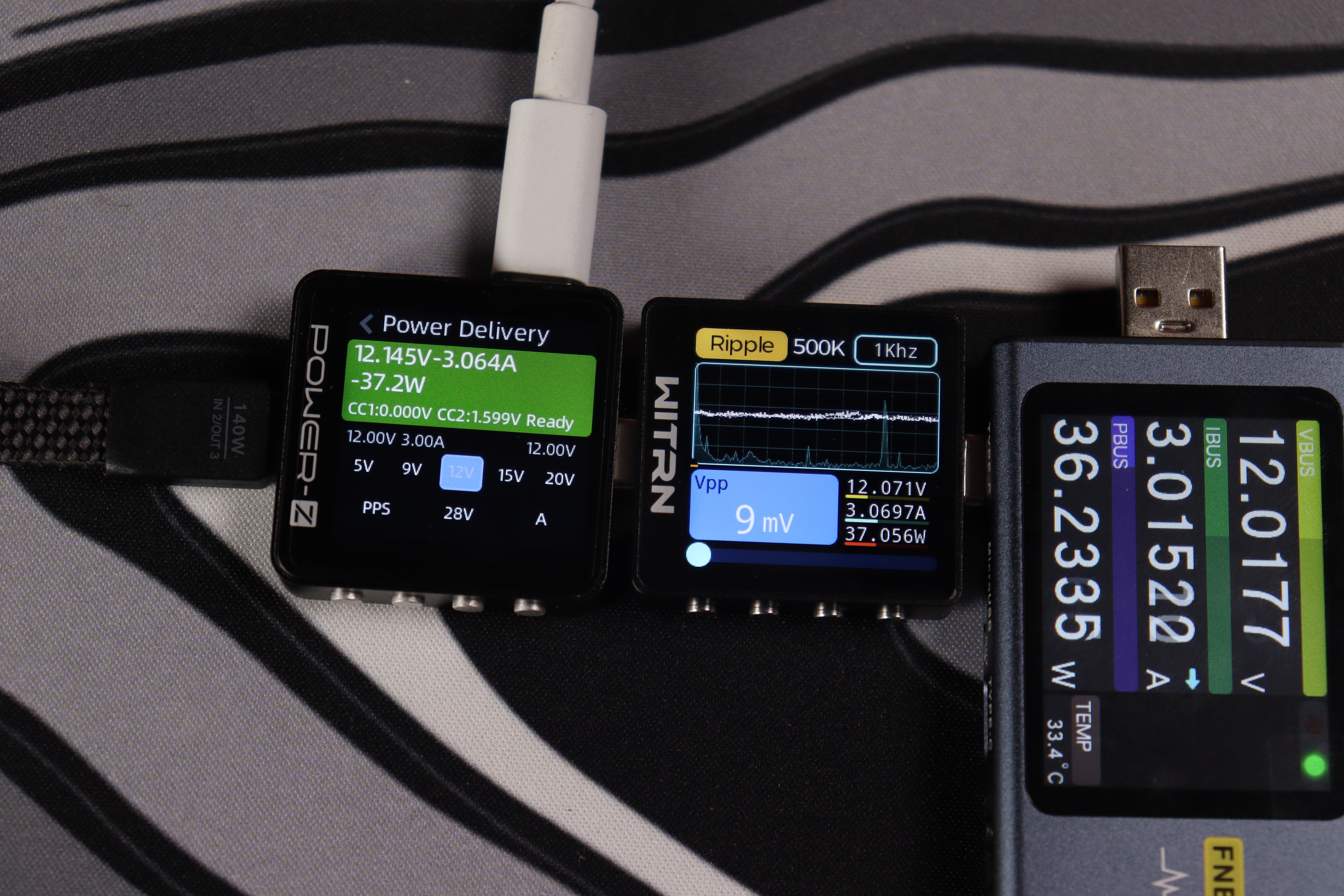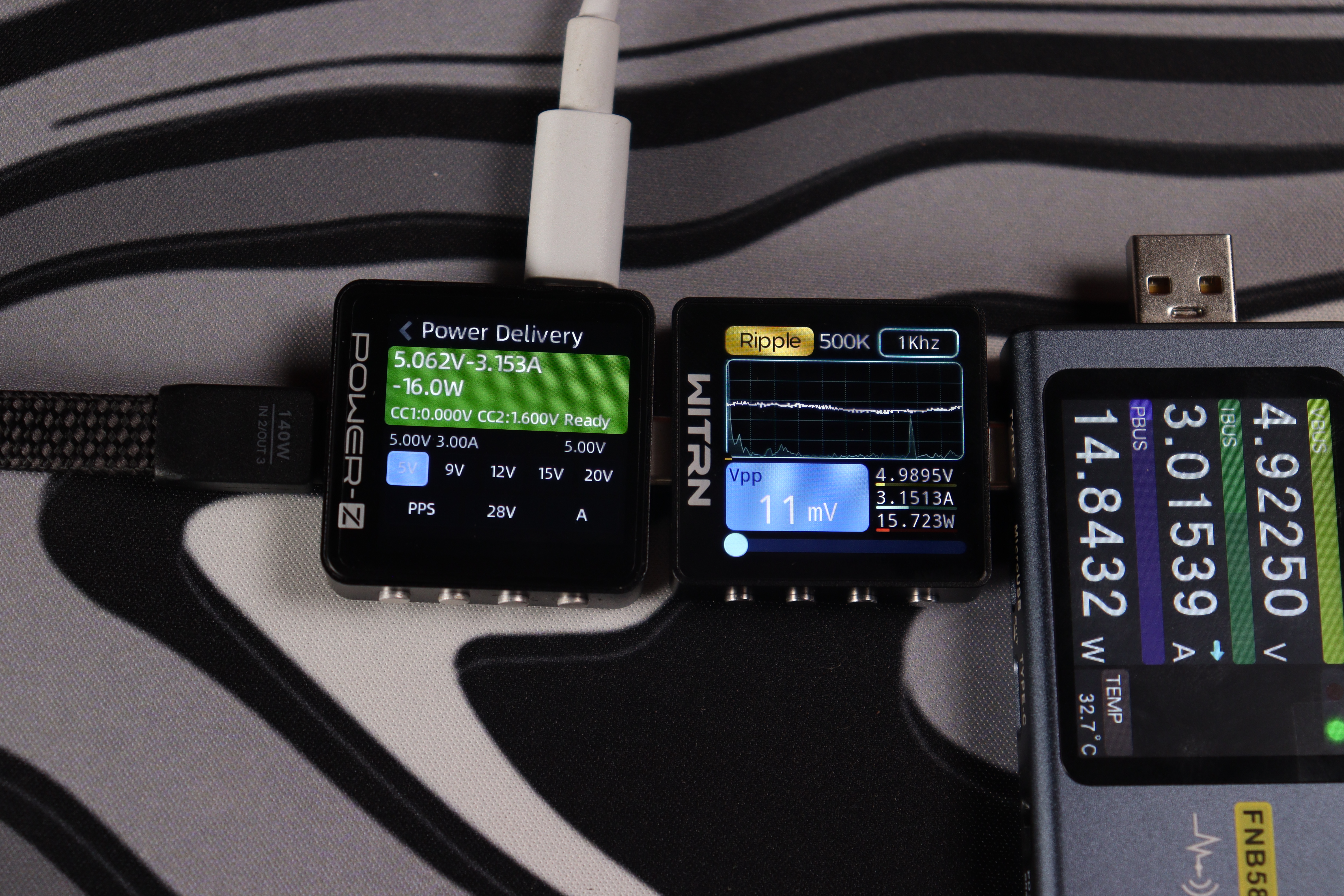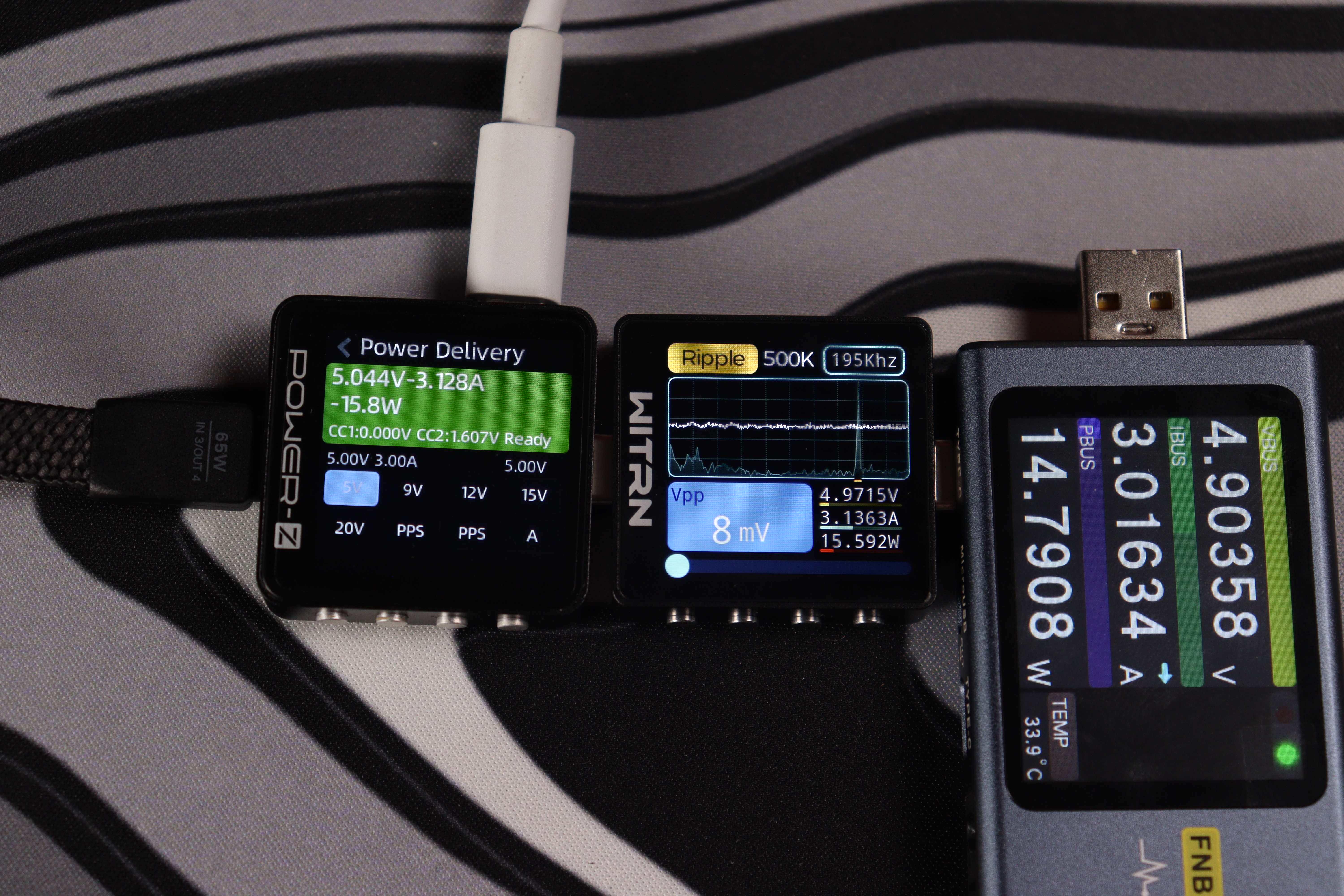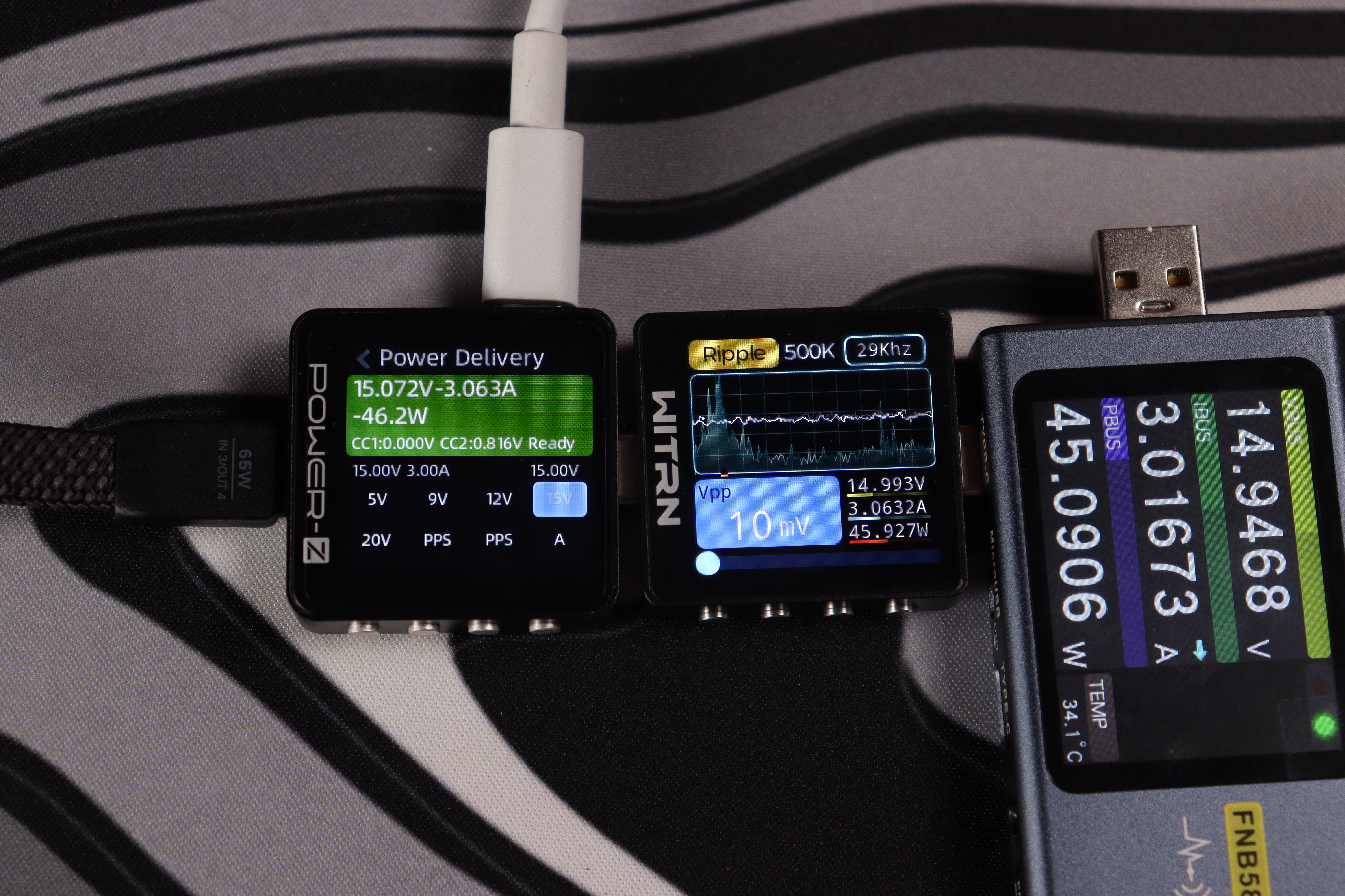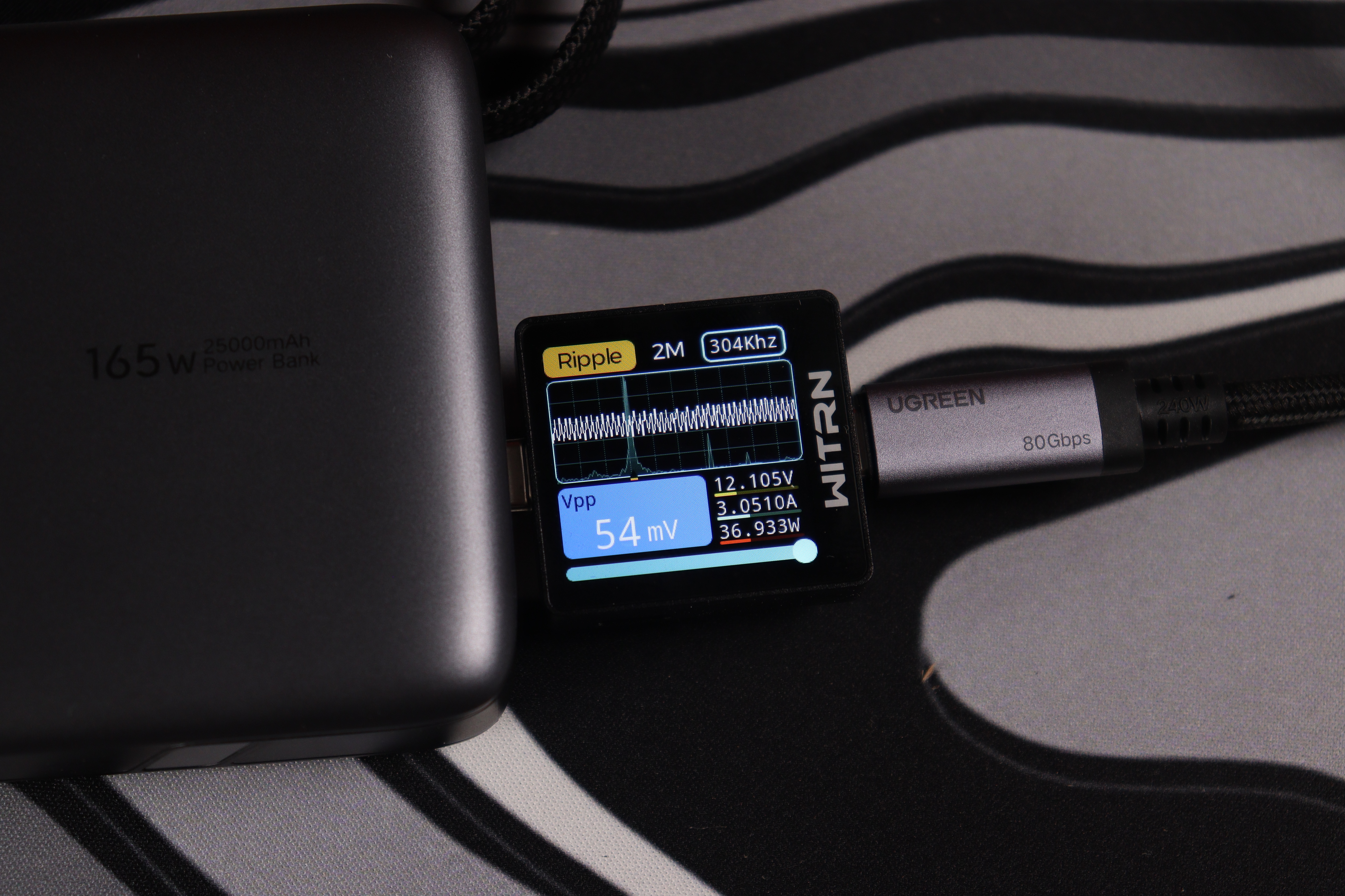 При тестировании второго USB-C кабеля в режиме совместной работы устройство продемонстрировало точное соблюдение параметров: напряжение 20.047V при силе тока 3.298A, что соответствует реальной мощности 66.1W. Качество выходного сигнала превосходное — пульсации напряжения составляют всего 21mV (0.105% от номинала), что обеспечивает стабильную работу подключенных устройств.