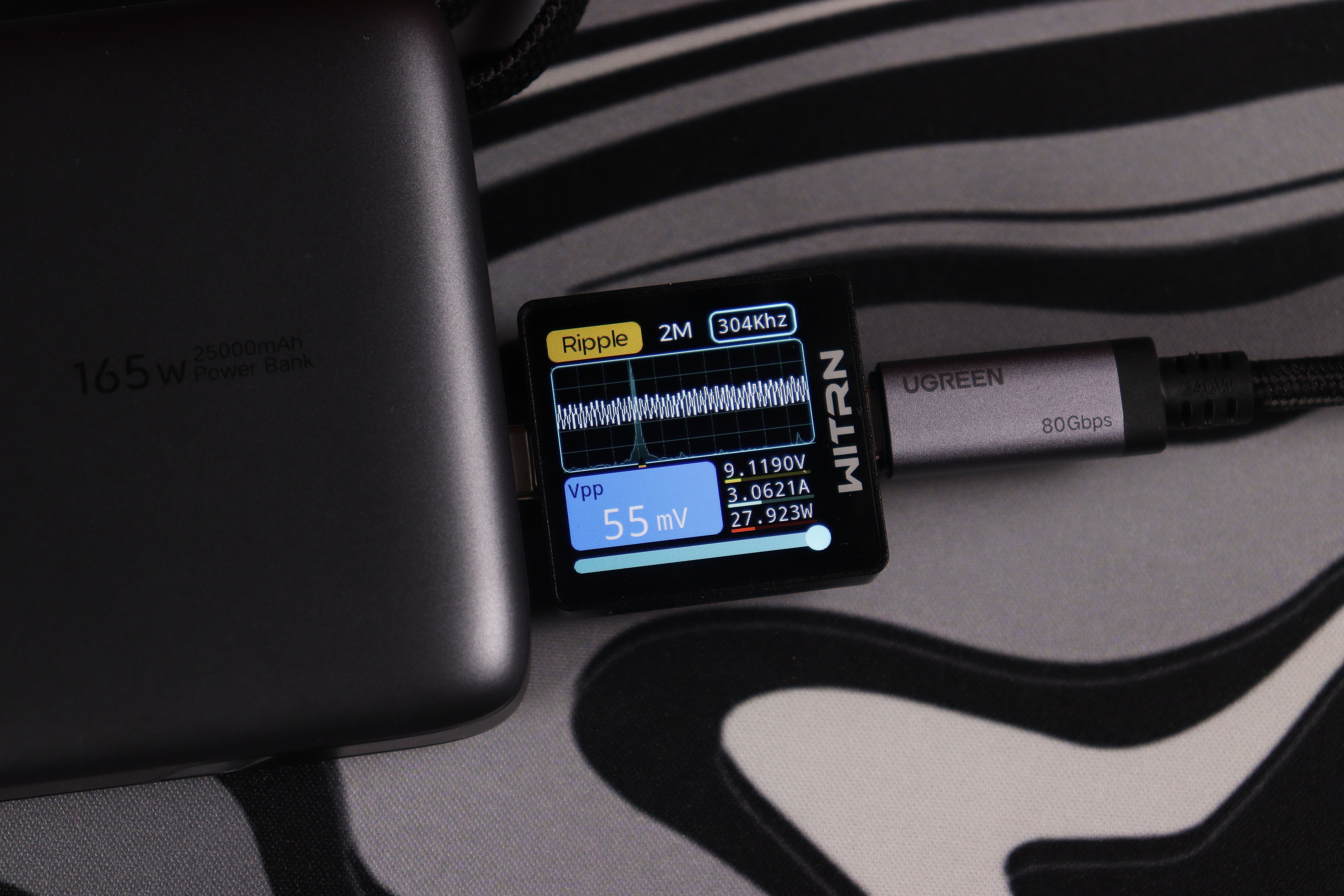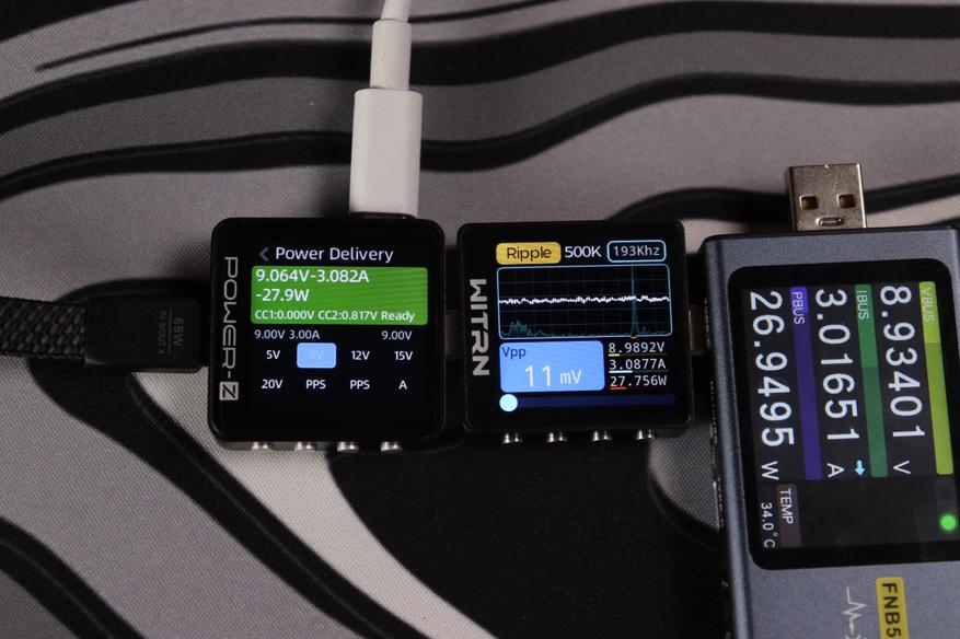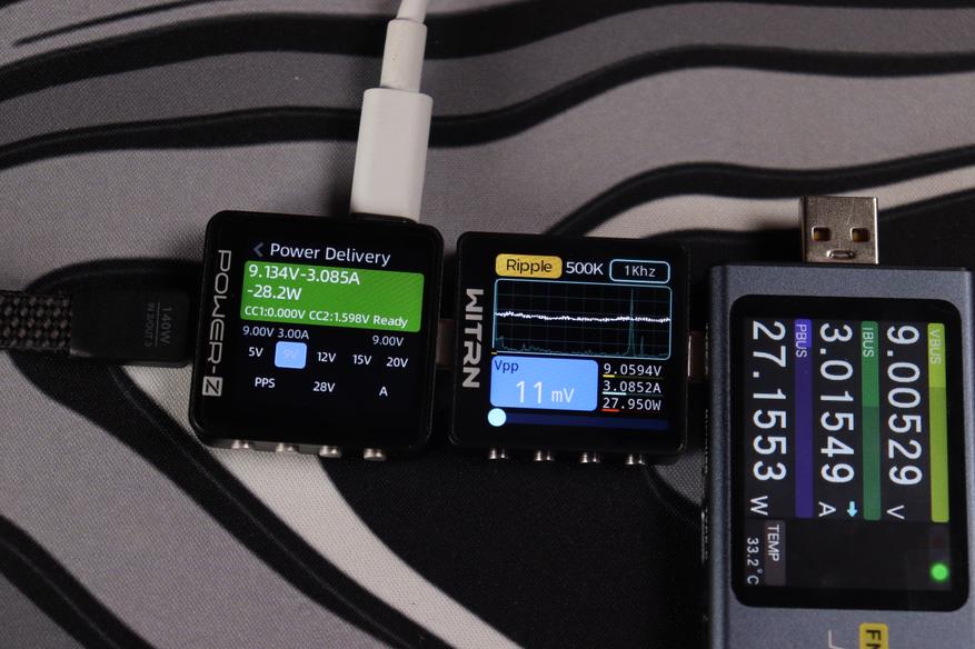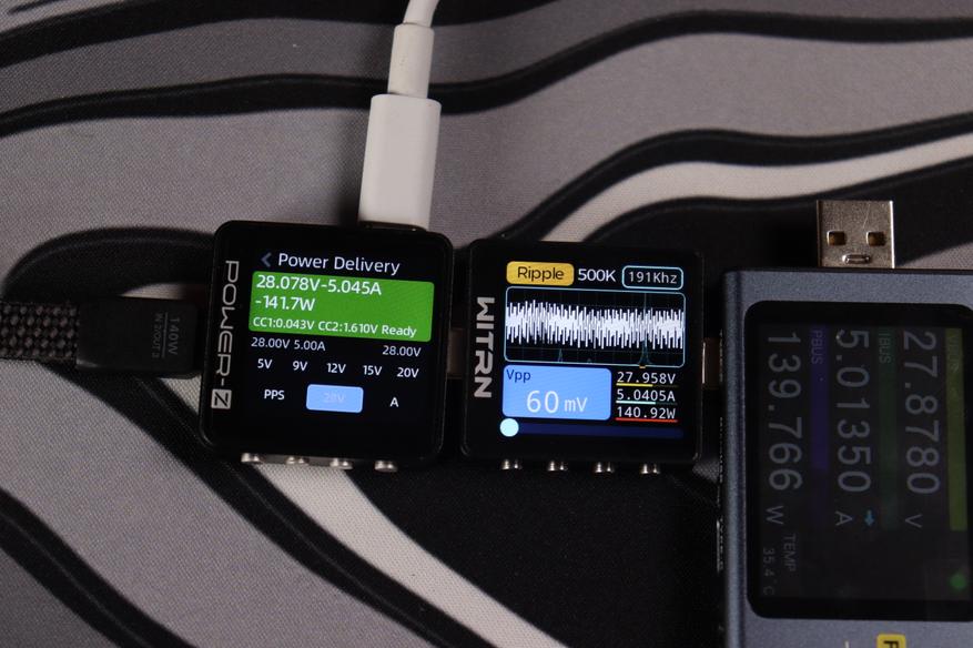 Устройство стабильно поддерживает напряжение 28.078V при силе тока 5.045A, что соответствует реальной мощности 141.7W. Система управления демонстрирует точную регулировку параметров с активацией протокола PPS для оптимизации процесса зарядки. Пульсации напряжения не превышают 60mV, что составляет менее 0.2% от номинального значения — превосходный показатель для устройства такого класса.