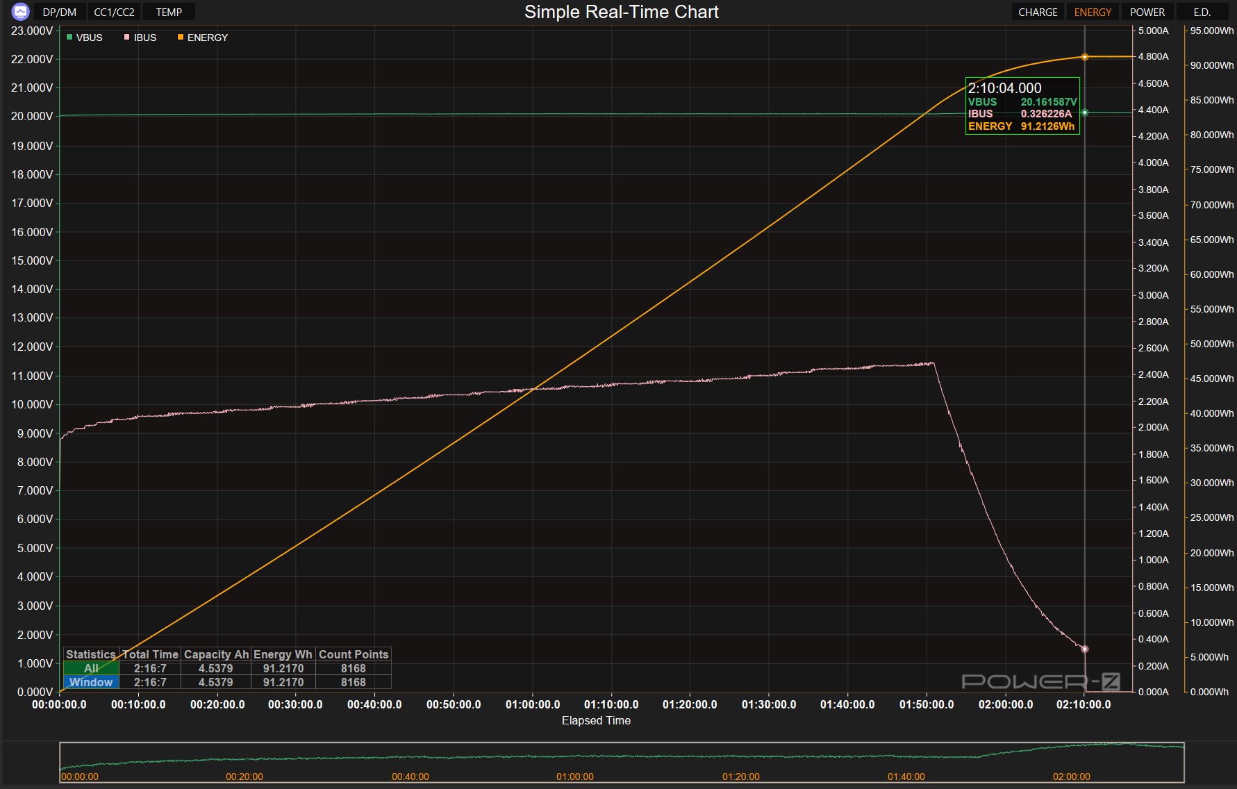Процесс полной зарядки занял 2 часа 10 минут, в течение которых устройство аккумулировало 91.217 Bтч. График демонстрирует классический алгоритм зарядки Li-ion батарей: на первом этапе (0-90 минут) происходит интенсивное накопление энергии при постоянном напряжении (20В) и плавном росте тока. Завершающий этап (90-130 минут) показывает резкое падение тока до минимальных значений при достижении полного заряда, после чего система автоматически прекращает процесс зарядки для предотвращения перезаряда элементов.