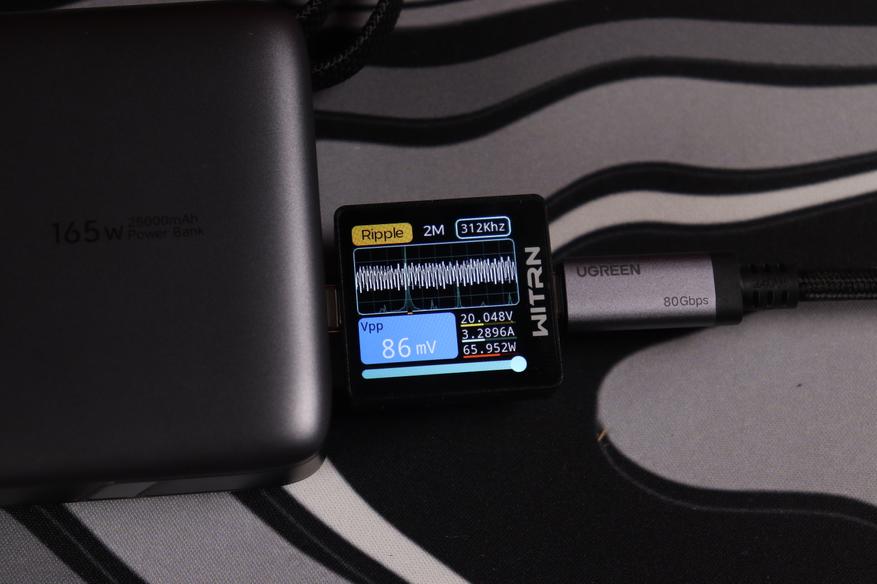 Оценка работы встроенного разъёма на мощности 65W продемонстрировало высокую эффективность: напряжение на выходе составило 20.048V при 3,2896A, что соответствует реальной мощности 65.952W. Качество сигнала остается на высоком уровне с пульсациями всего 86mV, что демонстрирует превосходную фильтрацию высокочастотных помех.