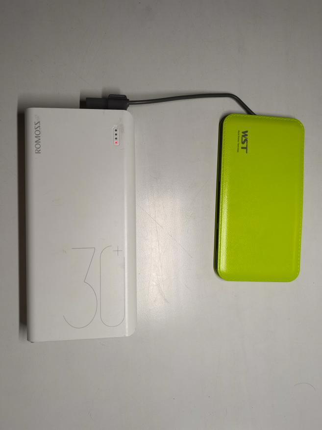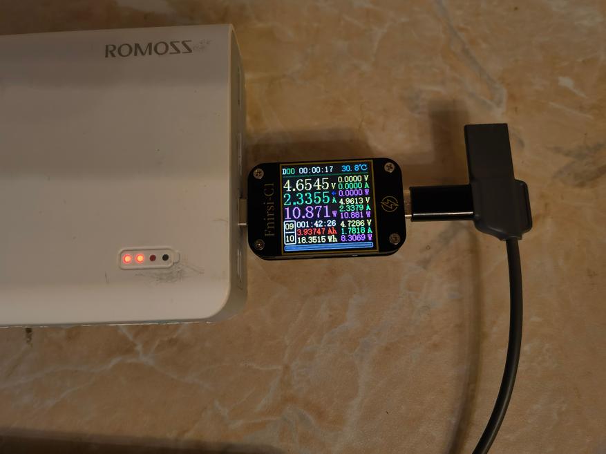 Примеры заряда с использованием обозреваемой модели WST показаны ниже. Если бы у меня был телефон с microUSB, то вместо заряда аккумулятора Romoss Sense 8+ был бы он. Первая фотография приведена для проверки возможности заряда через microUSB.